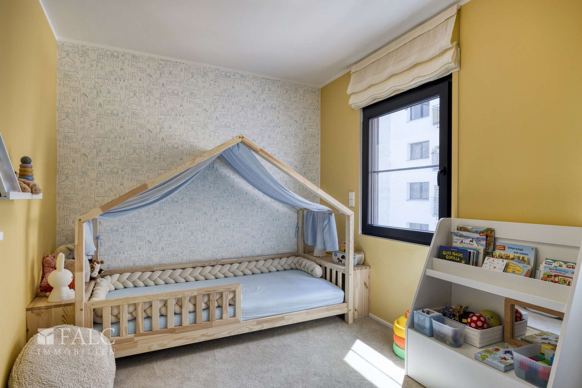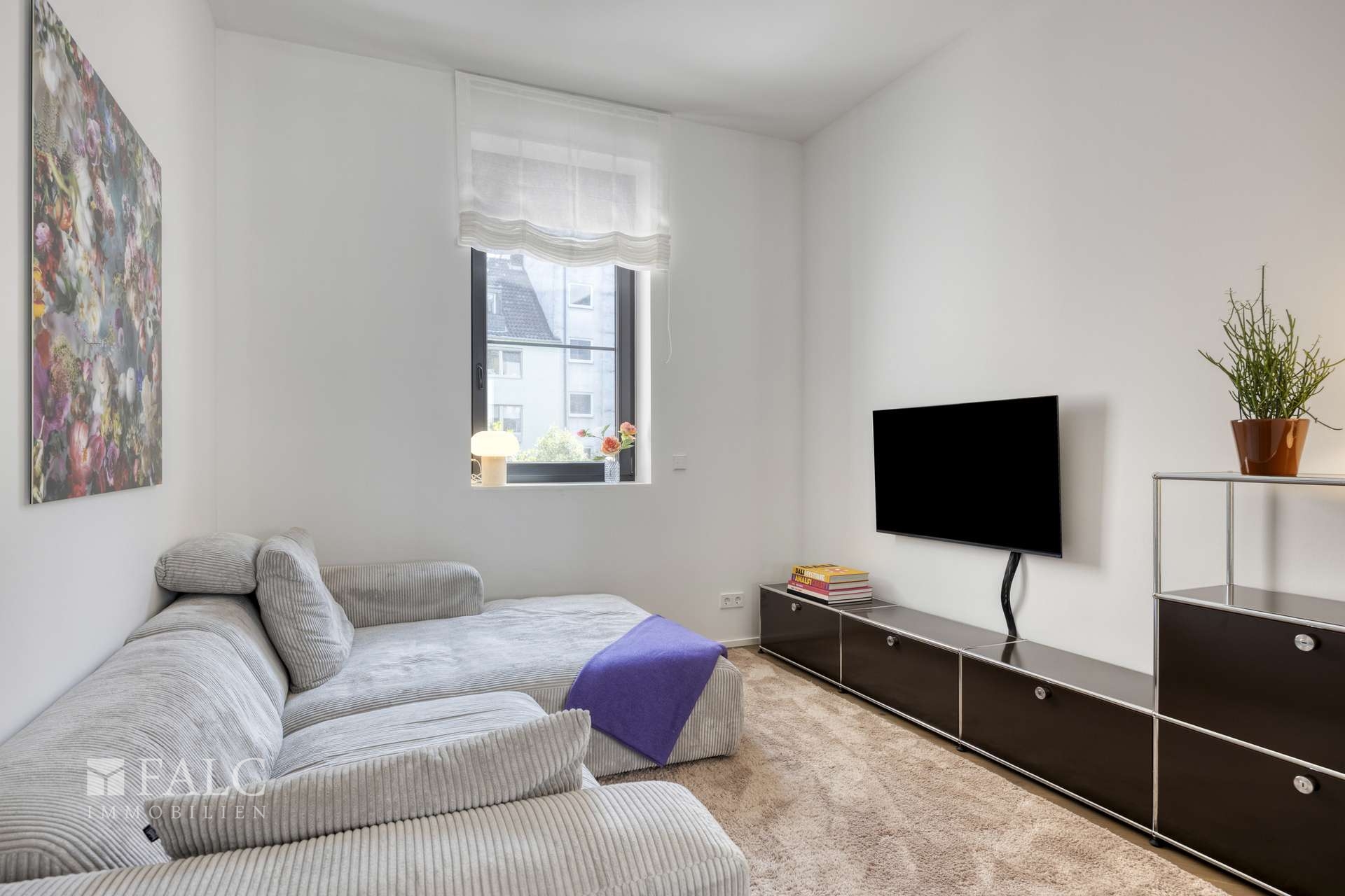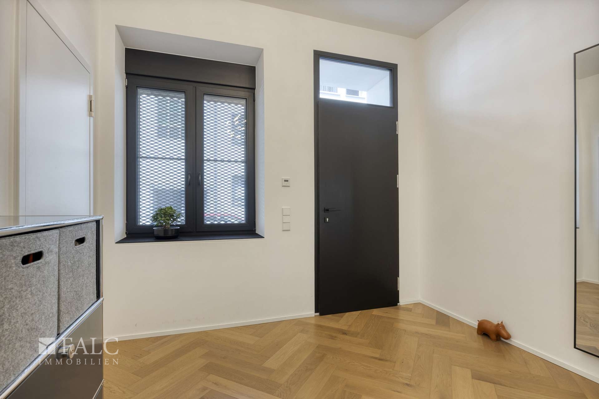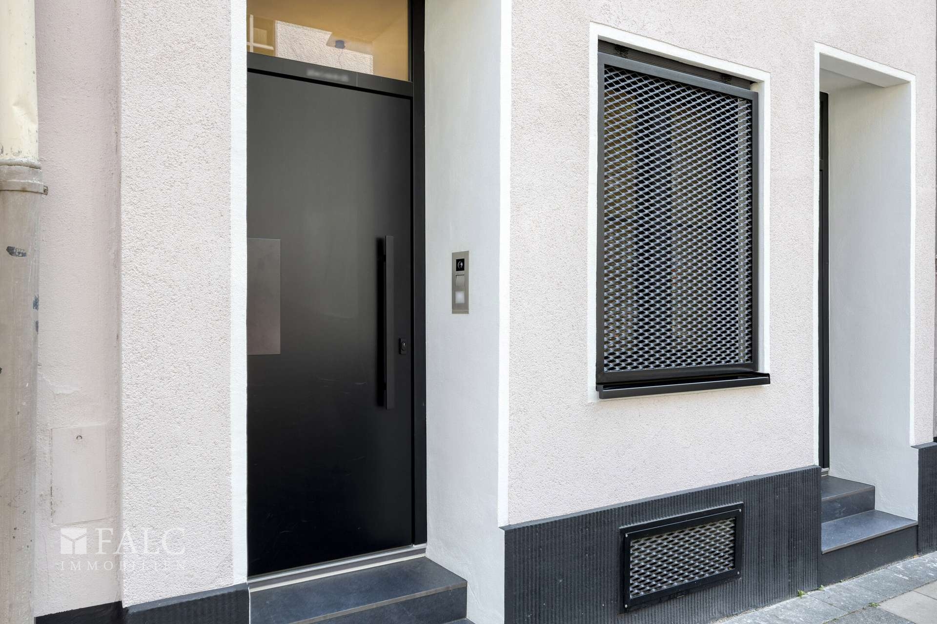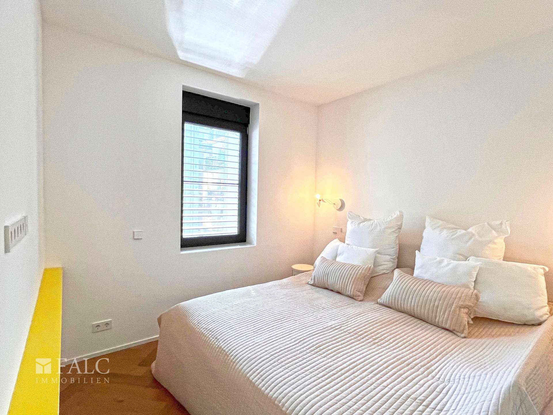 Ein besonderes Augenmerk liegt auf der intelligenten technischen Ausstattung: Die Fenster sind dreifach verglast und verfügen über elektrisch steuerbare Jalousien sowie vollflächig verschließbare Raffstores für vollständige Verdunkelung – ideal für Mediennutzung oder lichtempfindliches Wohnen. Die Sicherheitstechnik von Busch-Jäger inklusive Gegensprechanlage erfüllt höchste Ansprüche an Privatsphäre und Schutz.