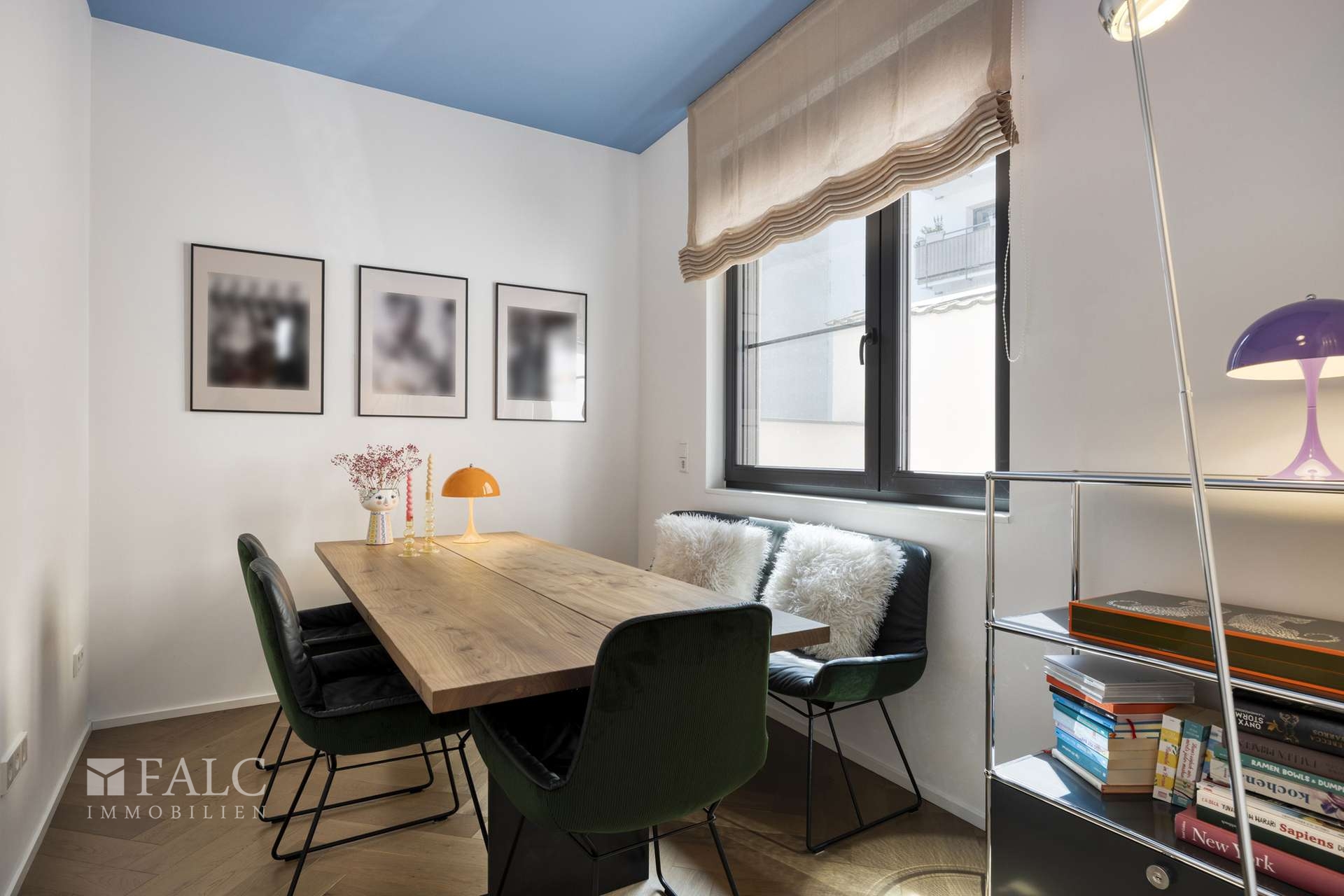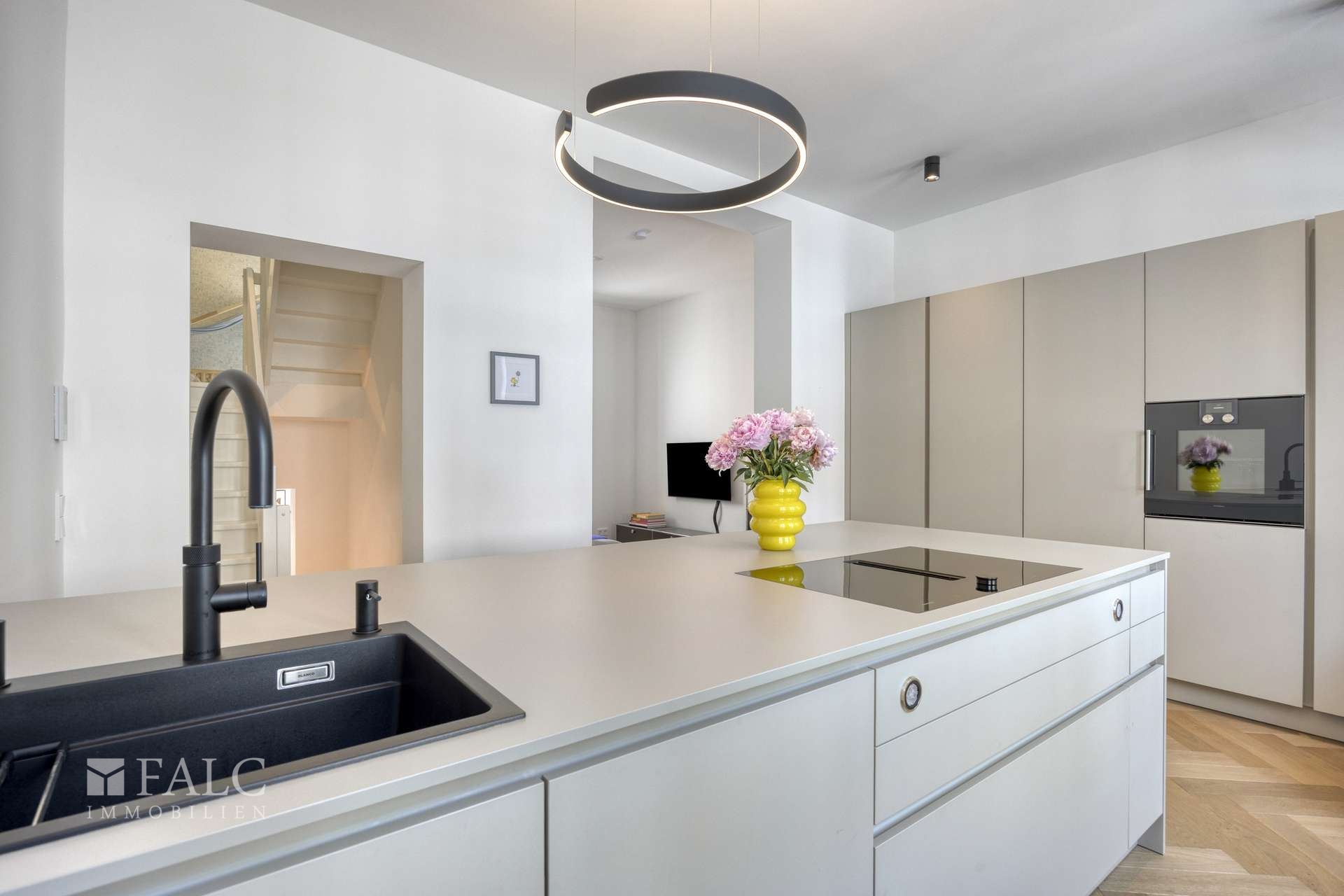 Die Ausstattung ist kompromisslos hochwertig: In allen Wohnräumen wurde edles Fischgrätenparkett aus geräucherter Eiche verlegt, das Wärme und Raffinesse ausstrahlt. Die Fußbodenheizung mit Fernwärmeanschluss sorgt für modernen Wohnkomfort. In der Küche treffen Design und Funktionalität auf höchstem Niveau zusammen – mit einer maßgefertigten Einbauküche von Leicht, ausgestattet mit modernsten Geräten von Gaggenau (Ofen und Herd) und Miele (Spülmaschine und Kühlschrank).