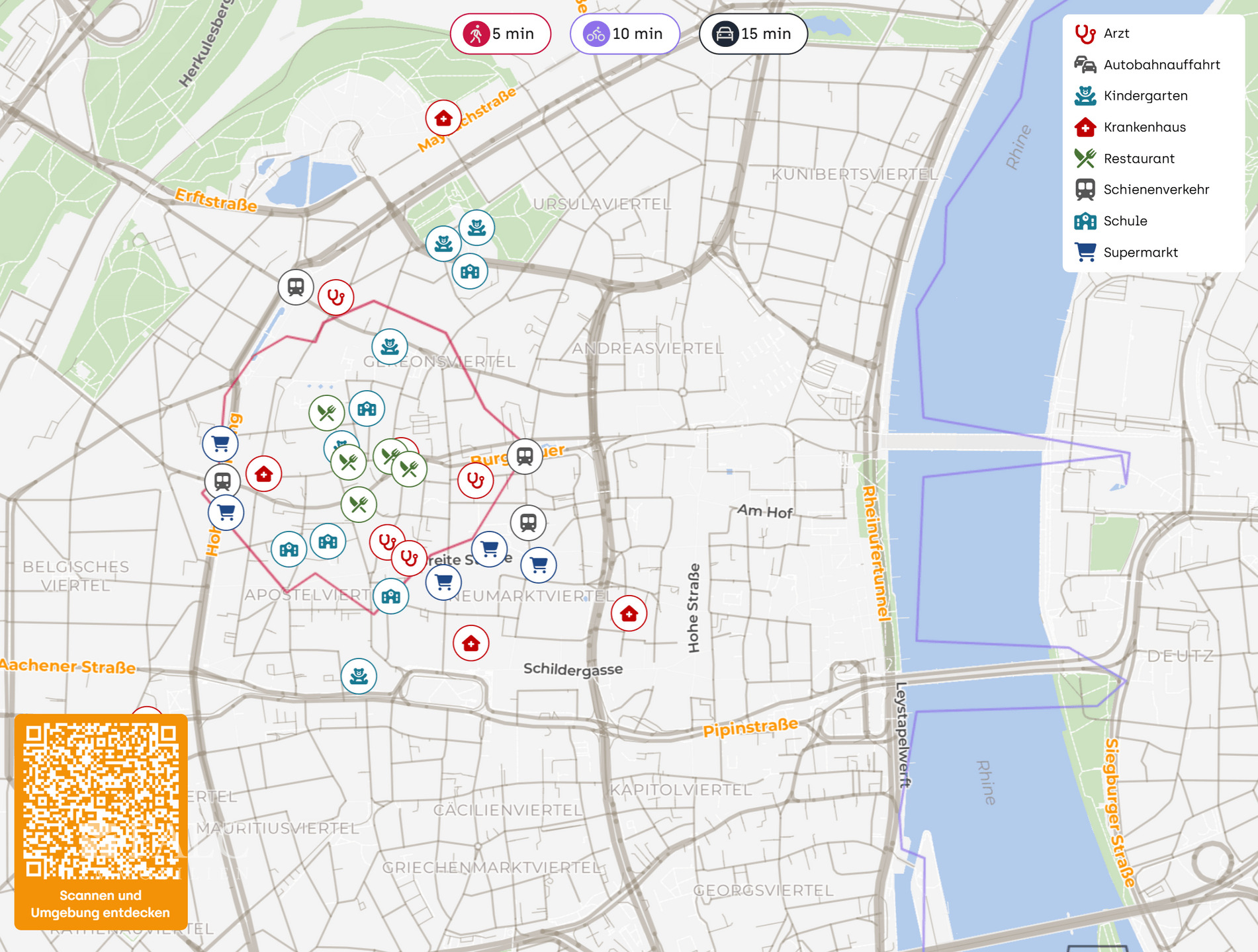 Der Flughafen Köln/Bonn ist in etwa 20 Autominuten erreichbar, was die Lage auch für Vielreisende ideal macht. Insgesamt bietet diese Immobilie eine perfekte Kombination aus urbanem Leben und hervorragender Erreichbarkeit, eingebettet in eine dynamische und kulturell reiche Umgebung, die das Gereonsviertel zu einem ganz besonderen Ort macht.