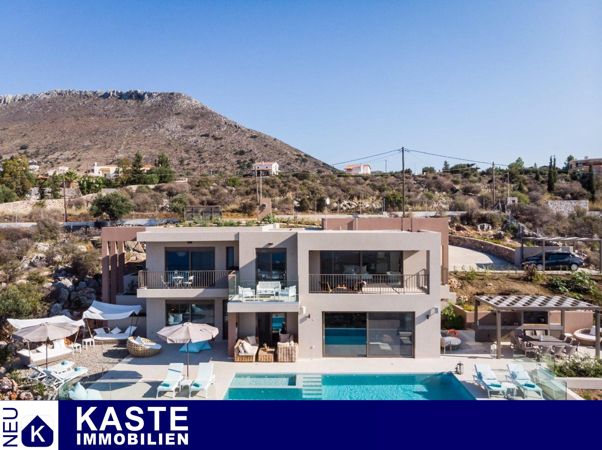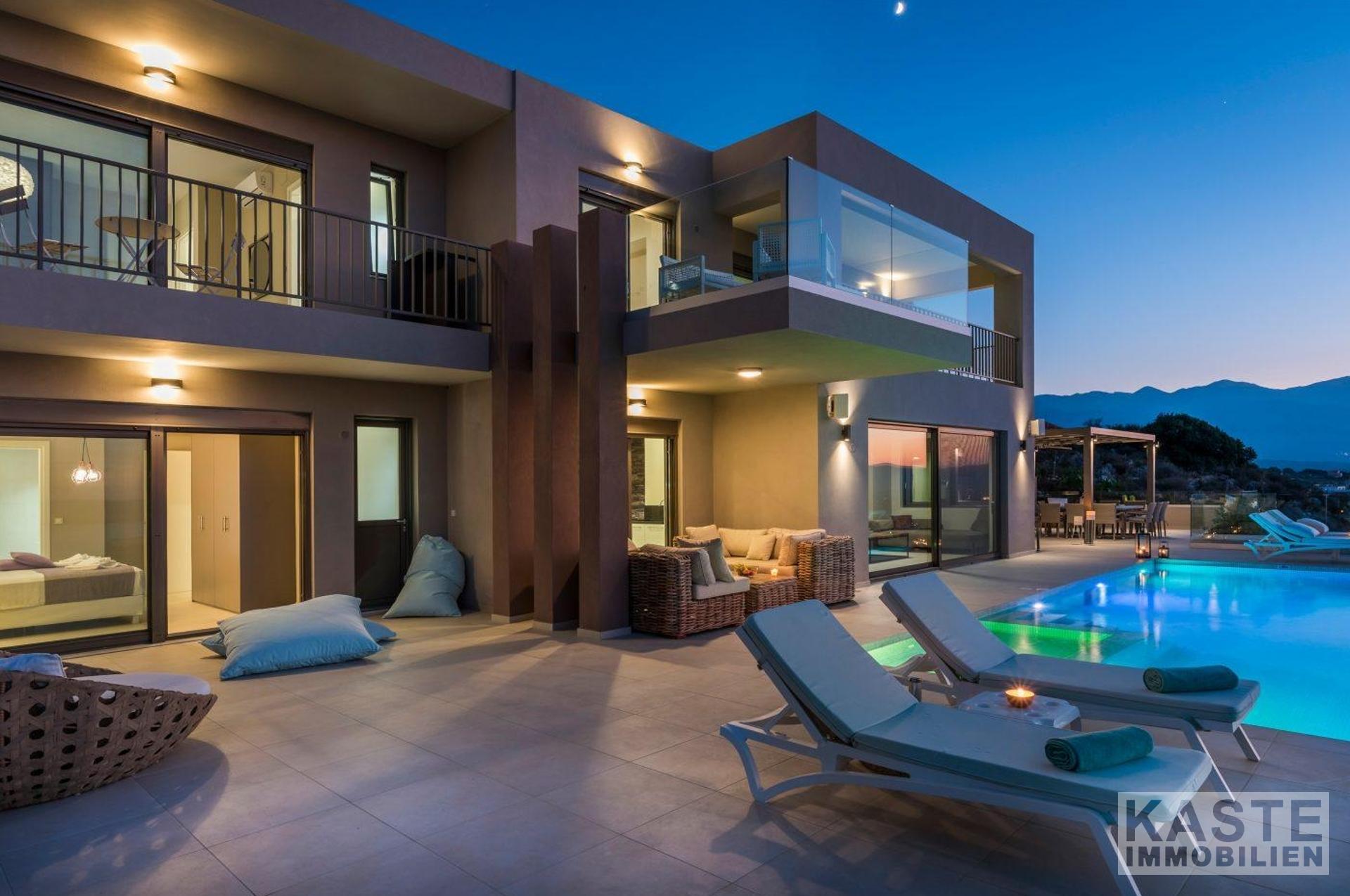 Diese exklusive, neu gebaute Luxusvilla auf Kreta bietet 280 m² Wohnfläche in herausragender Qualität und exklusivem Design, ideal als hochwertiges Familien- oder Feriendomizil. Mit 5 großzügigen Schlafzimmern und 6 Bädern vereint sie modernsten Komfort mit einem durchdachten offenen Grundriss, der den großzügigen Wohn- und Küchenbereich harmonisch verbindet. Große Fensterfronten öffnen die Räume zum spektakulären Panorama der kretischen Landschaft und des Meeres – hier genießen Sie atemberaubende Sonnenuntergänge und eine unvergleichliche Atmosphäre.