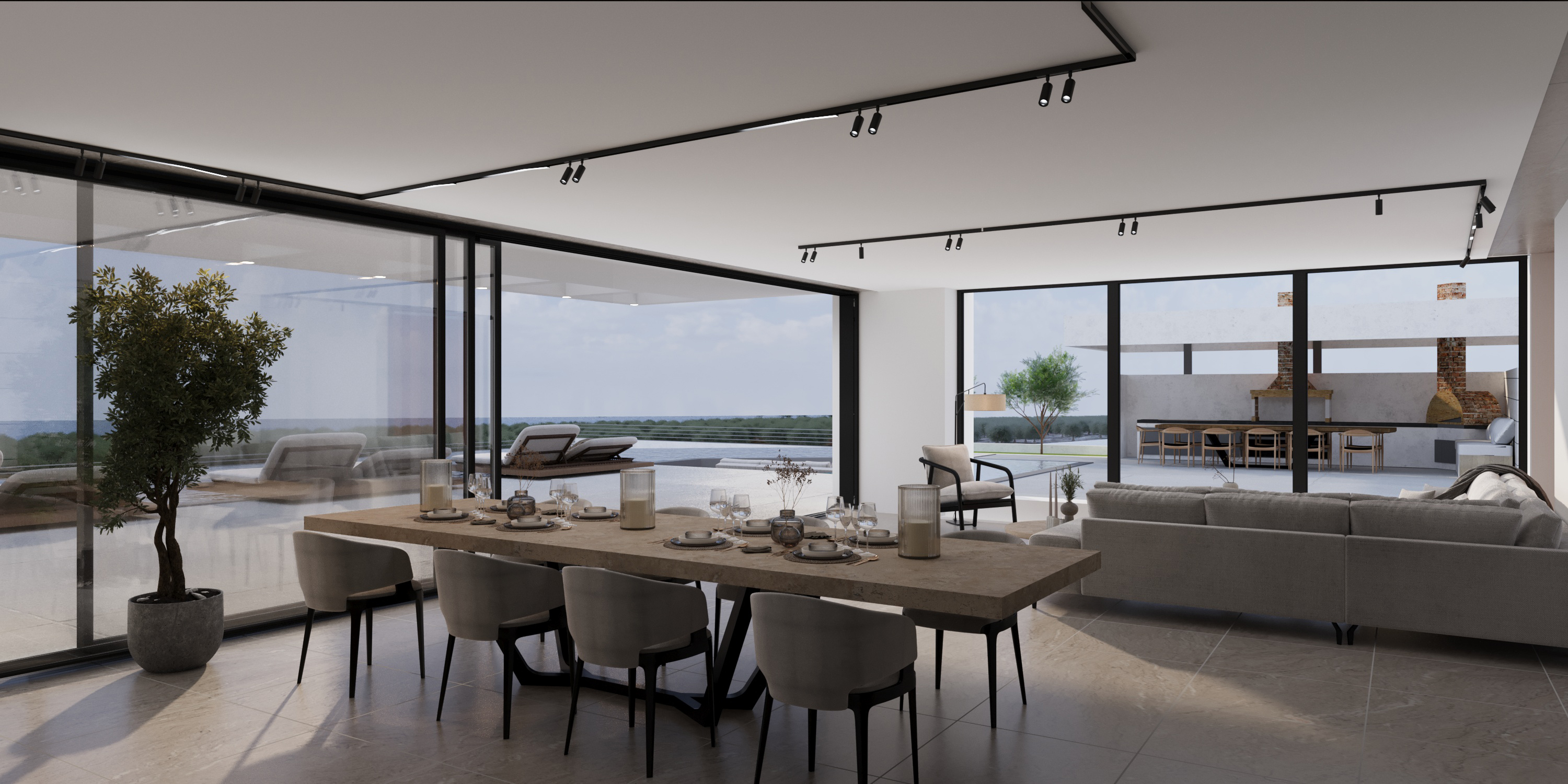 Auf einem großzügigen Grundstück genießen Sie 250 m² Wohnfläche, verteilt auf vier elegante Schlafzimmer en suite und fünf stilvolle Bäder. Der offene Wohn- und Essbereich mit Panoramafenstern geht fließend in die großzügigen Terrassen über – mit Blick auf das Meer und spektakuläre Sonnenuntergänge.