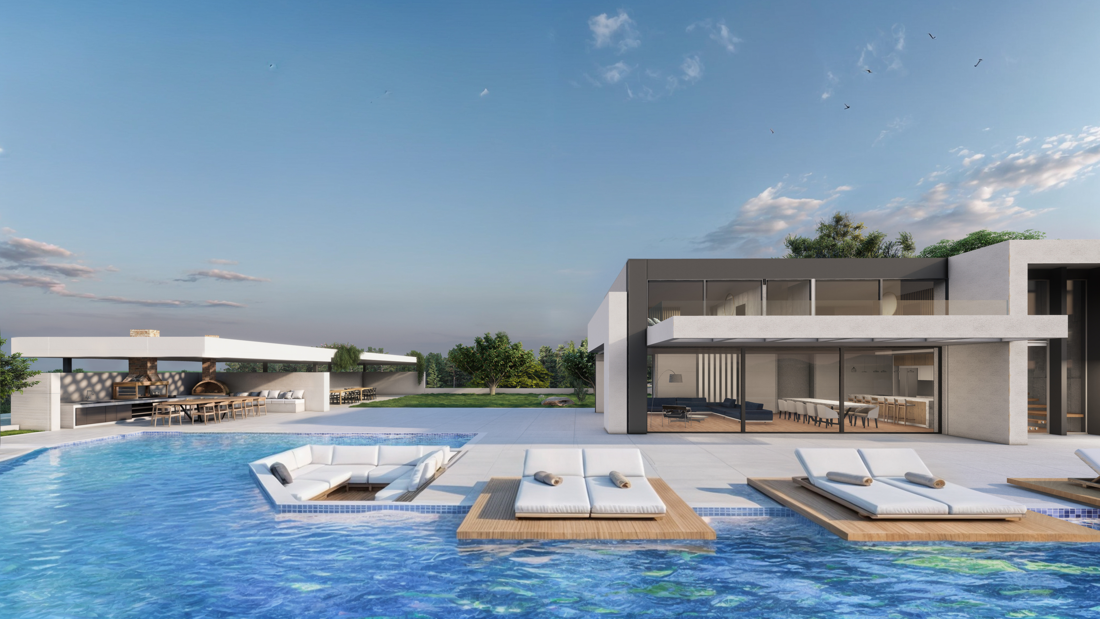 Herzstück des Außenbereichs ist der 160 m² große Infinity-Pool, der inmitten mediterraner Gartenanlagen liegt und sowohl Ruhe als auch Exklusivität ausstrahlt. Eine voll ausgestattete Außenküche mit BBQ-Bereich lädt zu entspannten Abenden im Freien ein. Drei private Stellplätze runden das komfortable Konzept ab.