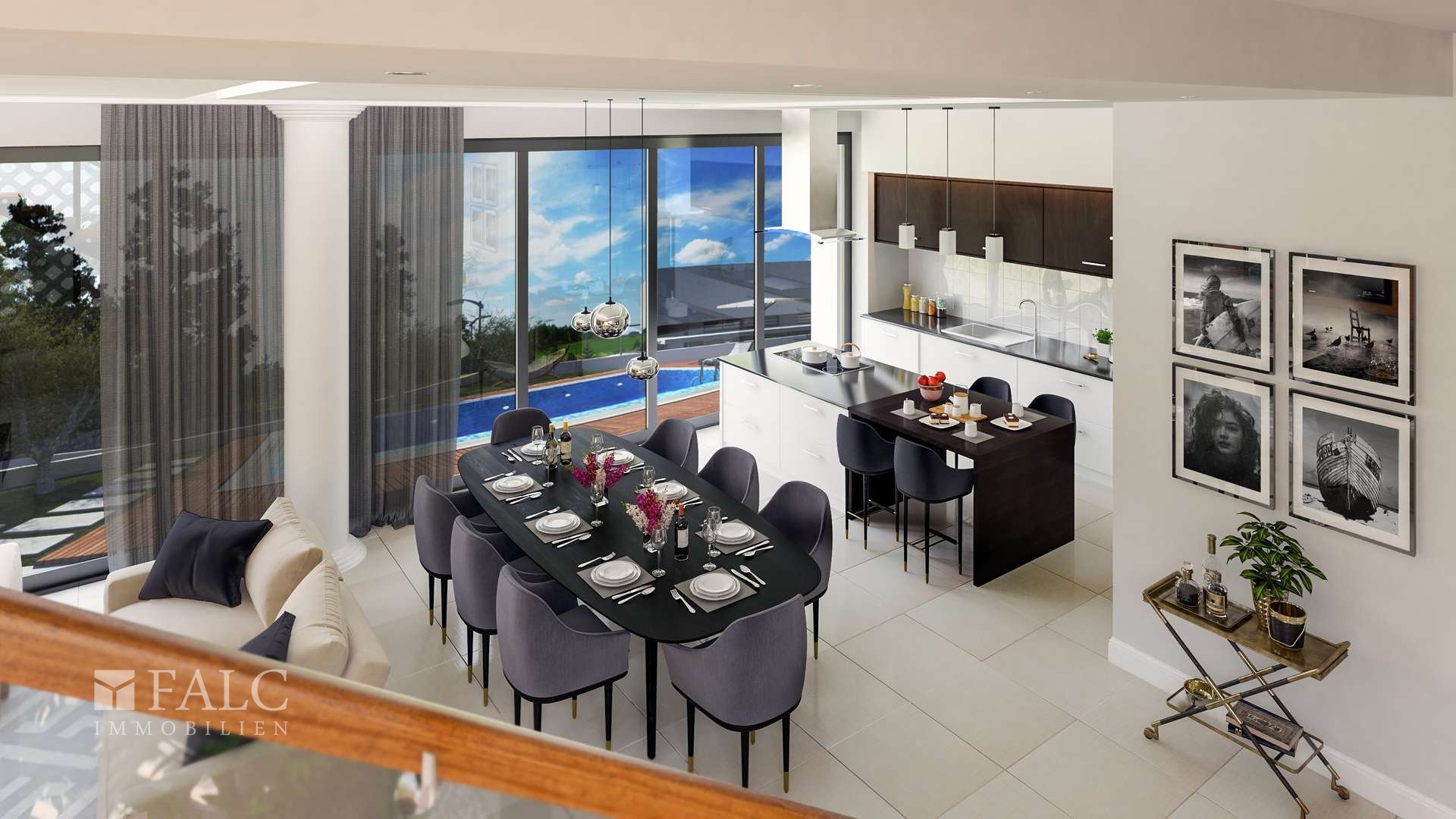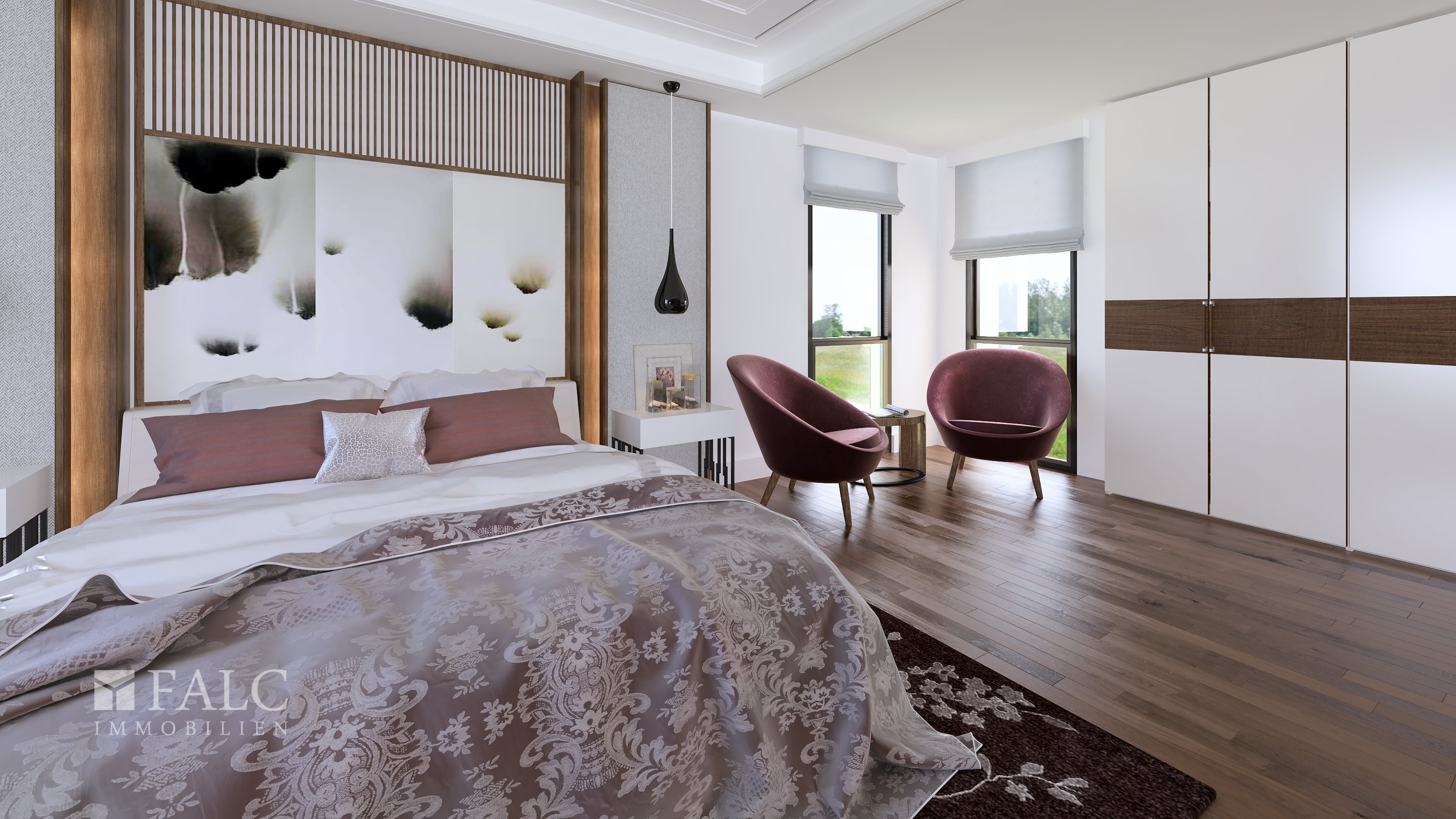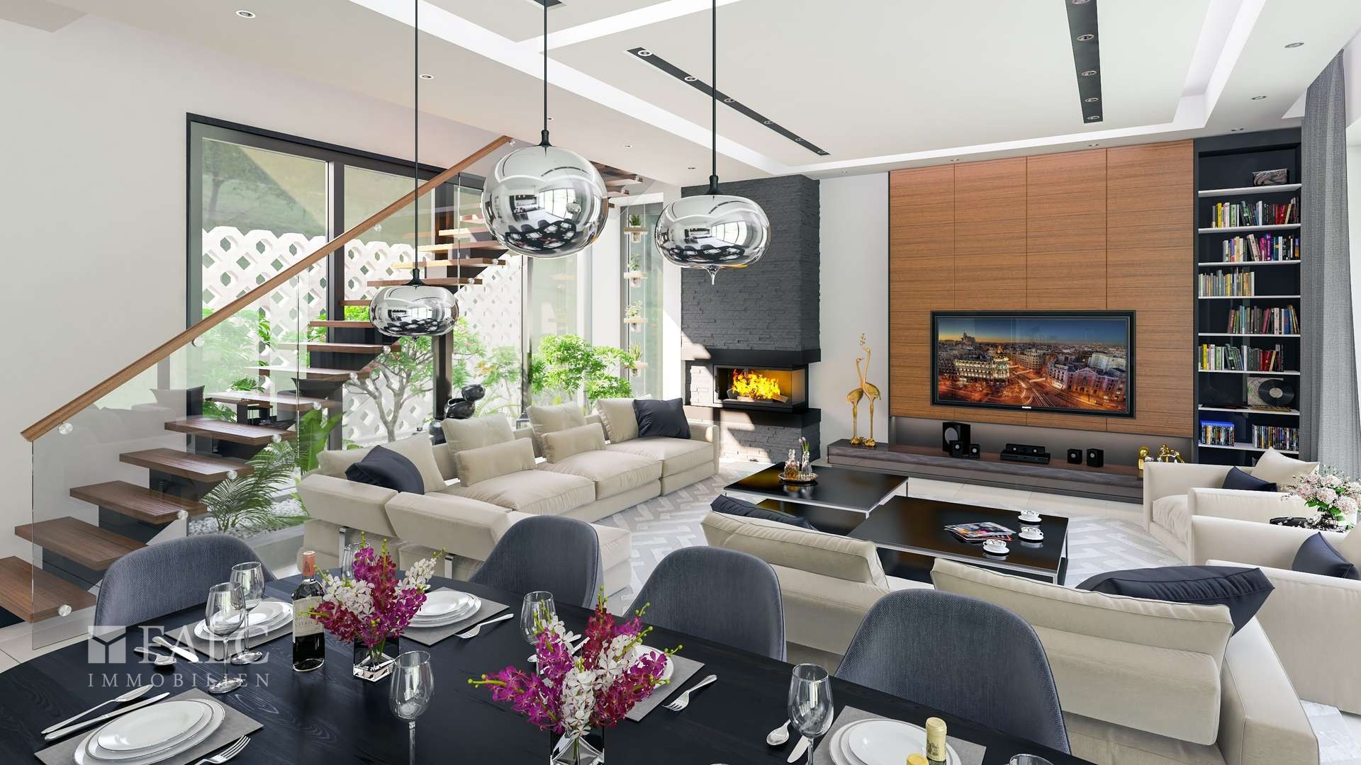- Gäste WC (1) - Küche mit Einbauküche - Kamin (1) - Klimatisiert (1) - Terrasse (1) - Swimmingpool (1) - Unterkellert (Ja) - Fenster aus Aluminium mit Doppelverglasung - Natürliche Beleuchtung - Abdichtung und Wärmedämmung auf dem Dach - Einzigartig gestaltete abgehängte Decken- und Beleuchtungssysteme - Teilweise Parkett, Marmor oder Keramik als Bodenbelag - Hauptschlafzimmer mit eigenem Bad - Stahltreppe und Innengarten - Einbauschränke in Schlafzimmern - Solarenergieverstärkter Warmwasserspeicher - VRF-Zentralheizungs-/Kühlsystem - Hansgrohe Sanitärartikel reduzieren den Wasserverbrauch - 5-Tonnen-Wassertank und Drucktanksystem - Grüne Landschaft - Satelliten-, Internet- und Telefoninfrastruktur - Video-Gegensprechanlage - Geschlossene Garage und ferngesteuertes Garagentor - Außenbeleuchtung