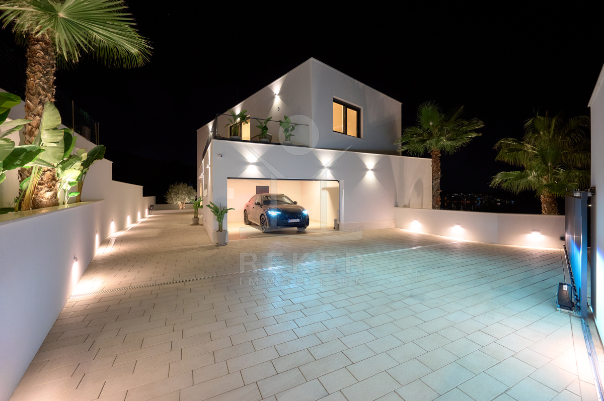 Diese luxuriöse Villa in Trogir verbindet Nähe zum Meer mit angenehmer Privatsphäre. Nur 350 Meter trennen Sie vom Strand. Die historische Altstadt erreichen Sie in 15 Gehminuten, der Flughafen ist rund 10 Fahrminuten entfernt. Kurze Wege, viel Ruhe. Der unverbaubare Meerblick ist vertraglich zugesichert und begleitet Sie aus jedem Zimmer mit freiem Panorama. Für Ihre Fahrzeuge stehen eine Doppelgarage mit Anschluss für Elektrofahrzeuge sowie zwei zusätzliche Stellplätze bereit.