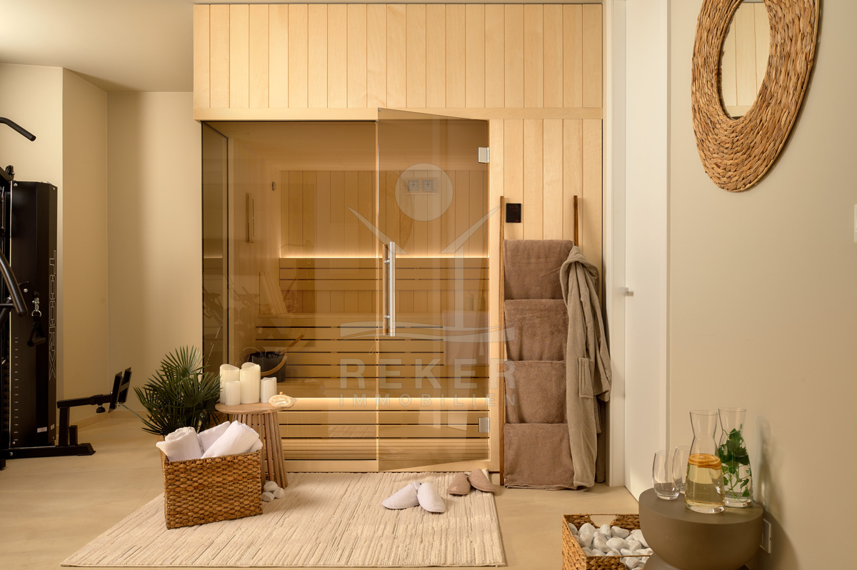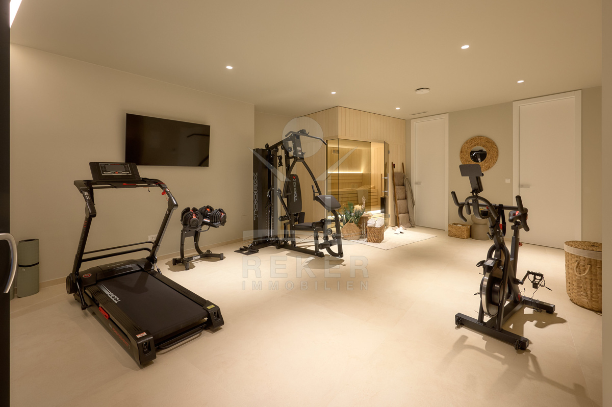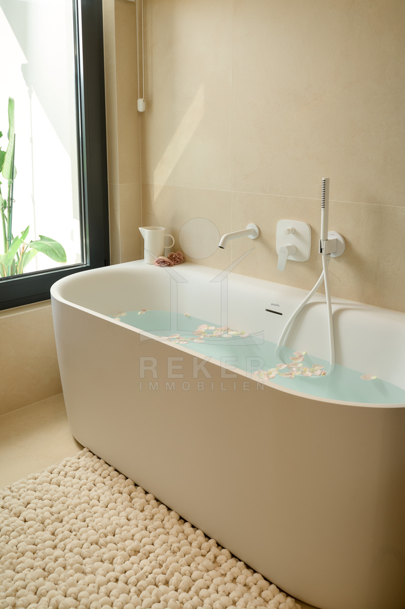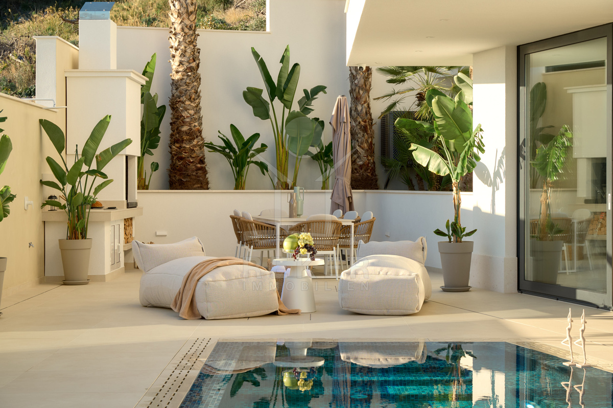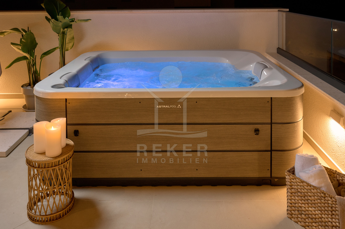 Das 511 m² große Grundstück ist gepflegt angelegt und wird automatisch bewässert. Mittelpunkt des Außenbereichs ist der 31 m² große Überlaufpool mit Heizung, Massagefunktion und Gegenstromanlage. Sie schwimmen sportlich oder entspannen im warmen Becken. Ergänzt wird dieser Bereich durch einen Außenwhirlpool, eine Außendusche und einen Grillplatz.