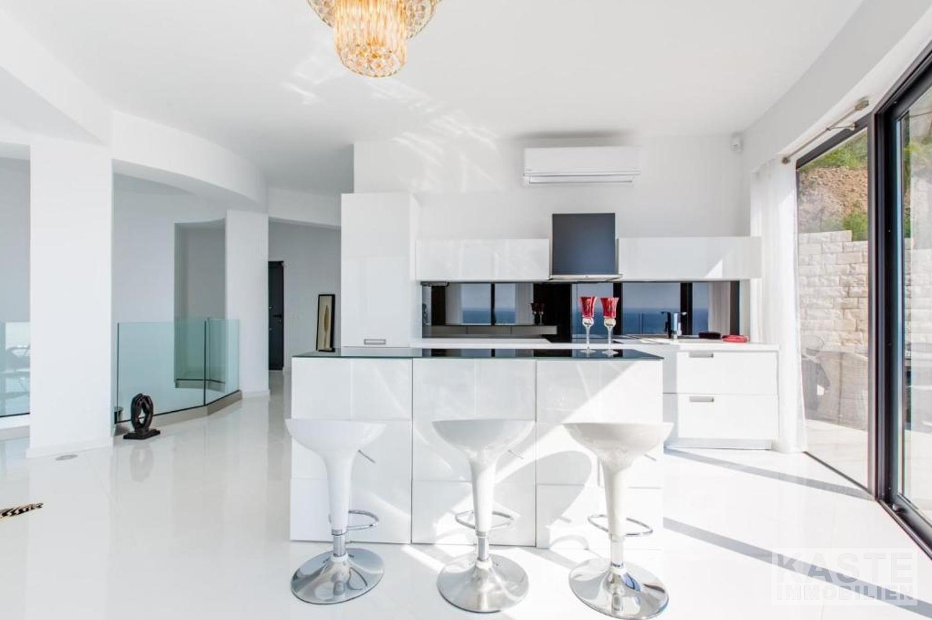 Im Erdgeschoss empfängt Sie ein weitläufiger Wohn- und Essbereich, dessen große Fensterfronten das natürliche Licht optimal hereinlassen und einen herrlichen Blick auf das Meer garantieren. Die voll ausgestattete Küche bietet Raum für kulinarische Genüsse in stilvollem Ambiente. Ein Schlafzimmer mit eigenem Badezimmer inkl. Dusche liegt ebenfalls auf dieser Ebene und öffnet sich durch eine großflächige Terrassentür direkt zum luxuriösen Infinity-Pool – perfekt, um morgens frisch in den Tag zu starten oder entspannte Stunden im Freien zu genießen.