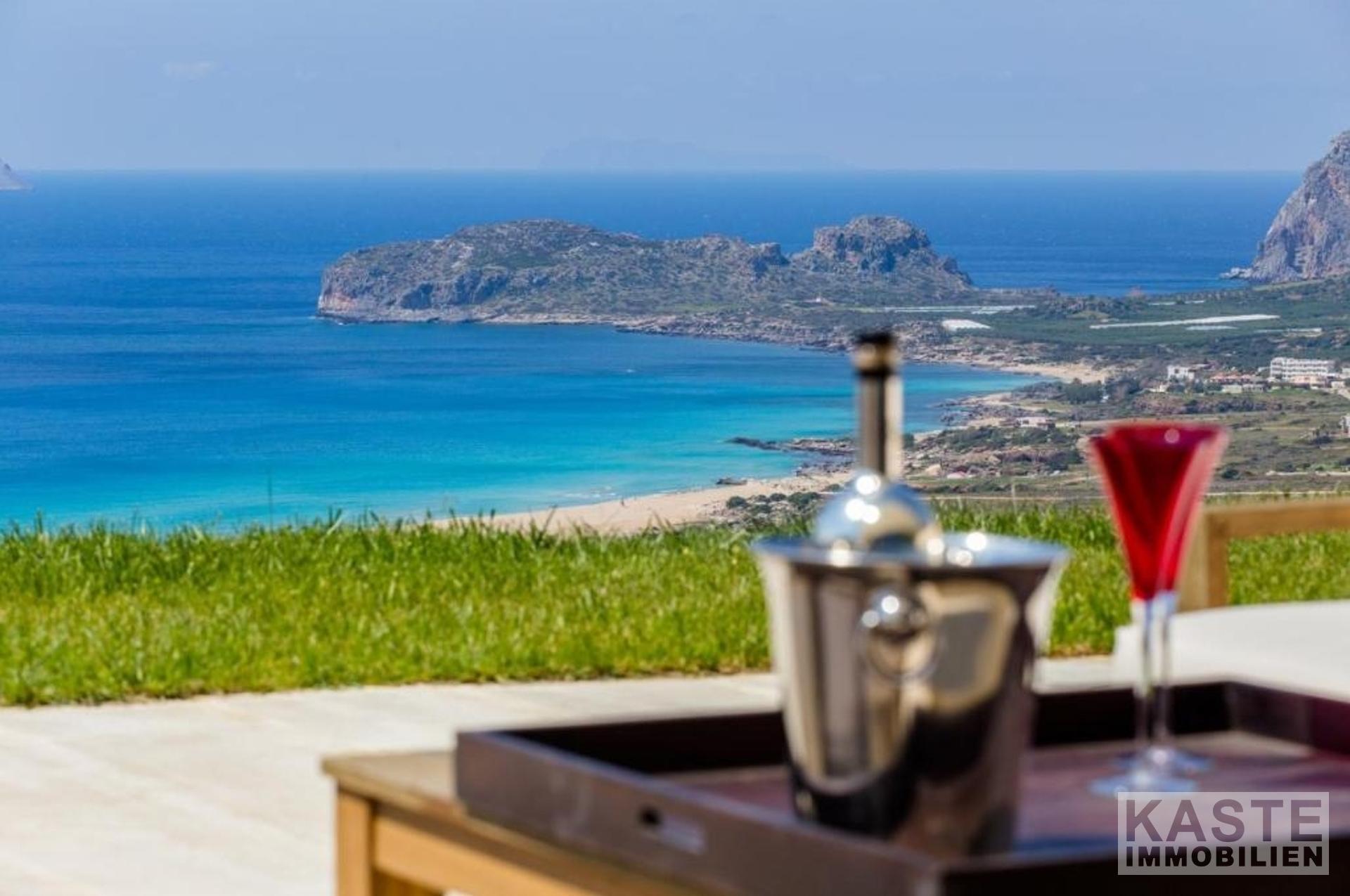 Der Außenbereich beeindruckt mit einem Infinity-Pool, der nahtlos in das Panorama des azurblauen Meeres überzugehen scheint, sowie liebevoll angelegten Gärten und mehreren großzügigen Terrassen. Ein BBQ- und Essbereich im Freien bietet den idealen Rahmen für gesellige Abende im warmen Mittelmeerklima, flankiert vom Blick auf den berühmten Strand von Falassarna. Die Ausstattung der Villa umfasst moderne Klimaanlagen, einen private Whirlpool und eine durchdachte Gartengestaltung mit Sonnenliegen und Schirmen, die Komfort und Luxus harmonisch vereinen.
