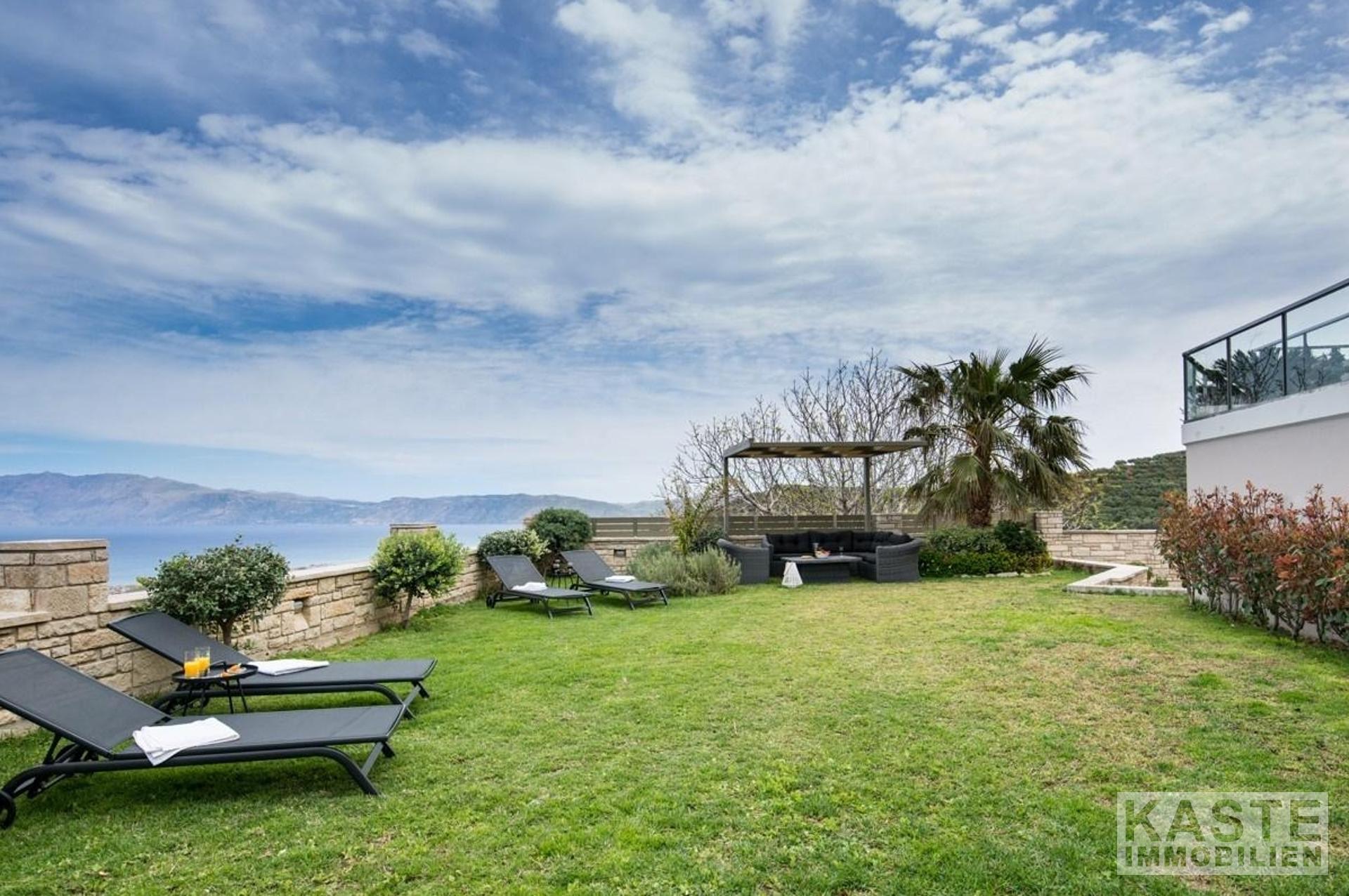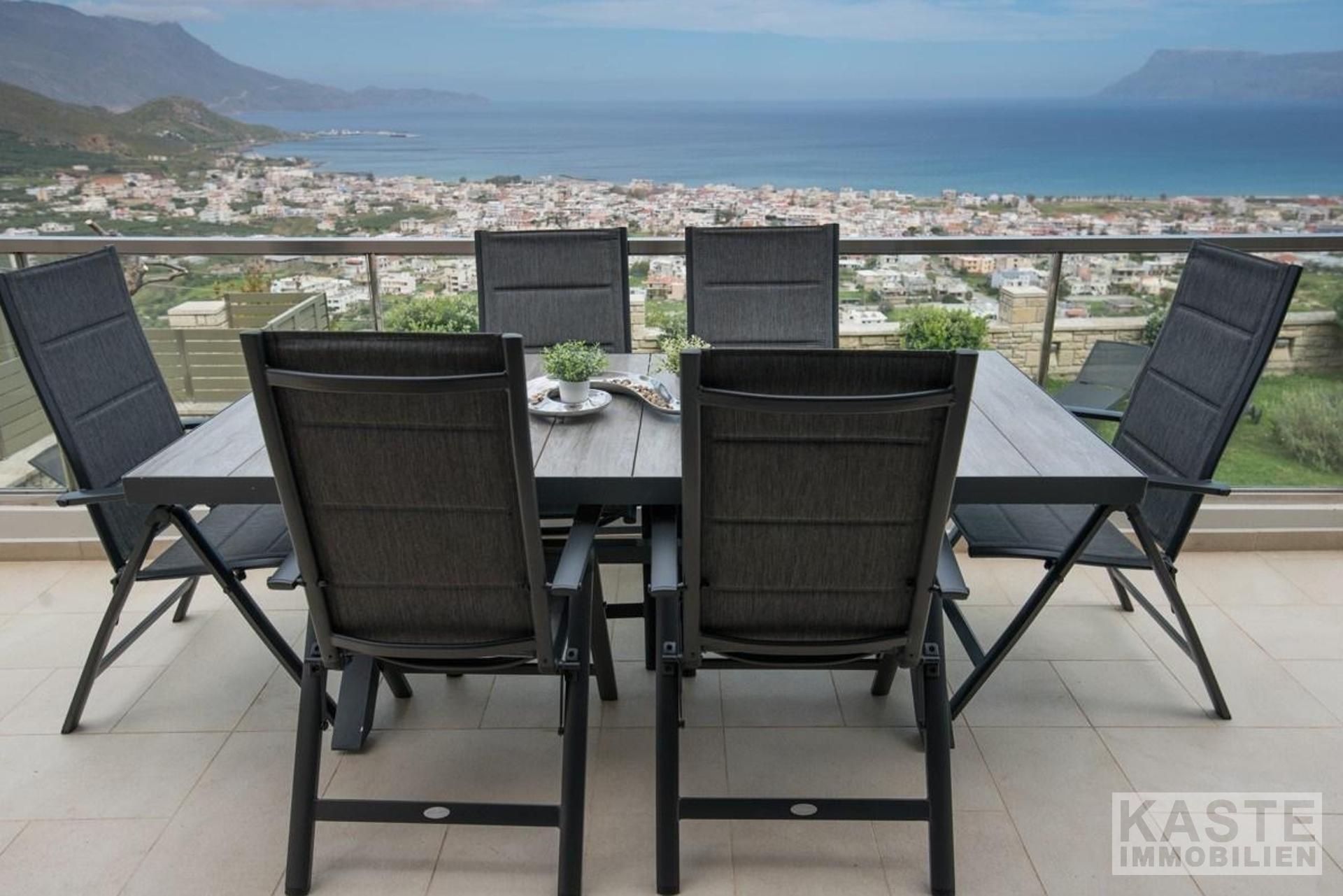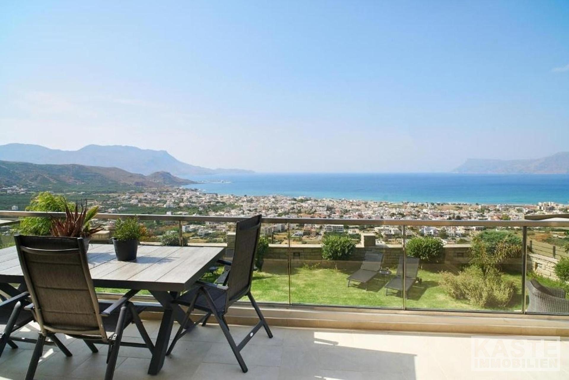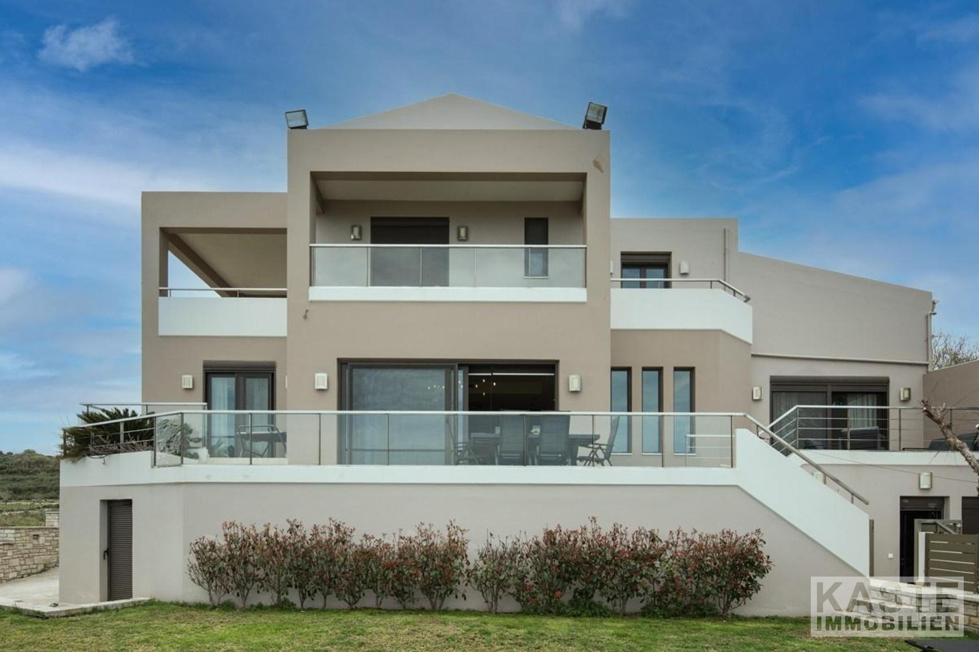 Die Villa erstreckt sich über drei Ebenen, das Untergeschoss, das Erdgeschoss und das Obergeschoss. Die Innen- und Außenbereiche bieten atemberaubende Ausblicke und alle Etagen haben geräumige Veranden und Balkone mit Blick auf die Bucht von Kissamos. Das Haus kann entweder durch den Haupteingang im Erdgeschoss oder durch die Garage betreten werden. Das offen gestaltete Erdgeschoss bietet geräumige und helle Bereiche. Es besteht aus einem Wohnzimmer, einer Sitzecke, einem Essbereich und einer Küche. Die Küche ist durch einen Küchengang vom Rest der Etage abgetrennt. Von hier aus gelangen Sie auf 2 Balkone an der Nord- und Ostseite des Hauses. Das Erdgeschoss verfügt außerdem über ein großes WC und einen Abstellraum.