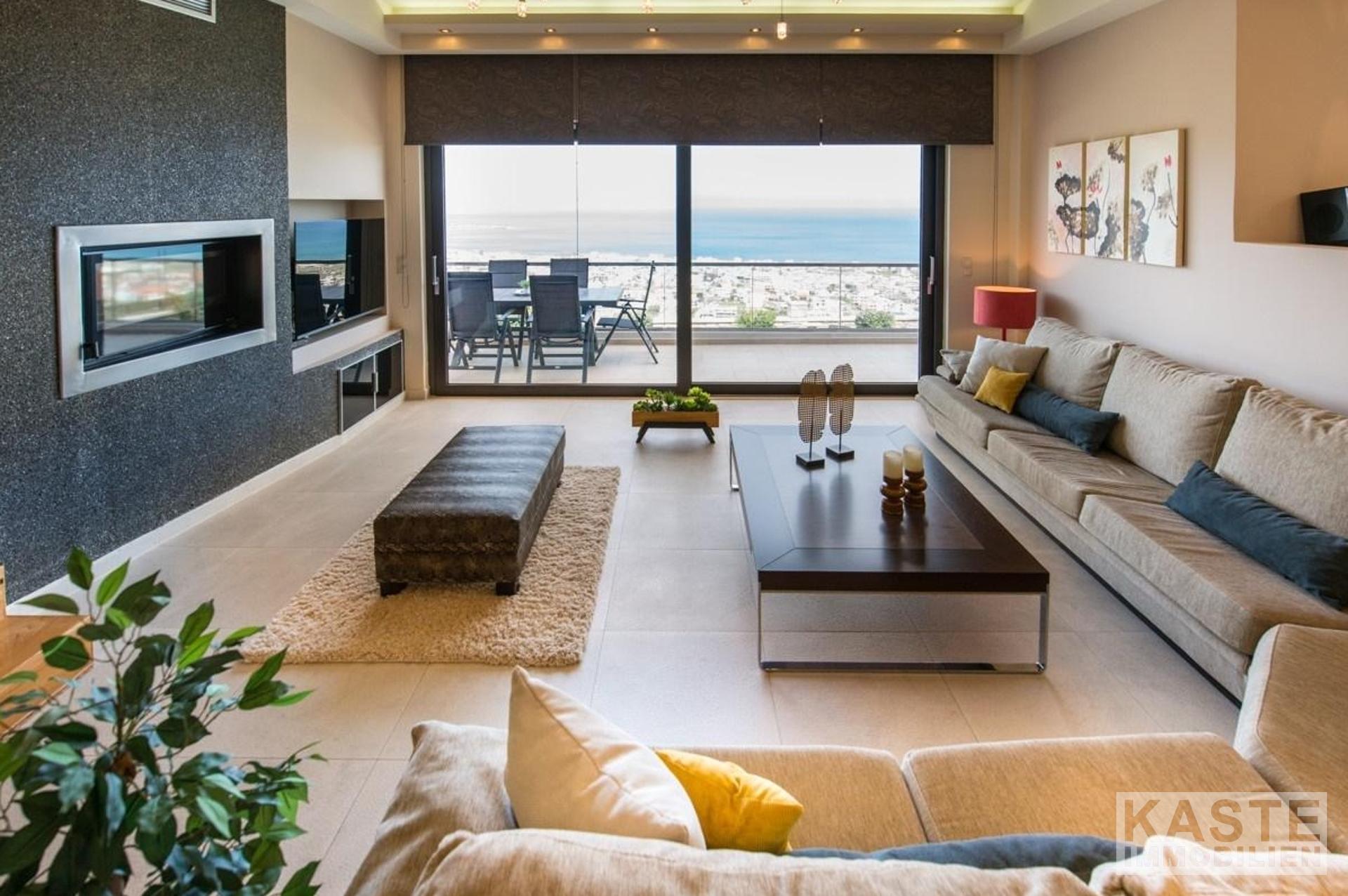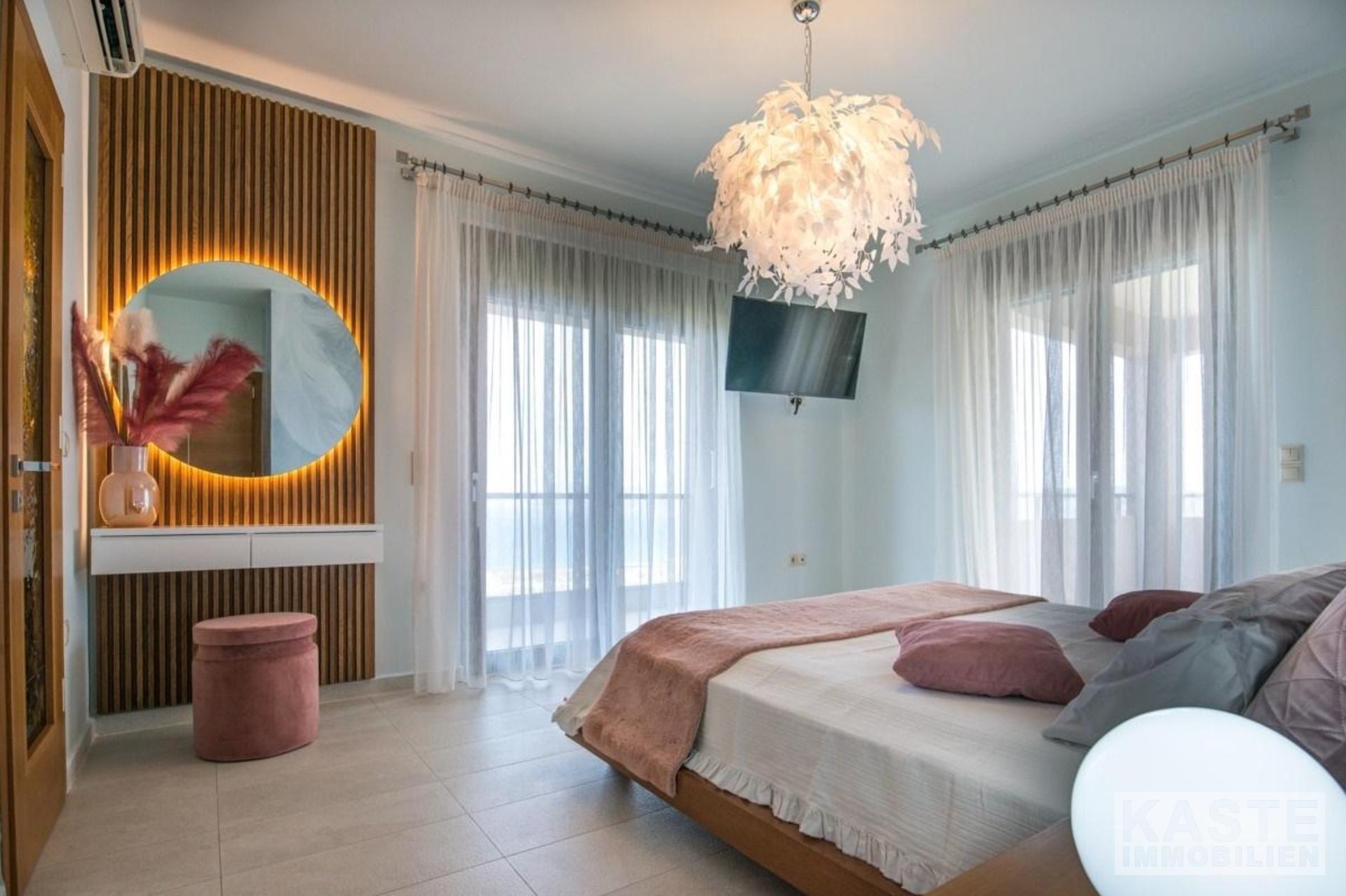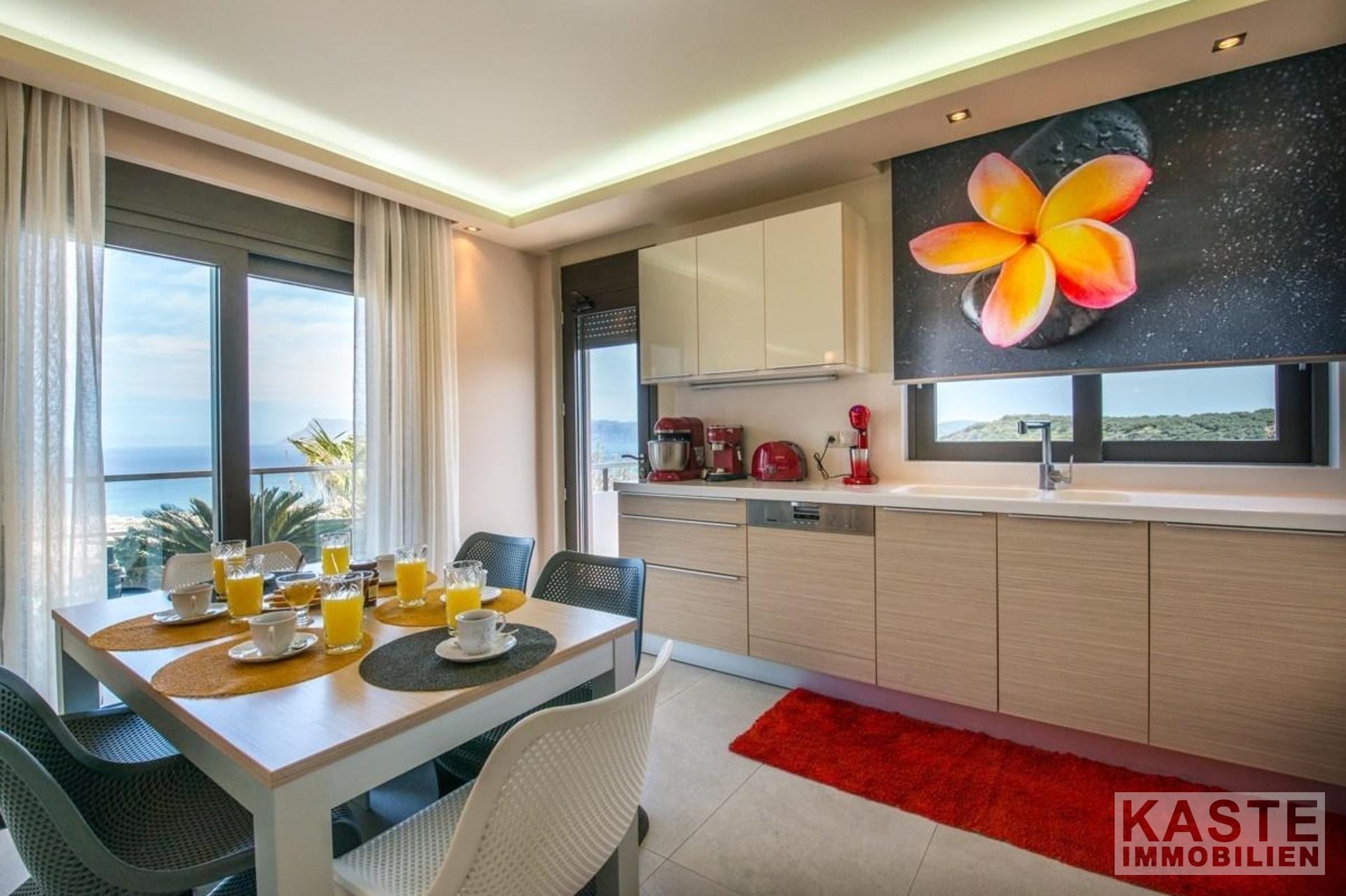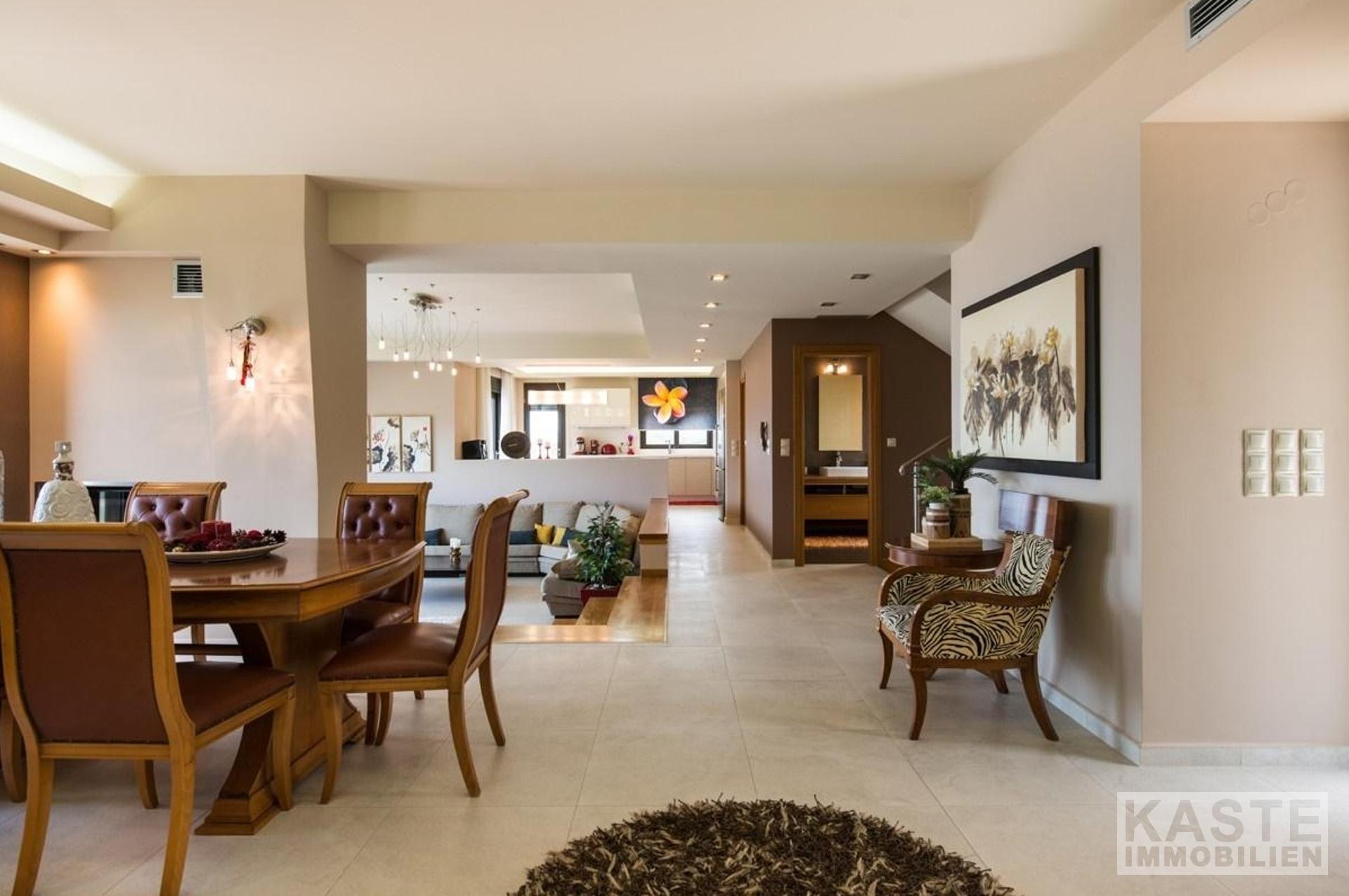 Die Villa erstreckt sich über drei Ebenen, das Untergeschoss, das Erdgeschoss und das Obergeschoss. Die Innen- und Außenbereiche bieten atemberaubende Ausblicke und alle Etagen haben geräumige Veranden und Balkone mit Blick auf die Bucht von Kissamos. Das Haus kann entweder durch den Haupteingang im Erdgeschoss oder durch die Garage betreten werden. Das offen gestaltete Erdgeschoss bietet geräumige und helle Bereiche. Es besteht aus einem Wohnzimmer, einer Sitzecke, einem Essbereich und einer Küche. Die Küche ist durch einen Küchengang vom Rest der Etage abgetrennt. Von hier aus gelangen Sie auf 2 Balkone an der Nord- und Ostseite des Hauses. Das Erdgeschoss verfügt außerdem über ein großes WC und einen Abstellraum.