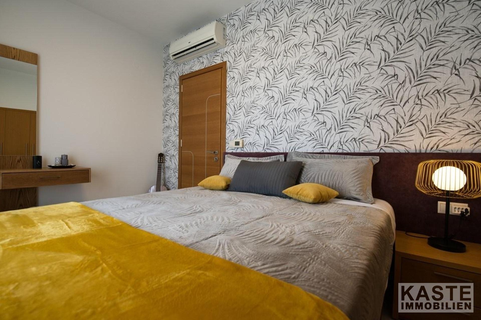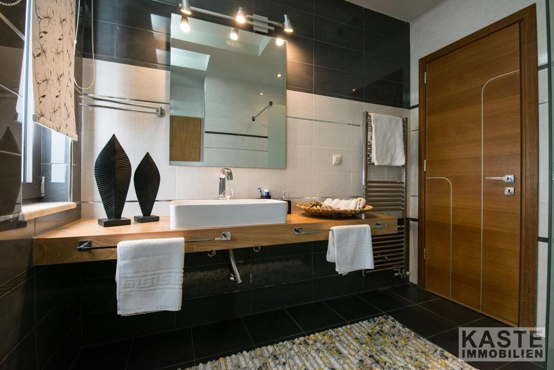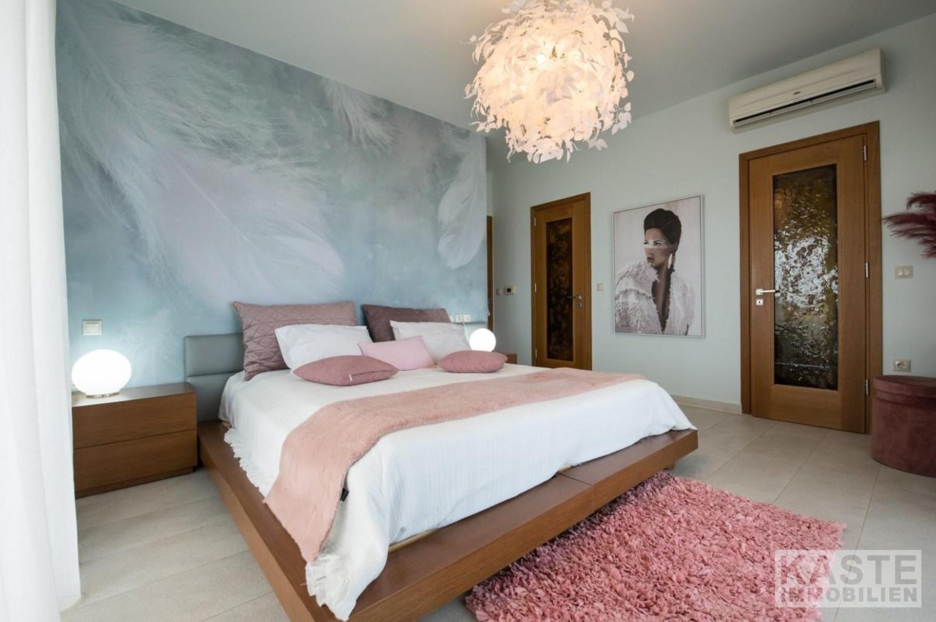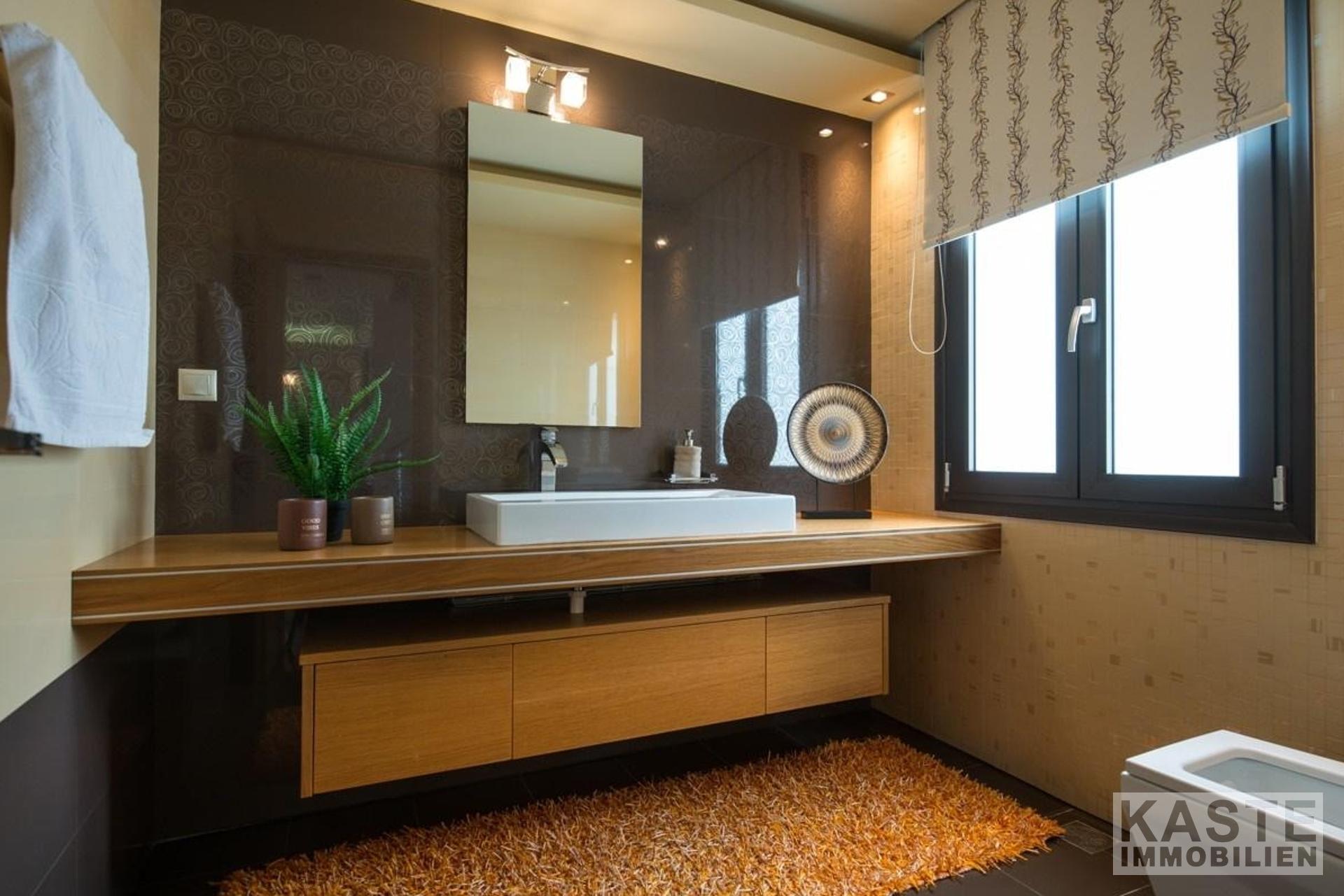 Eine Innentreppe verbindet die Etagen miteinander. Außerdem ist der Einbau eines Aufzugs vorgesehen, der alle drei Ebenen miteinander verbinden wird. Das Obergeschoss besteht aus drei Schlafzimmern, jedes mit einem Kleiderschrank und einer Terrassentür zu seinem Balkon. Das Hauptschlafzimmer hat einen begehbaren Kleiderschrank und ein eigenes Badezimmer. Zudem gibt es einen großen Dachboden mit Schränken, der als Stauraum, als Gästehaus oder als Spielzimmer genutzt werden kann. Das große Badezimmer auf der Etage verfügt ebenfalls über eine Dusche und einen Wäscheabwurfschacht. Das Untergeschoss ist ca. 180 qm groß und besteht aus einer großen Garage mit elektrischem Tor, einer offenen Küche, einem Wohnbereich, einem Schlafzimmer, einem Badezimmer und einer Waschküche.