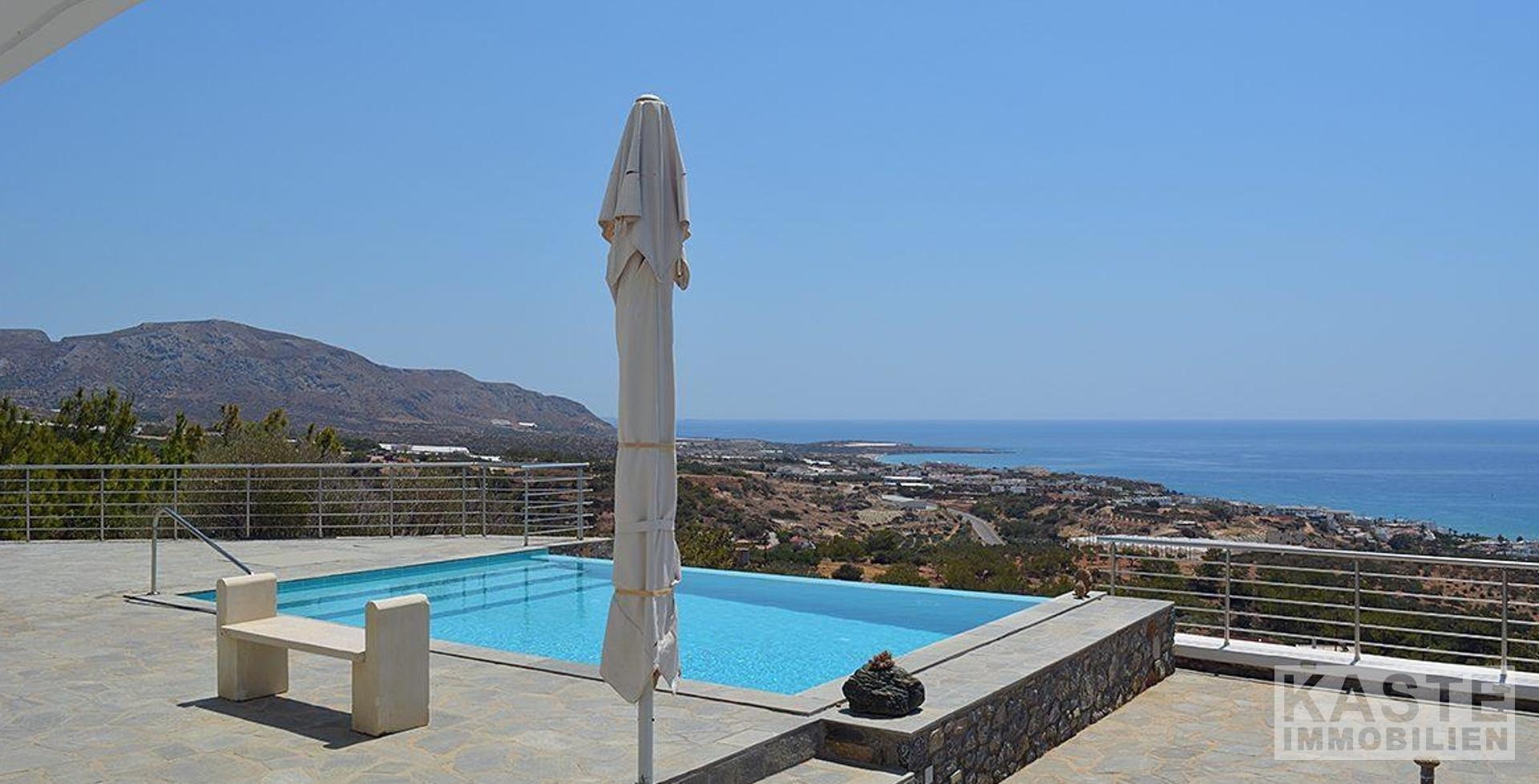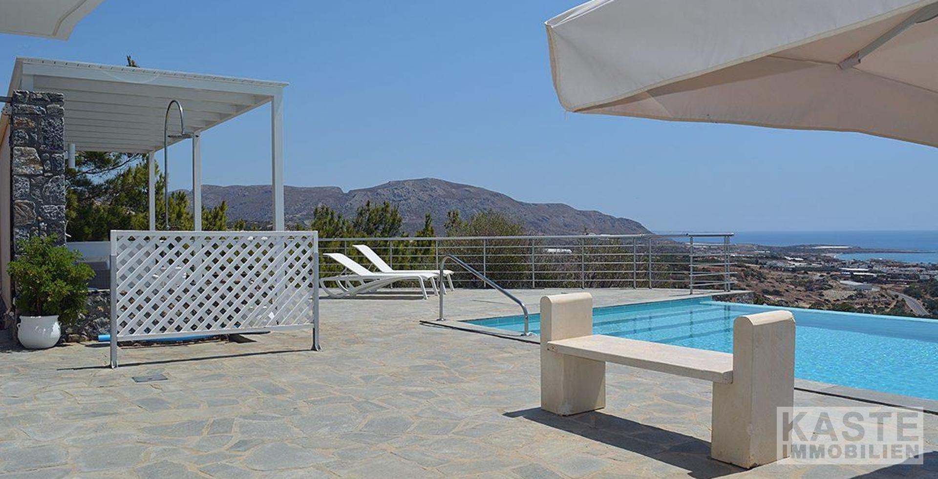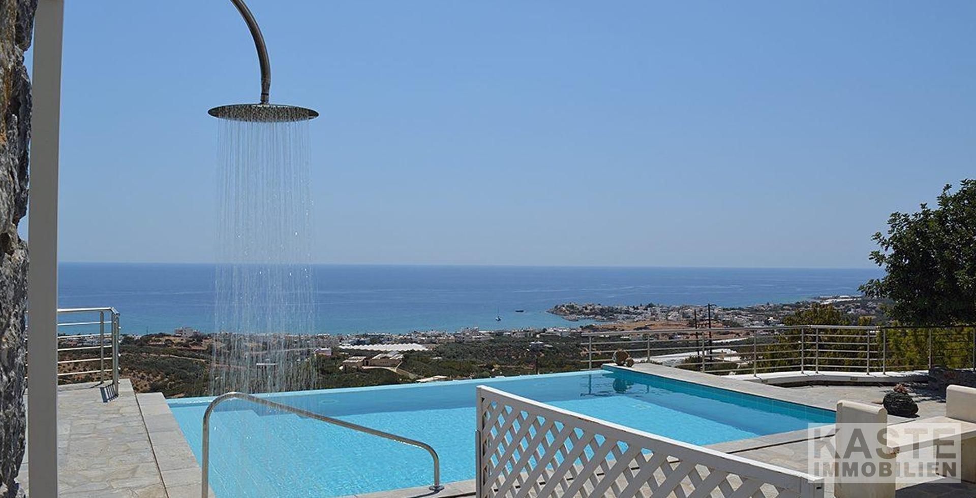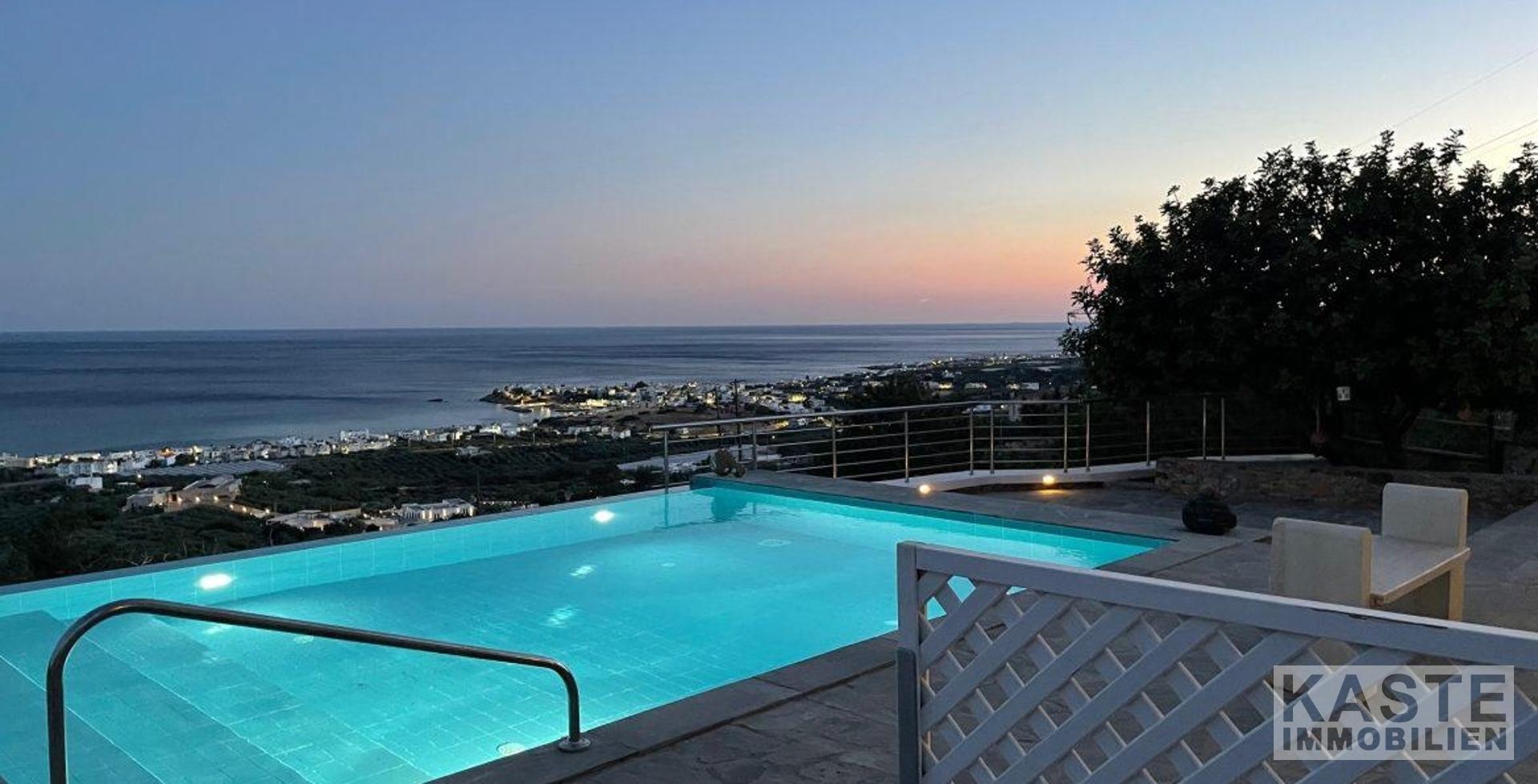Willkommen in diesem außergewöhnlichen Anwesen in der Region Agios Ioannis, oberhalb von Makrigialos. Die exklusive Luxusvilla mit separatem Gästehaus und Infinity-Pool bietet einen atemberaubenden Panoramablick auf den Ort, das Meer und die umliegenden Berge – ein wahres Paradies für Ruhesuchende.