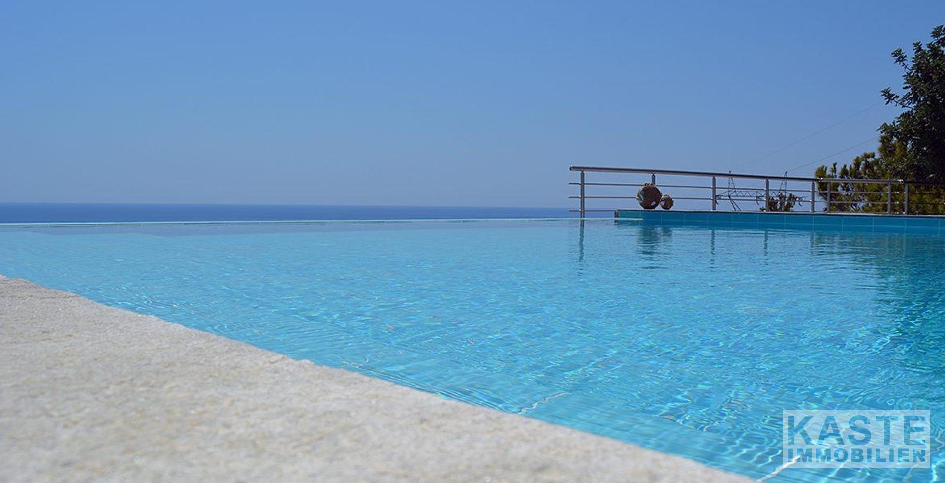 Exterieur: Stilvoll und durchdacht gestaltet Die Zufahrt zur Villa erfolgt über ein gesichertes Tor und eine private, von Bäumen gesäumte Auffahrt, die direkt zu den gepflegten Gärten und dem Außenbereich führt. Der großzügige Bereich rund um den Infinity-Pool lädt dazu ein, die Sonne zu genießen, sich zu erfrischen oder die atemberaubende Aussicht von zwei schattigen Sitzbereichen aus zu bewundern. Diese eignen sich perfekt für Mahlzeiten im Freien oder zum Entspannen. Der gepflasterte Bereich um den Pool bietet zudem reichlich Platz für Sonnenliegen.