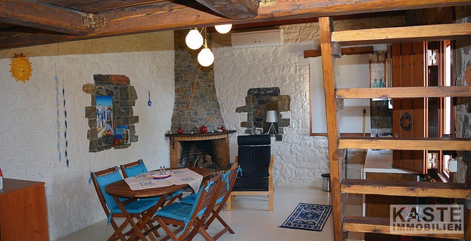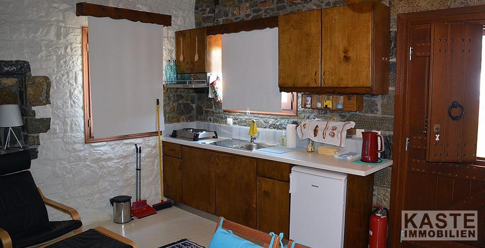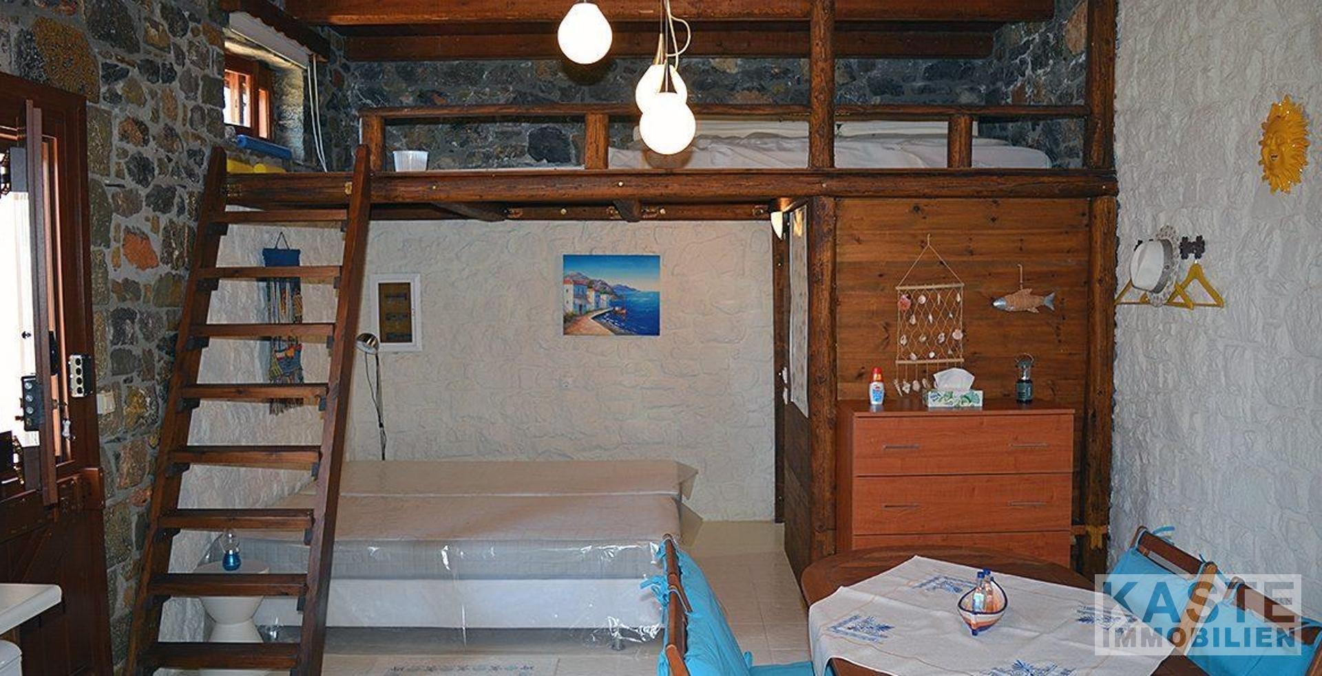 Charmantes Gästehaus: Tradition trifft Komfort Das separate Gästehaus ist im traditionellen kretischen Stil gestaltet. Holzbalken an der Decke, eine Natursteinwand und ein offener Kamin verleihen dem Raum ein authentisches, gemütliches Ambiente. Der offene Grundriss wurde geschickt durch ein Hochbett ergänzt, sodass das Gästehaus Platz für bis zu vier Personen bietet – perfekt für Besucher oder als zusätzliche Unterkunft.