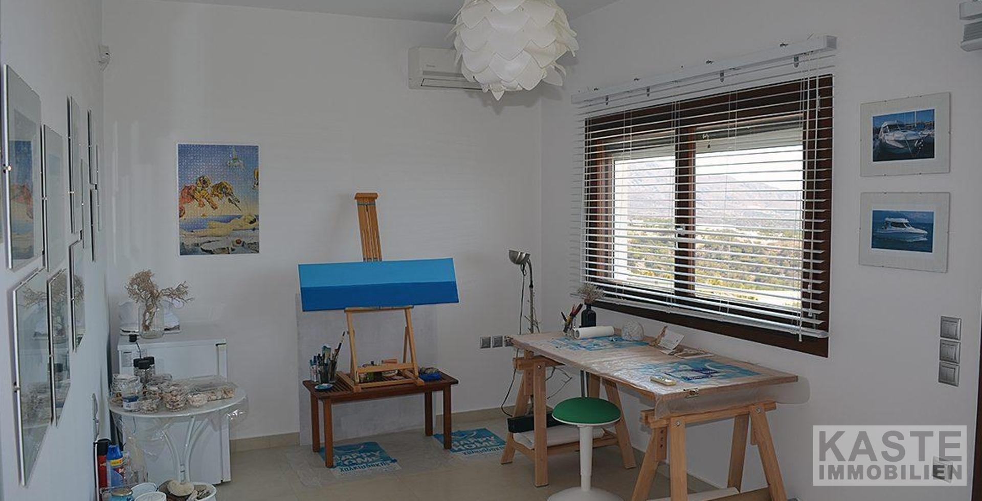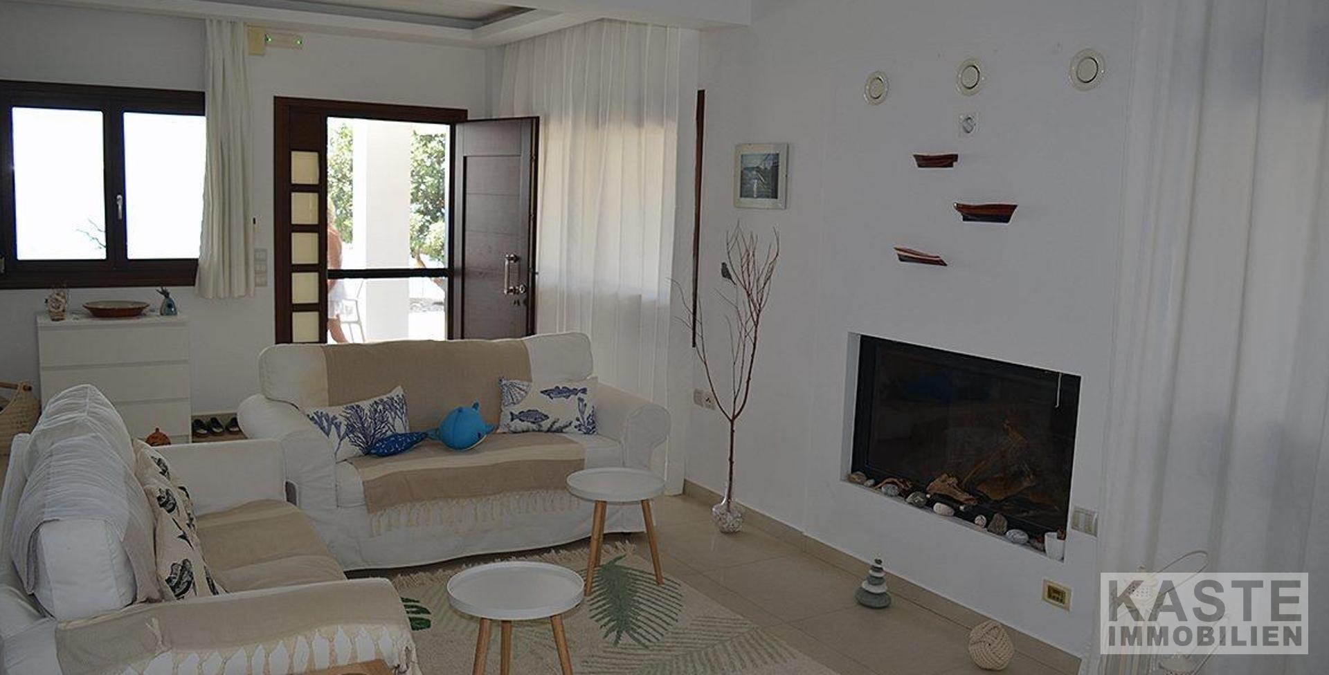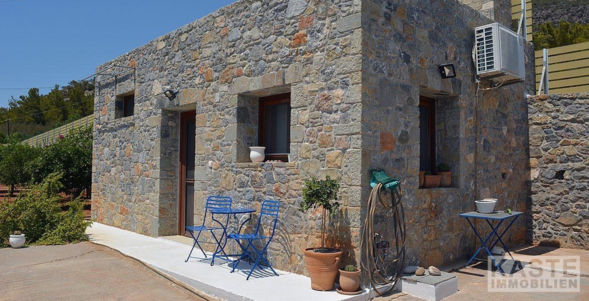 Charmantes Gästehaus: Tradition trifft Komfort Das separate Gästehaus ist im traditionellen kretischen Stil gestaltet. Holzbalken an der Decke, eine Natursteinwand und ein offener Kamin verleihen dem Raum ein authentisches, gemütliches Ambiente. Der offene Grundriss wurde geschickt durch ein Hochbett ergänzt, sodass das Gästehaus Platz für bis zu vier Personen bietet – perfekt für Besucher oder als zusätzliche Unterkunft.