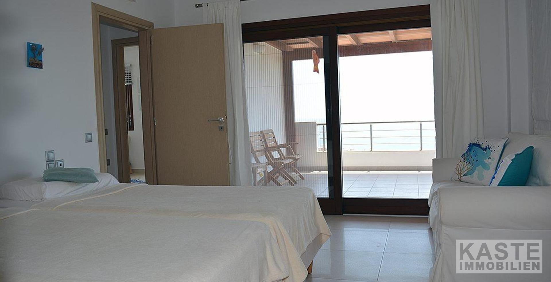 Erster Stock Eine elegante, gewölbte Treppe führt in die obere Etage mit drei großzügigen Schlafzimmern: - Hauptschlafzimmer: Dieses helle und luxuriöse Zimmer verfügt über ein Doppelbett, einen begehbaren Kleiderschrank und ein stilvolles Badezimmer mit Doppelwaschbecken und Whirlpool-Badewanne. Schiebetüren führen auf einen privaten, schattigen Balkon, der den perfekten Ort bietet, um die spektakuläre Aussicht zu genießen. - Zweites Schlafzimmer: Derzeit als Kunstatelier genutzt, bietet es Einbauschränke, große Fenster und Zugang zu einem Balkon mit Blick auf Pool, Meer und Berge. - Drittes Schlafzimmer: Ebenfalls sehr geräumig, mit Einbauschränken und eigenem Balkon. - Ein Gemeinschaftsbad mit begehbarer Dusche rundet diese Etage ab.