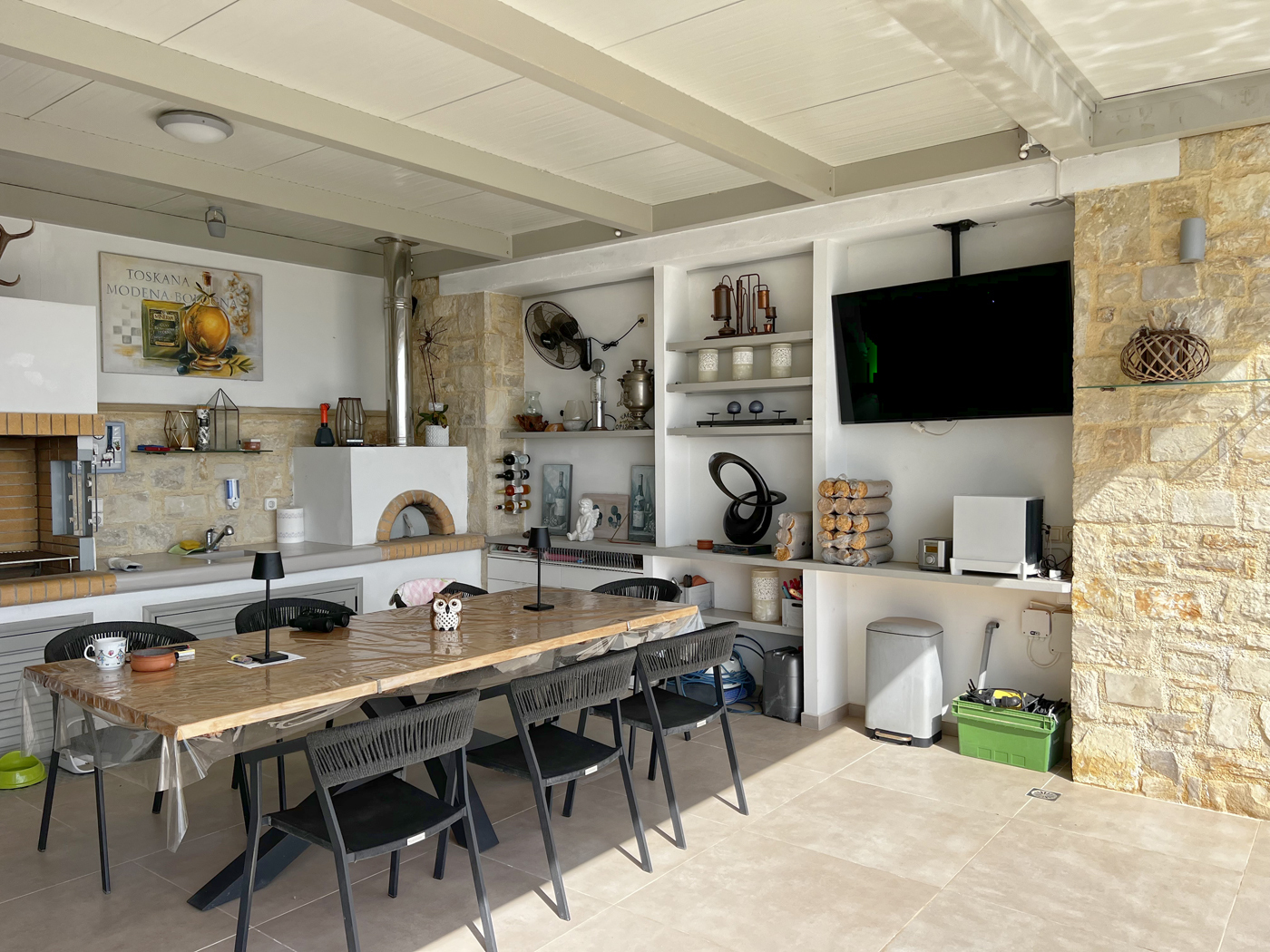 Für gesellige Stunden steht Ihnen eine wind- und wettergeschützte Außenküche zur Verfügung, ausgestattet mit einem großzügigen Grill und einem traditionellen Brotbackofen. Zudem können Sie hier fernsehen oder über das Dolby-Surround-System Ihre Lieblingsmusik genießen.
