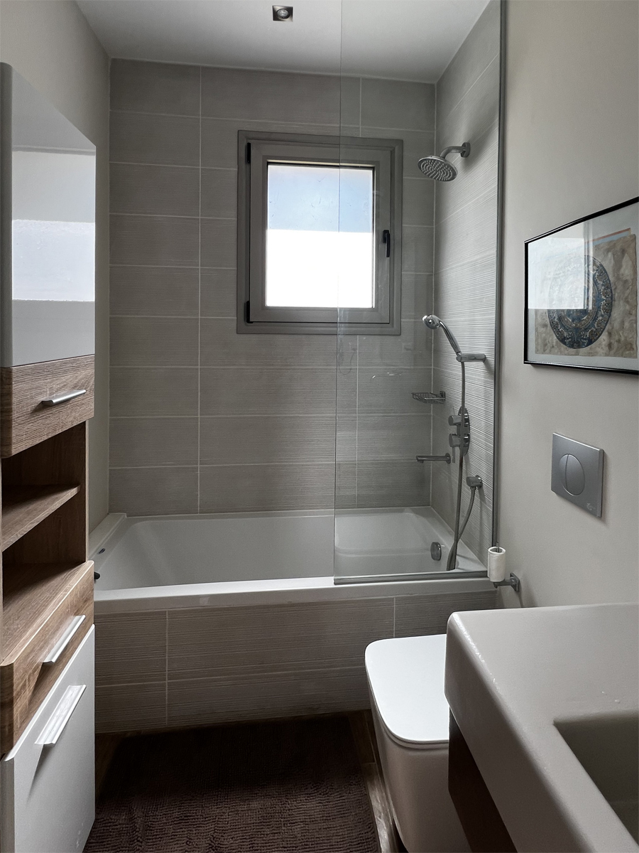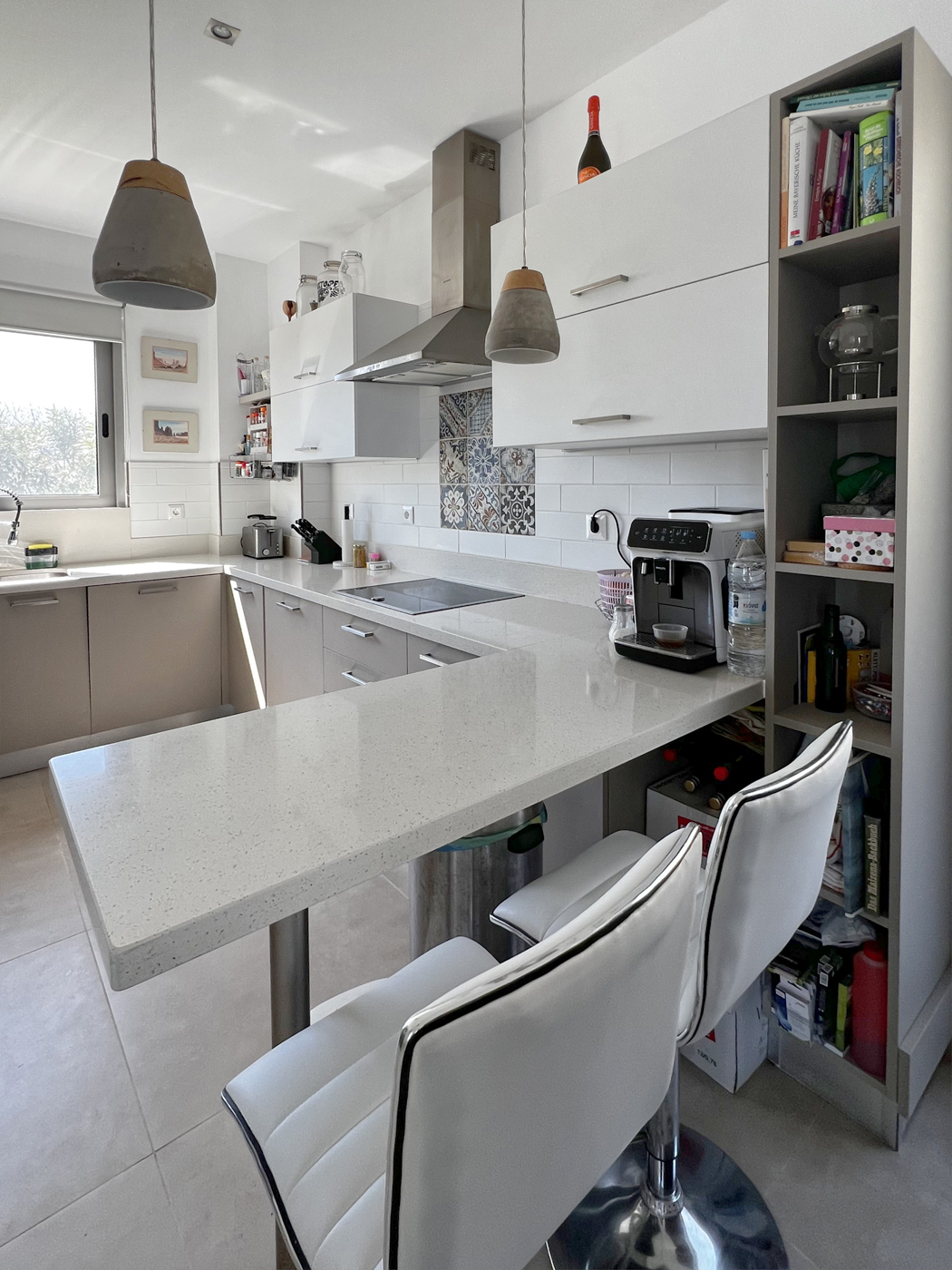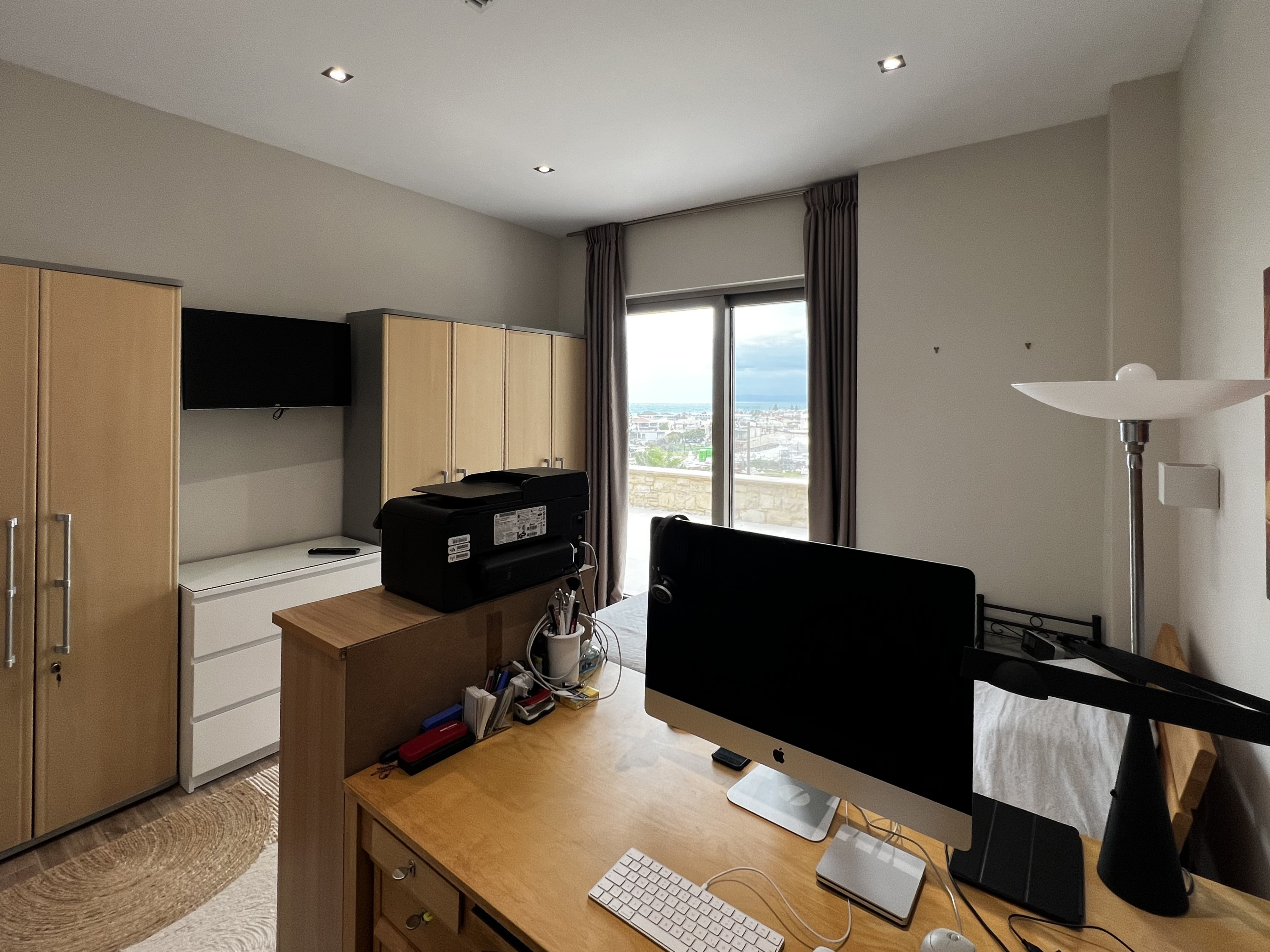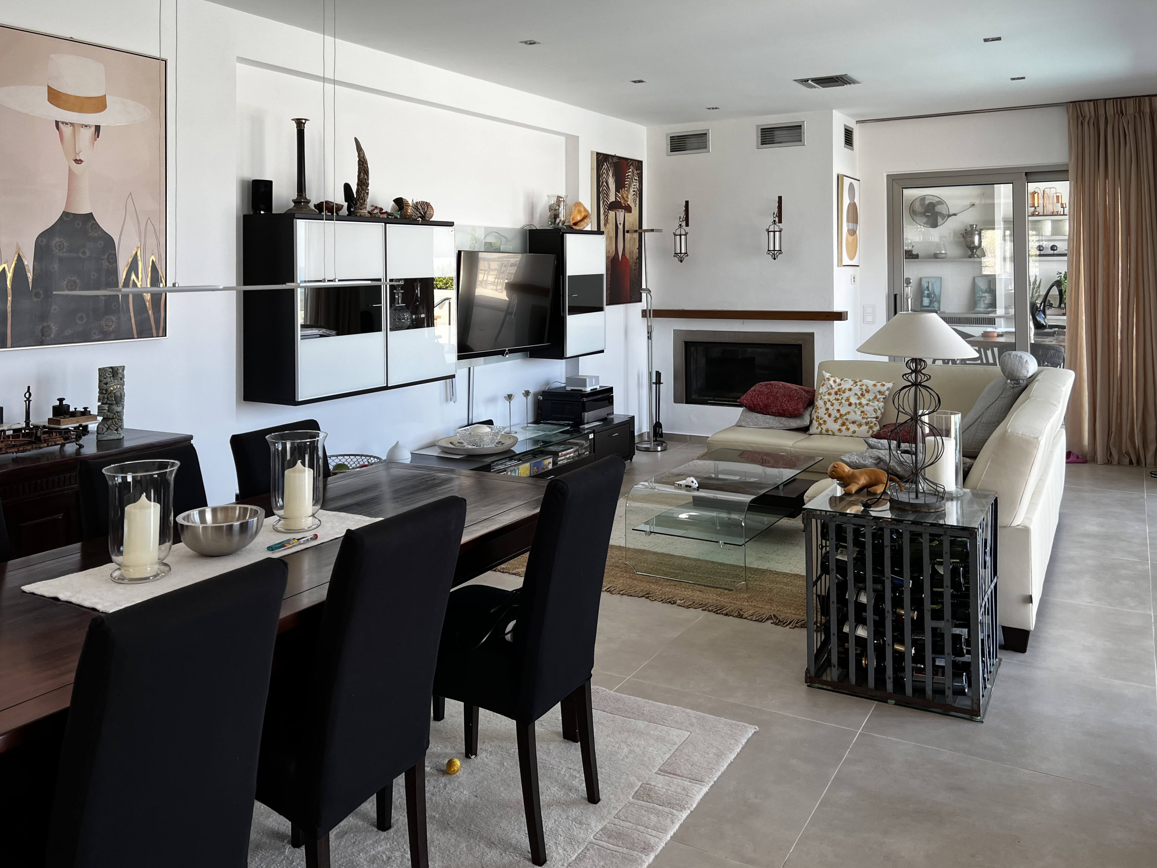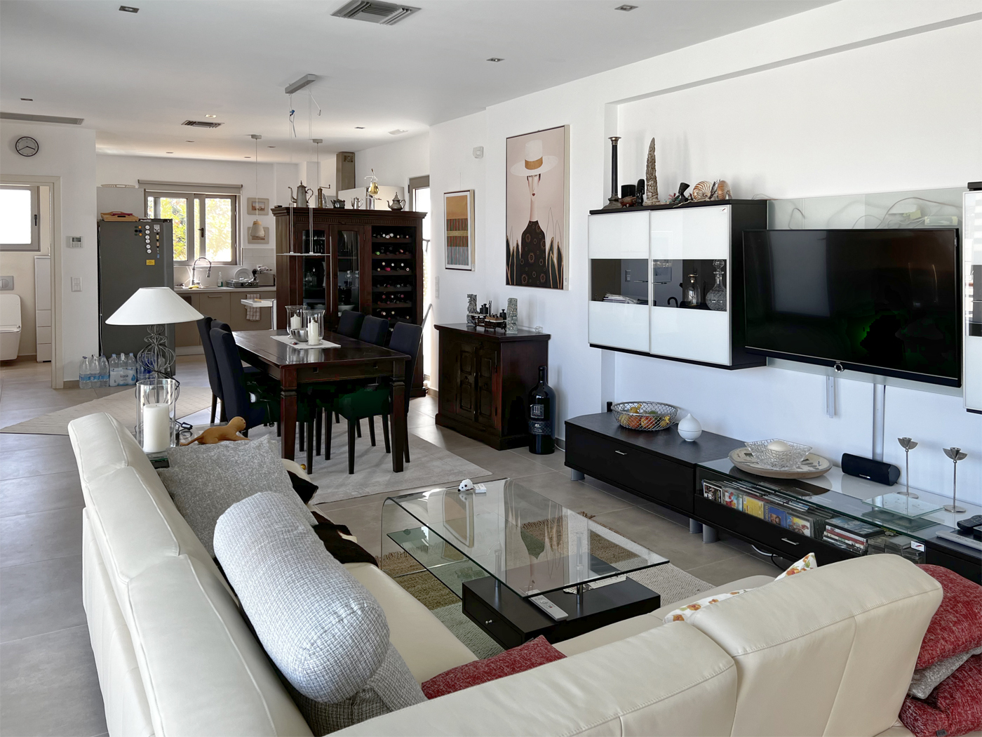 Beim Betreten der Villa gelangen Sie in die obere Etage, die einen weitläufigen Wohnbereich umfasst. Hier befinden sich das stilvolle Wohnzimmer mit offenem Öko-Kamin, der angrenzende Essbereich sowie die offene, moderne Küche mit hochwertigen Geräten – größtenteils von NEFF. Auf dieser Ebene finden Sie zudem ein Gäste-WC sowie den eleganten Master-Bedroom mit eigenem Duschbad und WC en suite. Von diesem Schlafzimmer aus haben Sie direkten Zugang zur größten Terrasse sowie zum beheizbaren Infinity-Pool. Der Pool wird mittels Wärmepumpe erwärmt und mit Salzwasser betrieben, was den Wartungsaufwand erheblich reduziert. Die dazugehörige Technik wurde vor einem Jahr auf den neuesten Stand gebracht und befindet sich in einem separaten Raum unter der Terrasse. Die Wärmepumpe kann bequem per App gesteuert werden. LED-Unterwasserscheinwerfer sorgen auf Wunsch für stimmungsvolle Beleuchtung in verschiedenen Farben, ebenfalls per App oder Fernbedienung bedienbar.