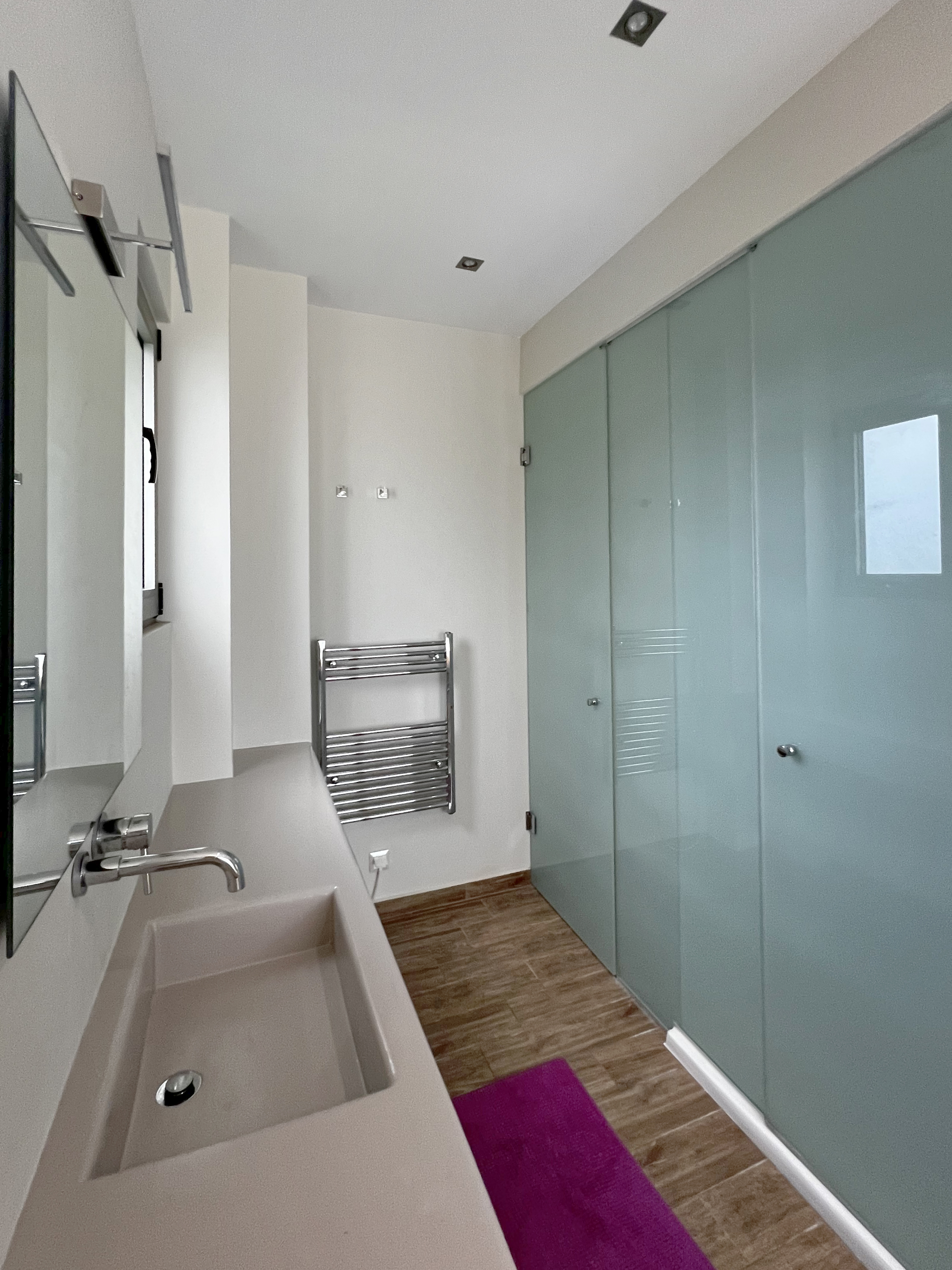 Eine stilvolle, mit indirekter Beleuchtung versehene Innentreppe führt in die untere Etage. Hier erwarten Sie zwei weitere geräumige Schlafzimmer, jeweils mit eigenem Bad – eines mit Dusche, das andere mit Badewanne. Beide Schlafzimmer verfügen über deckenhohe Schwebetürenschränke sowie große Fensterfronten mit abschließbaren Fliegengittern. Die untere Etage bietet zudem einen separaten Eingang, sodass Gäste direkt Zugang erhalten können. Alle Schlafzimmer sind mit einer effizienten Wärmepumpe ausgestattet, die sowohl Heiz- als auch Kühlfunktionen bietet. Ein Waschraum sowie die Sicherheitstechnik der Villa befinden sich ebenfalls auf dieser Ebene.
