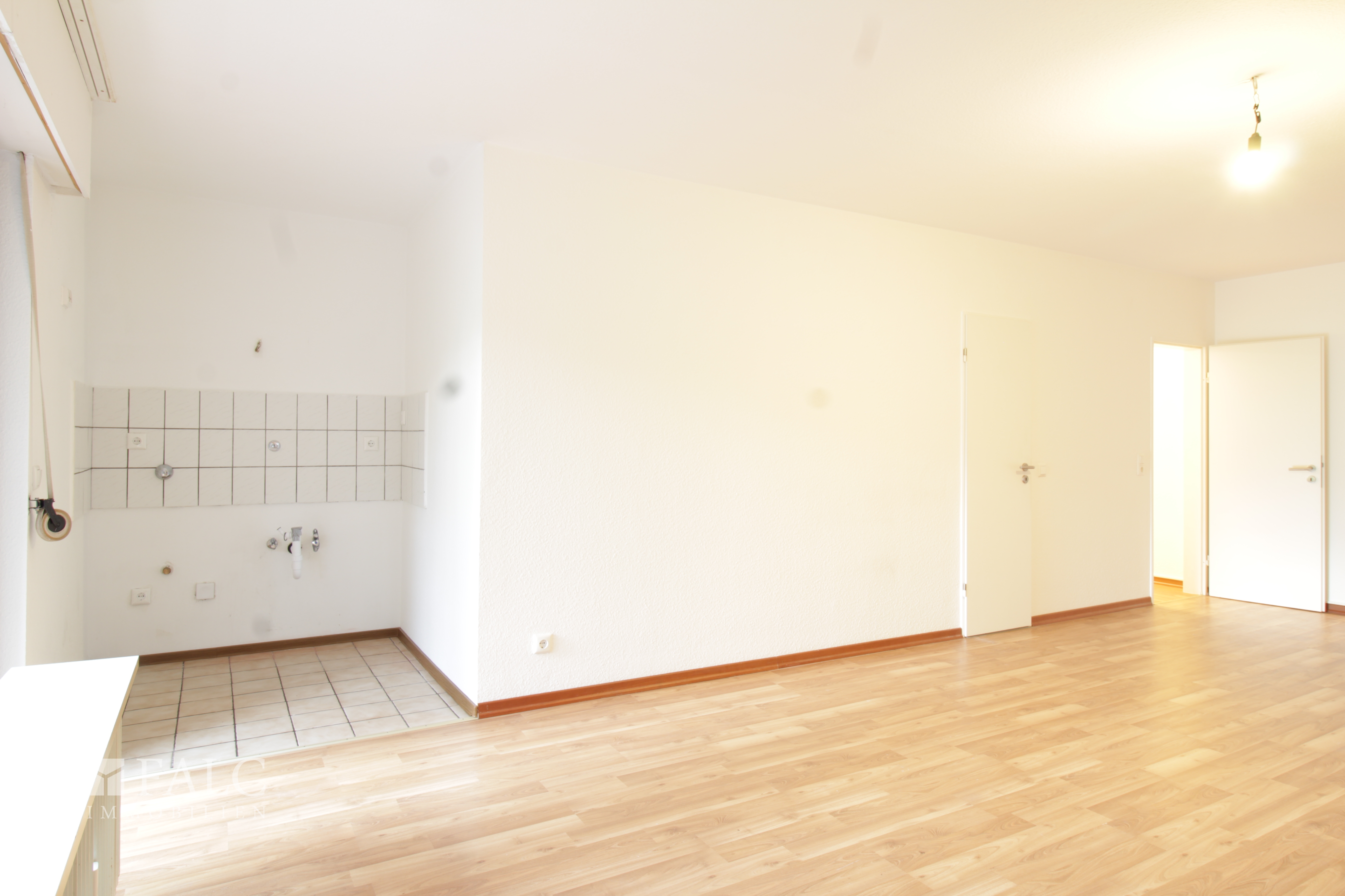 Die separate Kochnische ist weiß gefließt und bietet ausreichend Platz für die wichtigsten Küchenelemente.