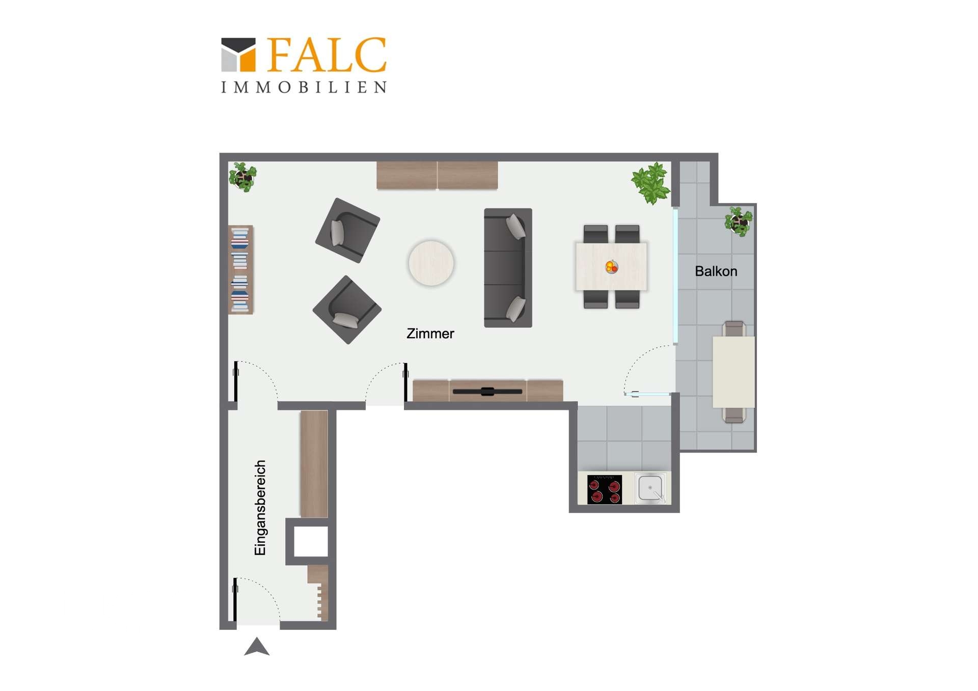 WohnzimmerWohnzimmer MöblierungsbeispielWohnzimmerKüchennischeEmpfangDuschbadBalkon mit Blick ins GrüneBalkon mit Blick ins GrüneGrundrissWohnzimmer Möblierungsbeispiel