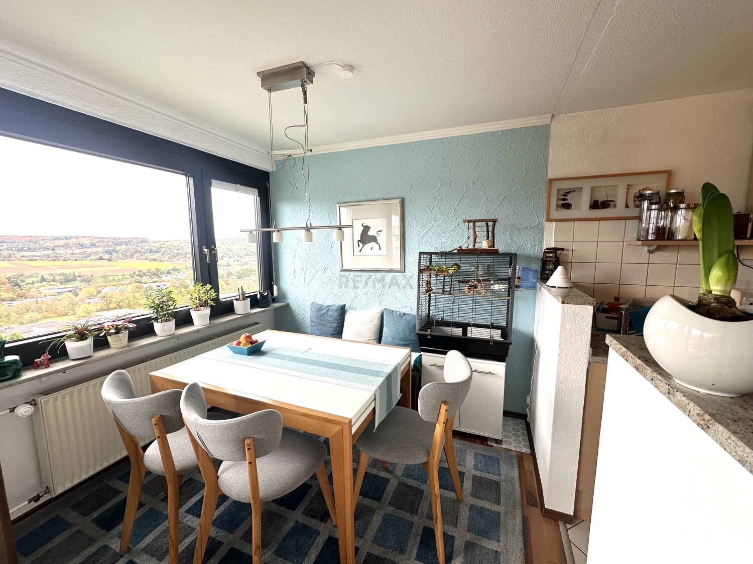 Vom Wohnbereich aus gelangen Sie direkt auf den sonnigen Balkon – hier genießen Sie einen wunderbaren Panoramablick bis nach Reutlingen und Tübingen. Eine Markise sorgt bei Bedarf für angenehme Schattenplätze.