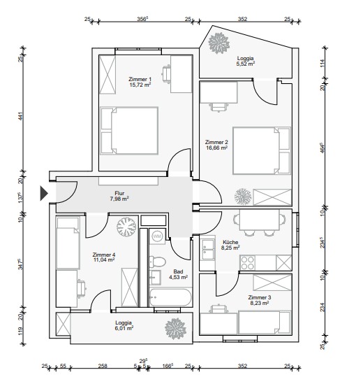 Balkon zum ZimmerMöbliertes Zimmer 3Neue EinbaukücheNeue Küche mit allen UtensilienZimmer 4 mit eigenem BalkonBalkon Zimmer 1Zimmer 1BadezimmerFlurGrundrissZimmer 2 mit eigenem Bakon