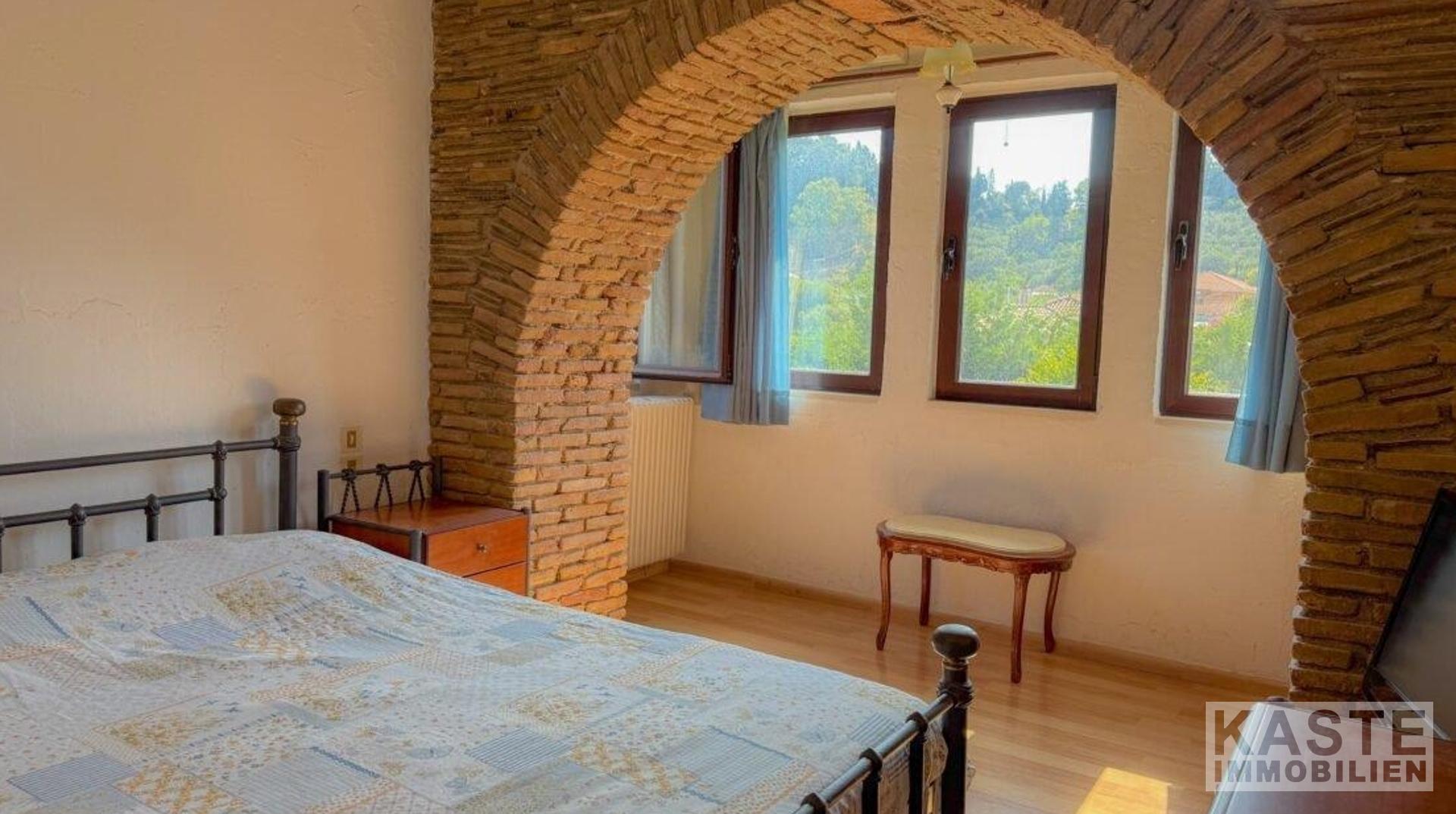 Die Wohnfläche von insgesamt 132 m² erstreckt sich über den ersten Stock, welcher behutsam mit traditionellen architektonischen Merkmalen wie freiliegenden Holzbalken und eleganten Ziegelbögen in den Schlafzimmern gestaltet wurde. Diese Details verleihen der Villa ihr unverwechselbares mediterranes Flair. Drei großzügig geschnittene Schlafzimmer und ein modernes Familienbadezimmer bieten ideale Raumverhältnisse für anspruchsvolles Wohnen und Entspannung. Der offene Wohnbereich mit geschmackvoll positionierten Fenstern eröffnet beeindruckende Ausblicke auf die umliegenden Berge und die Natur, welche durch einen Balkon mit atemberaubendem Meerblick ergänzt werden. Somit haben Bewohner die Möglichkeit, die herrliche Atmosphäre und Stimmungen der Insel in vollen Zügen zu genießen.