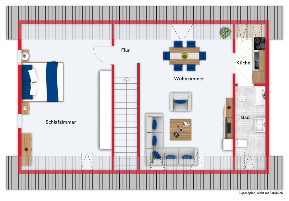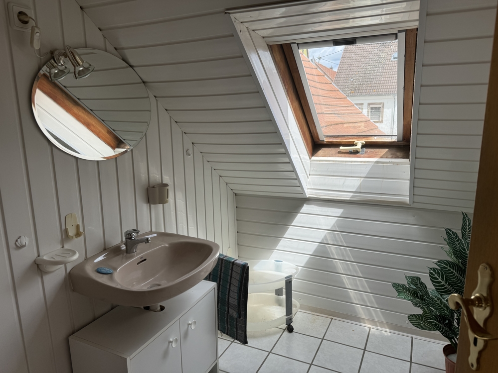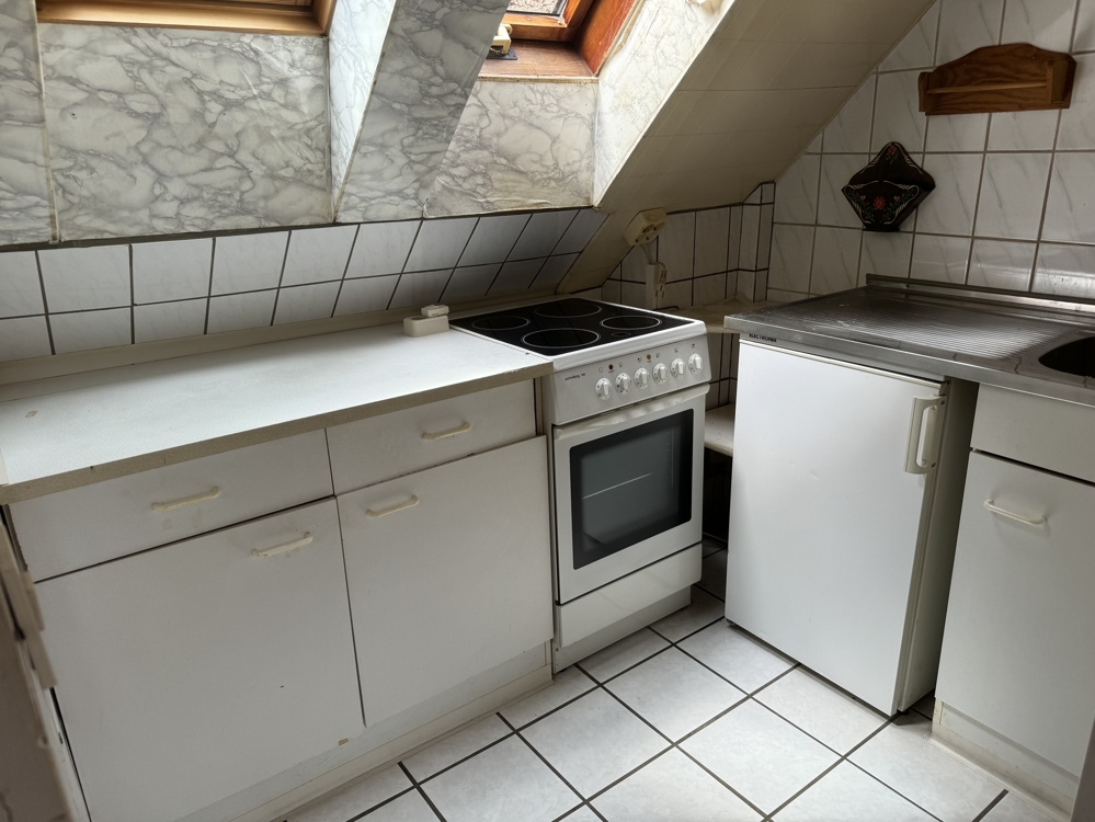 Im ausgebauten Dachgeschoss befindet sich der Flur, die Küche, Bad mit Dusche, Wohn-/Esszimmer und ein Schlafzimmer. Beheizt wird diese Etage mittels Ölofen.