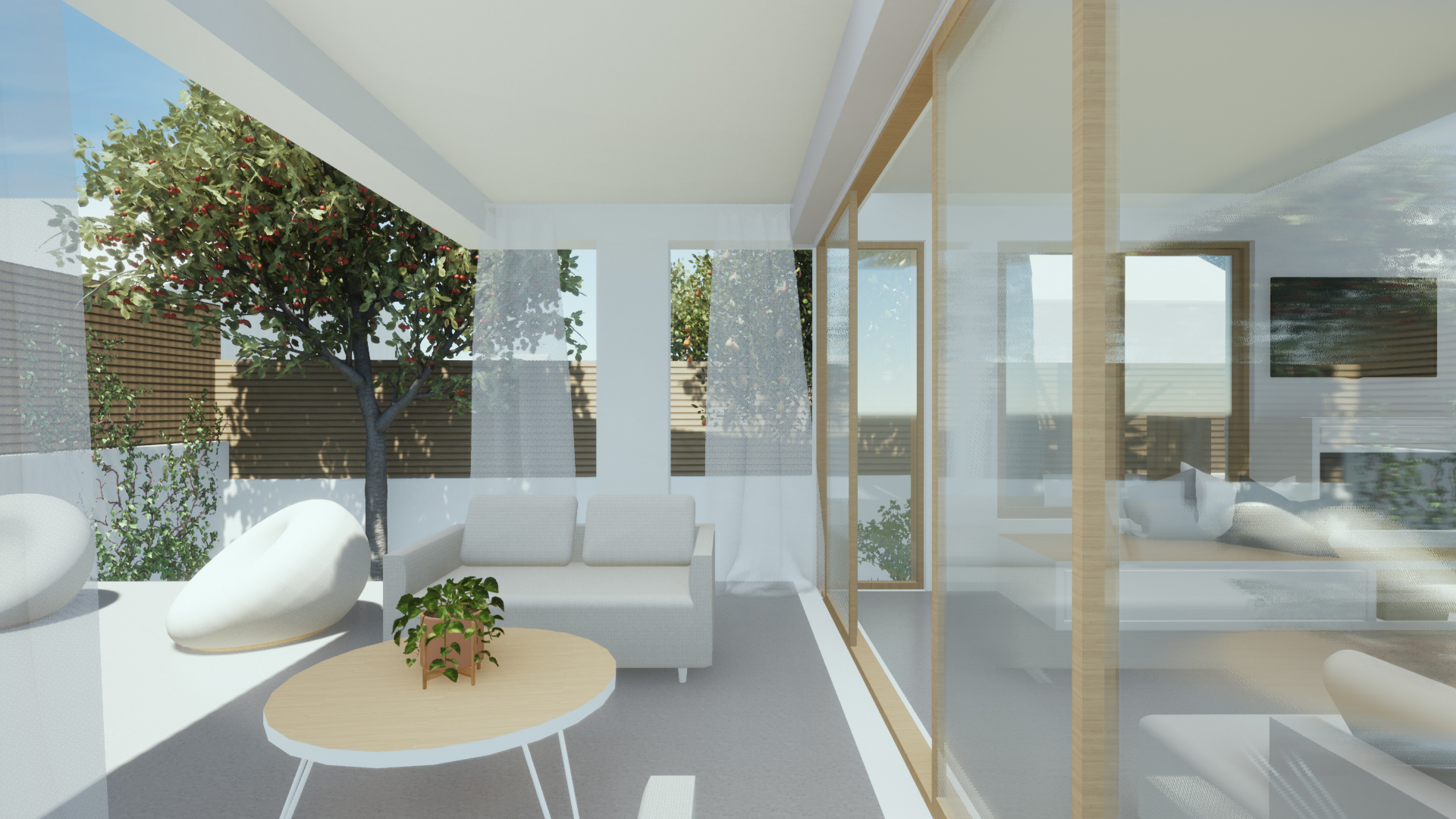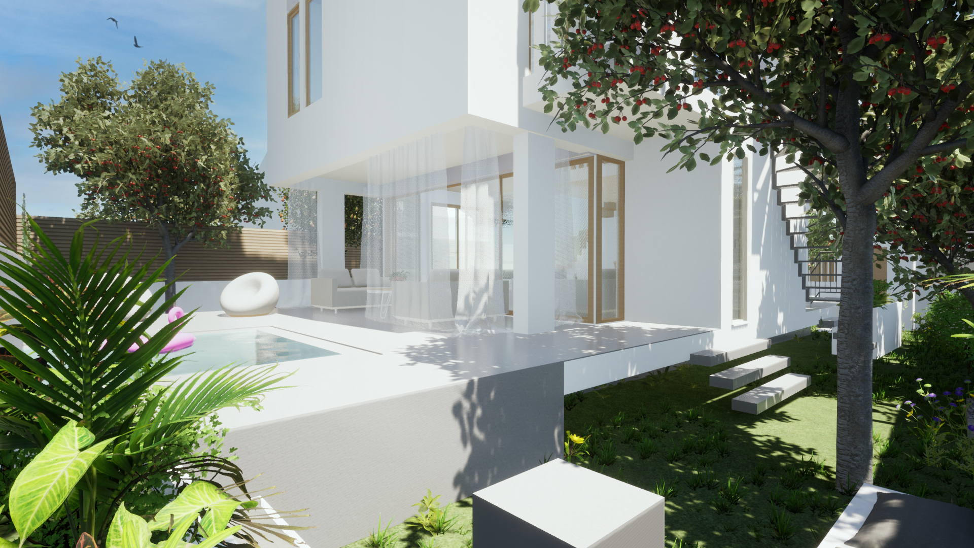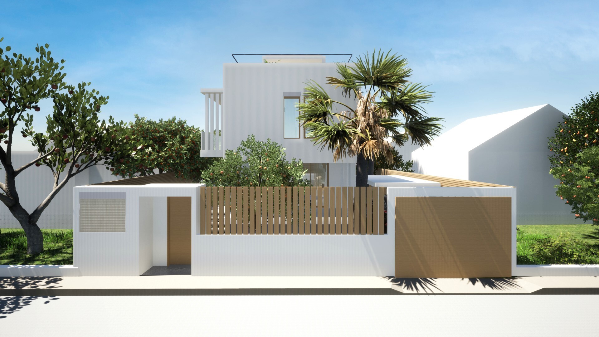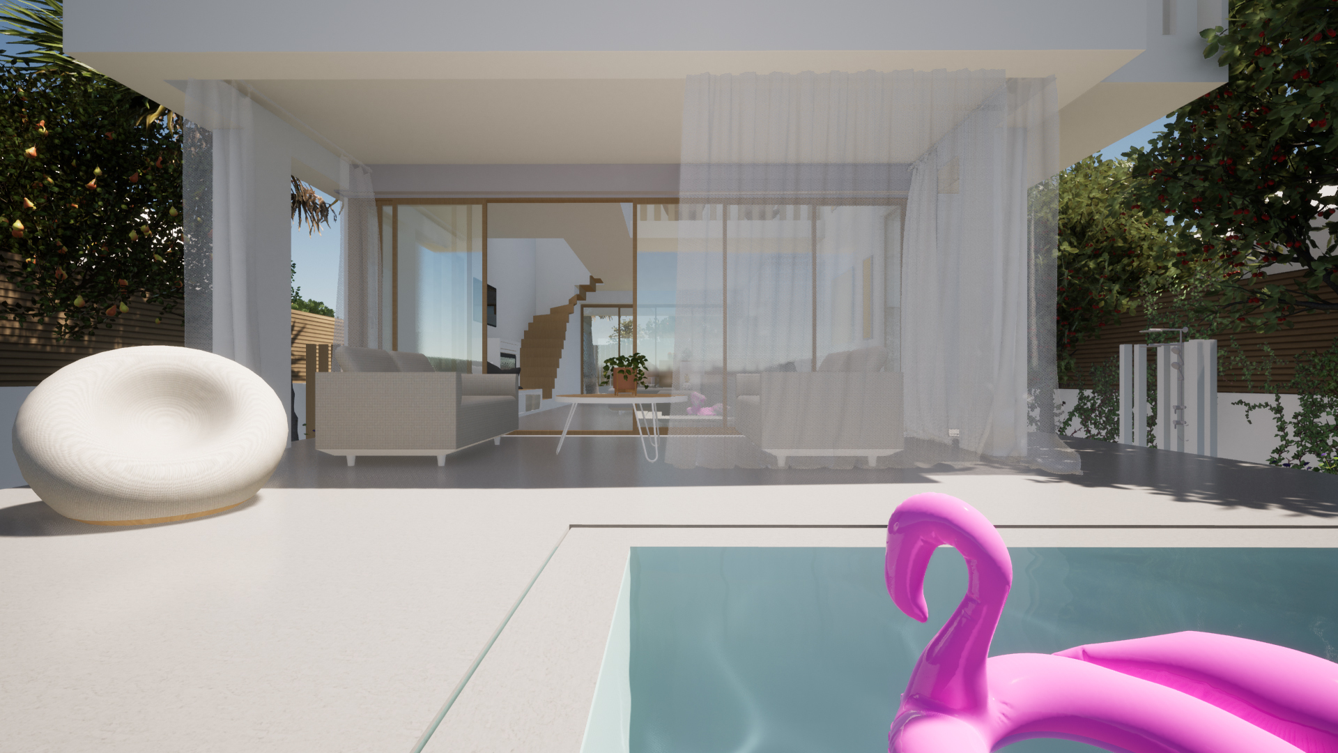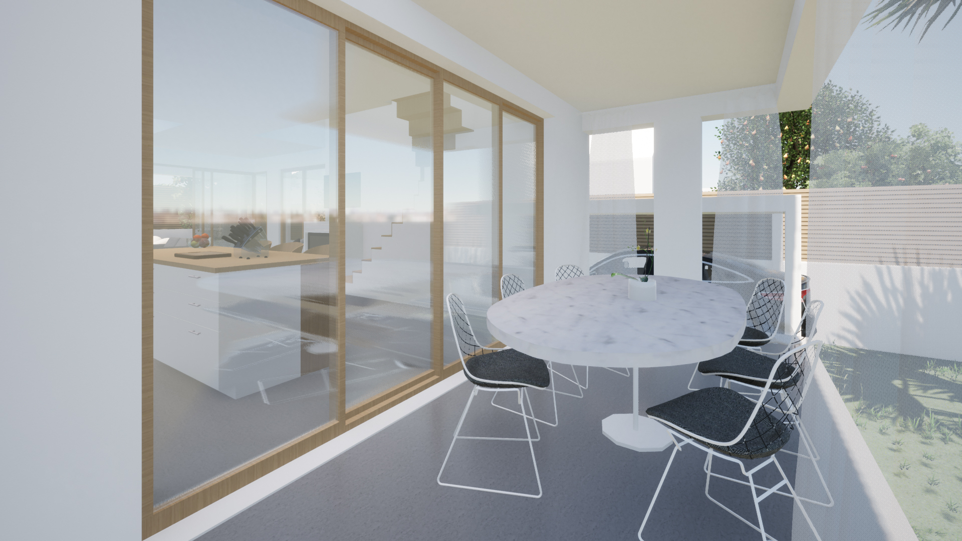 Architektonisches Konzept: Das Architektenhaus MAR zeichnet sich durch individuelle Planung aus. Zwei übereinandergelegte Körper bieten überdachte Bereiche zur Gartenseite und zur Straßenseite, erweitern den Innenraum geschickt und schaffen eine einzigartige Verbindung von Innen und Außen. Der Küchen- und Essbereich fließt nahtlos in die vordere überdachte Terrasse über, während das Wohnzimmer durch eine komplett zurückschiebare Glasfassade mit der Poolterrasse verbunden ist.