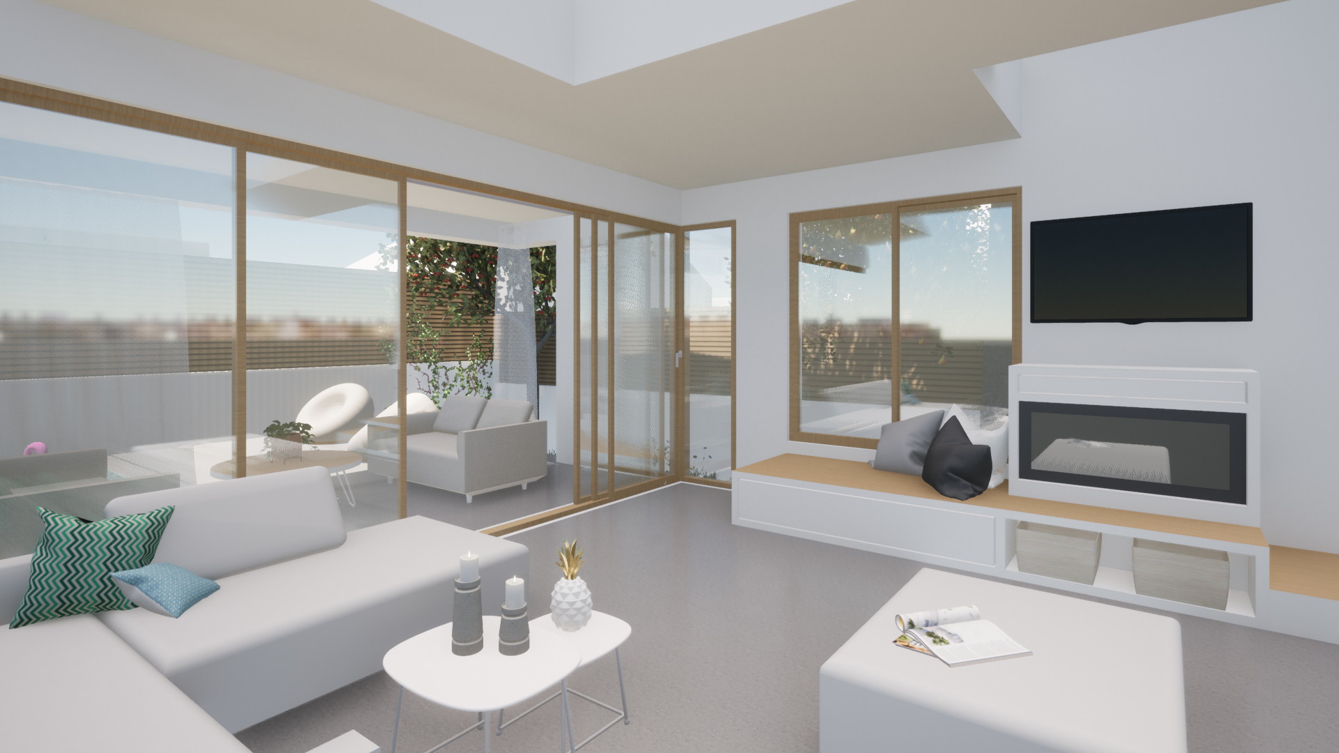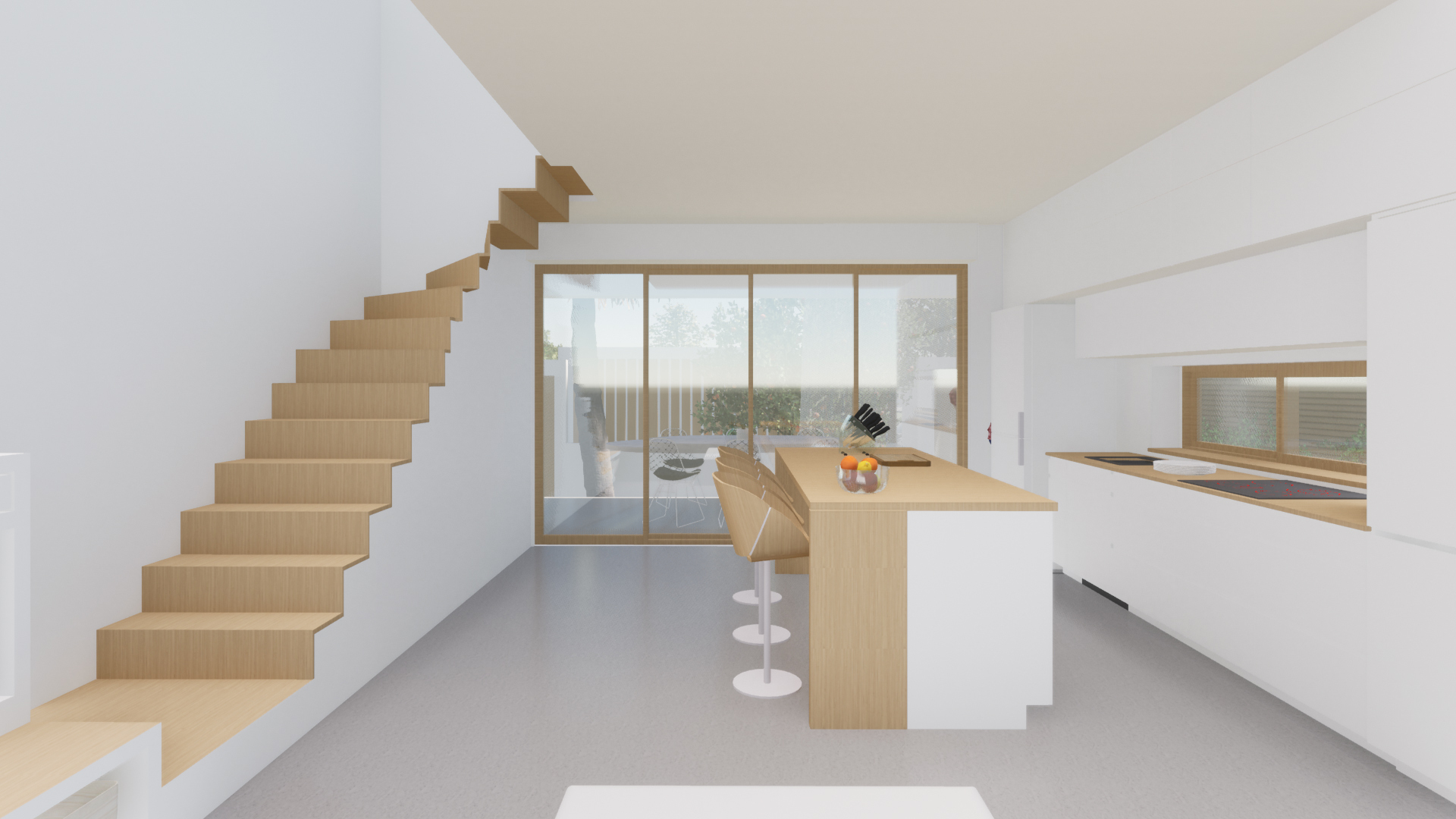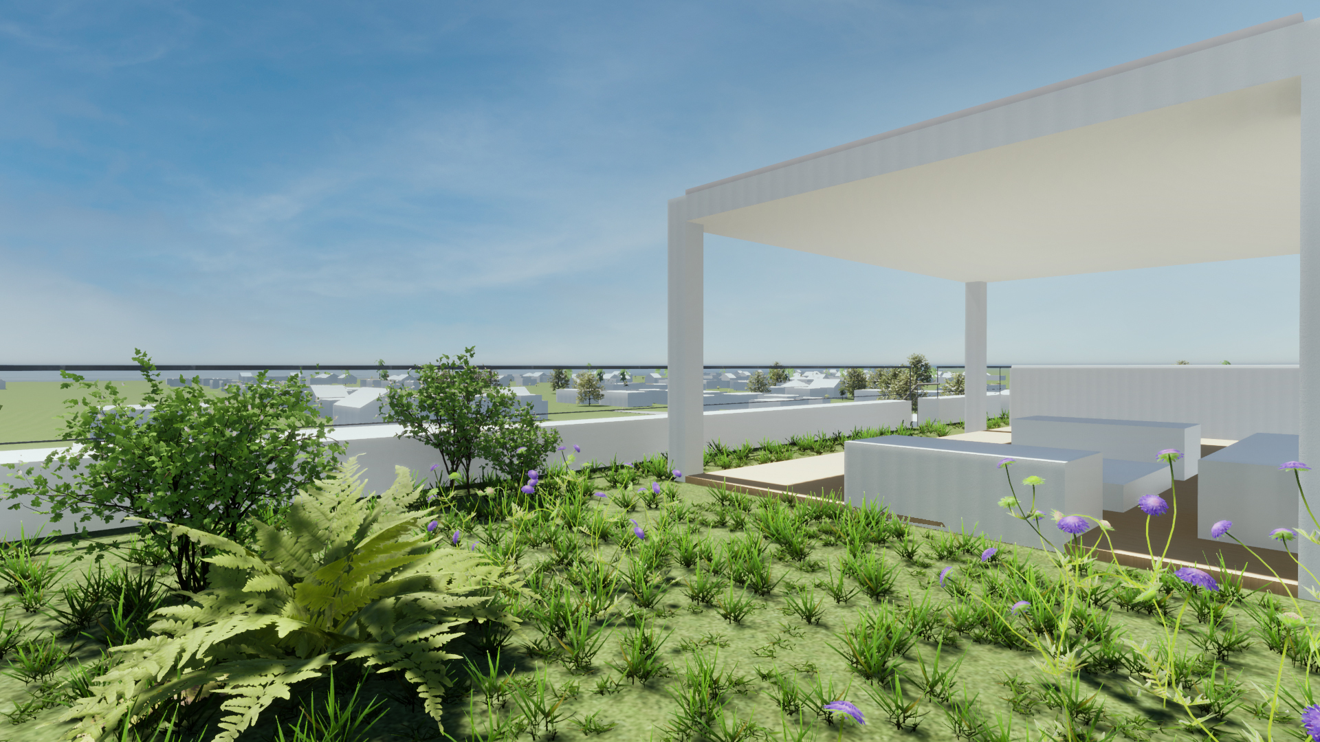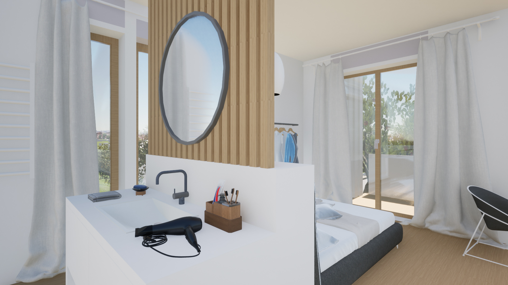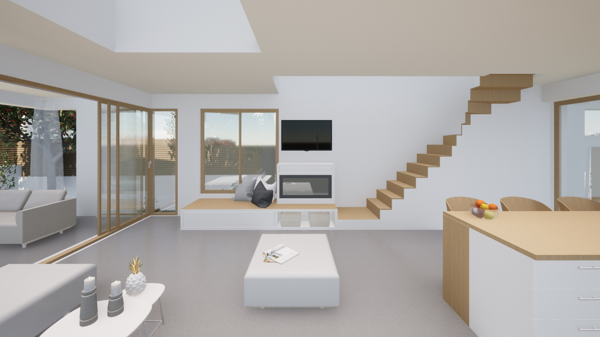 Architektonisches Konzept: Das Architektenhaus MAR zeichnet sich durch individuelle Planung aus. Zwei übereinandergelegte Körper bieten überdachte Bereiche zur Gartenseite und zur Straßenseite, erweitern den Innenraum geschickt und schaffen eine einzigartige Verbindung von Innen und Außen. Der Küchen- und Essbereich fließt nahtlos in die vordere überdachte Terrasse über, während das Wohnzimmer durch eine komplett zurückschiebare Glasfassade mit der Poolterrasse verbunden ist.