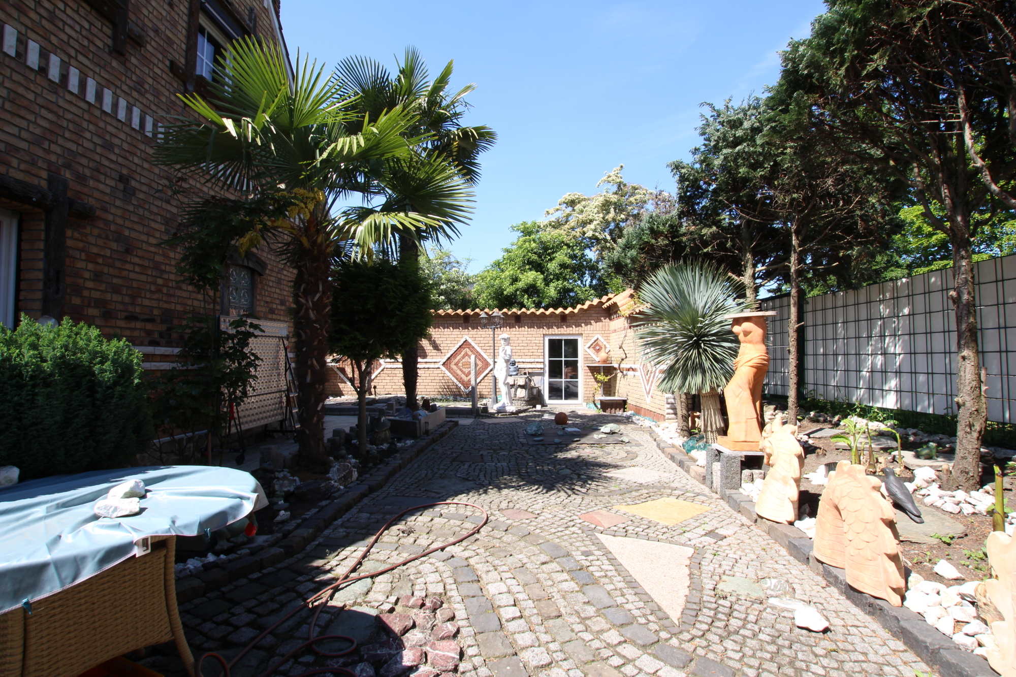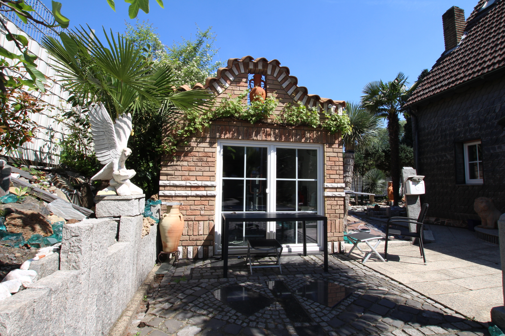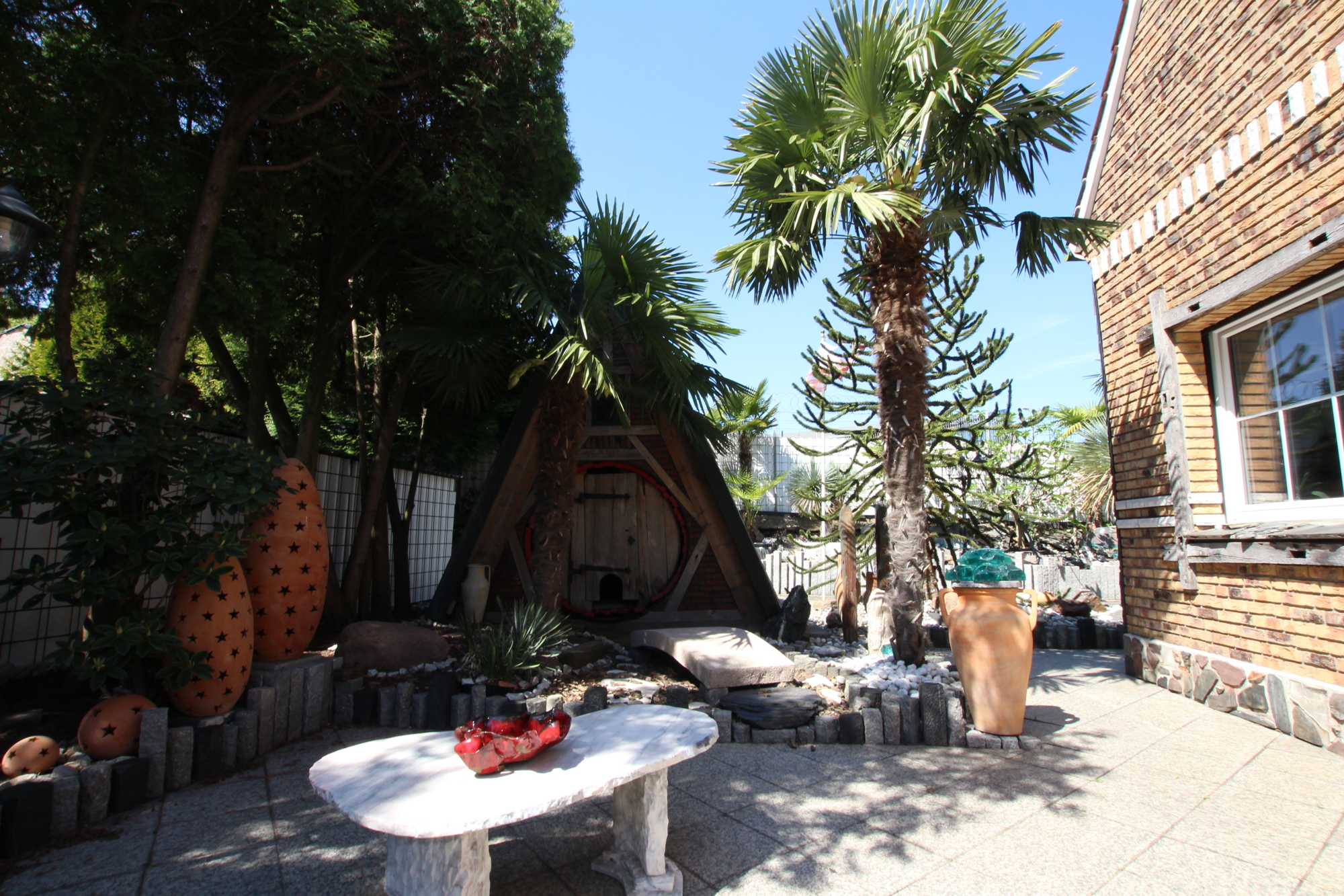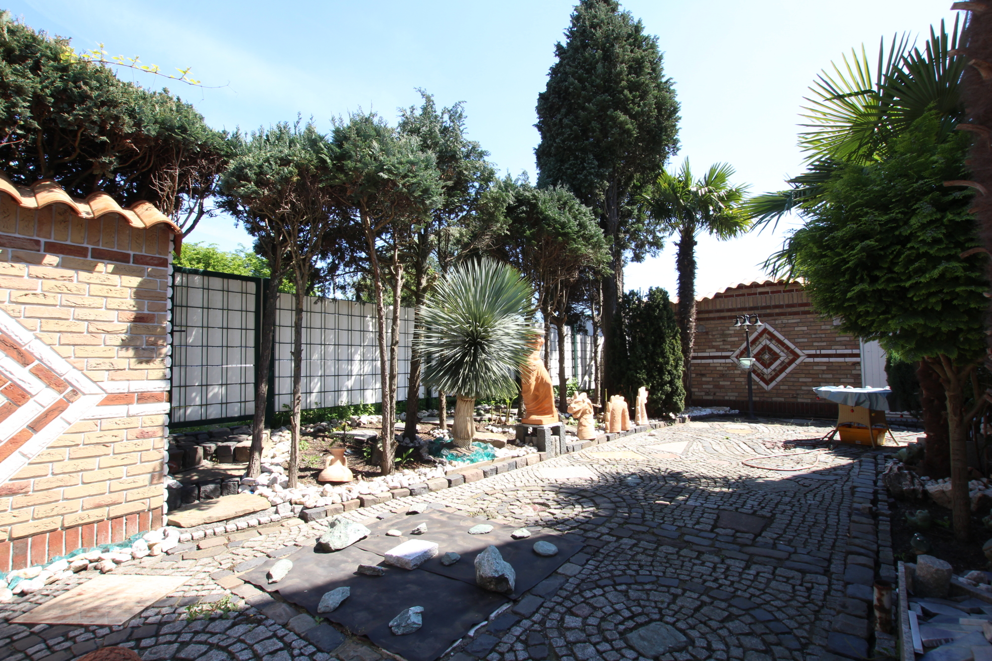 Bereits beim Betreten des Grundstücks mit ca. 536m² empfängt Sie ein einzigartig gestalteter Steingarten mit teilweise sechs Meter hohen Palmen, Feigenbäumen und Bananenbäumen, der an ferne Urlaubsorte erinnert. Der großzügige Außenbereich bietet mit Traubenranken und Olivenbäumen noch ein weiteres Highlight: ein separates Häuschen mit hochwertigem Granitboden ausgestattet, das als privater Fitness und Wellnessbereich dient. Hier finden sie eine Sauna samt Dusche, perfekt zum Entspannen nach einem langen Tag.