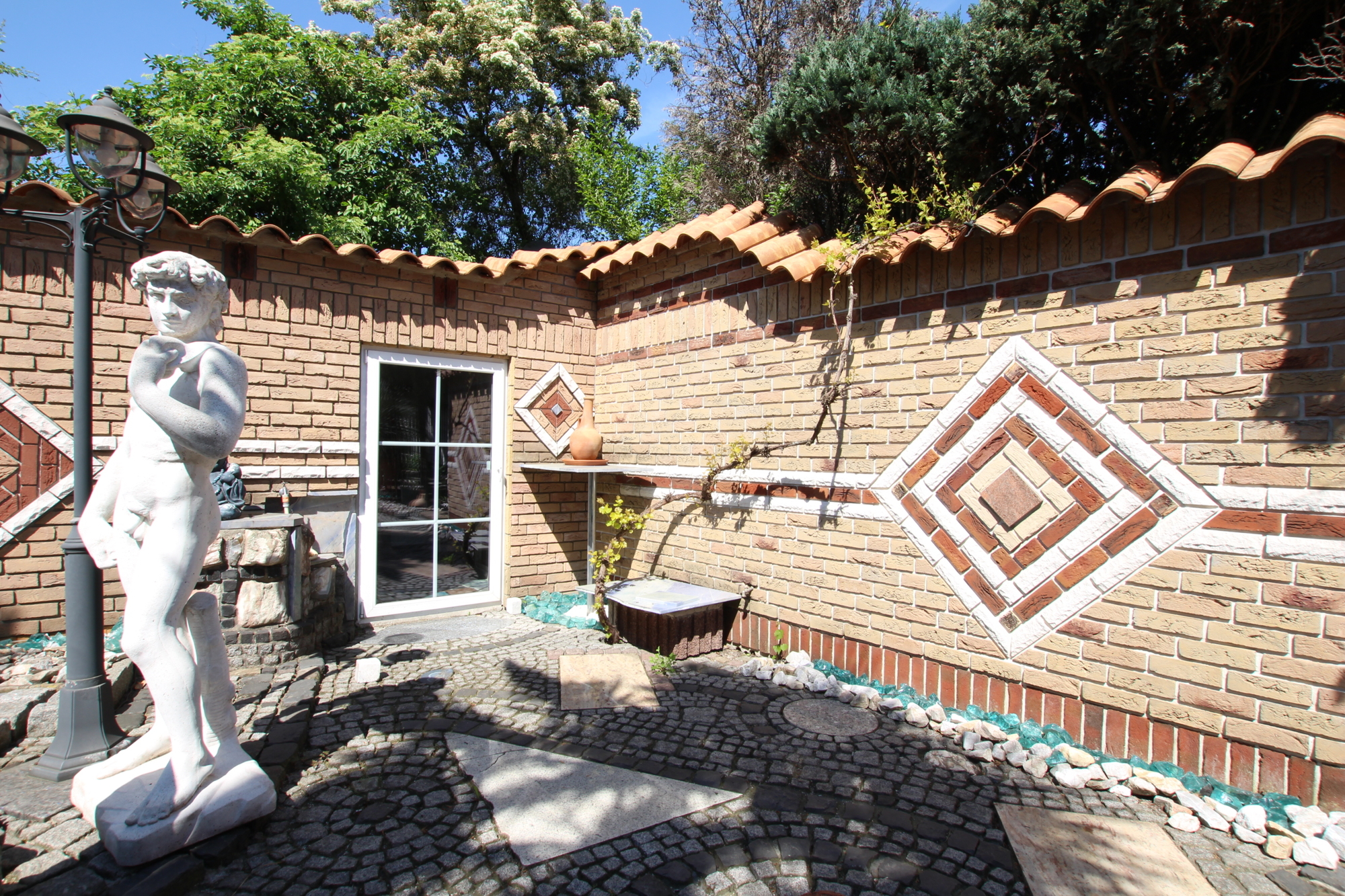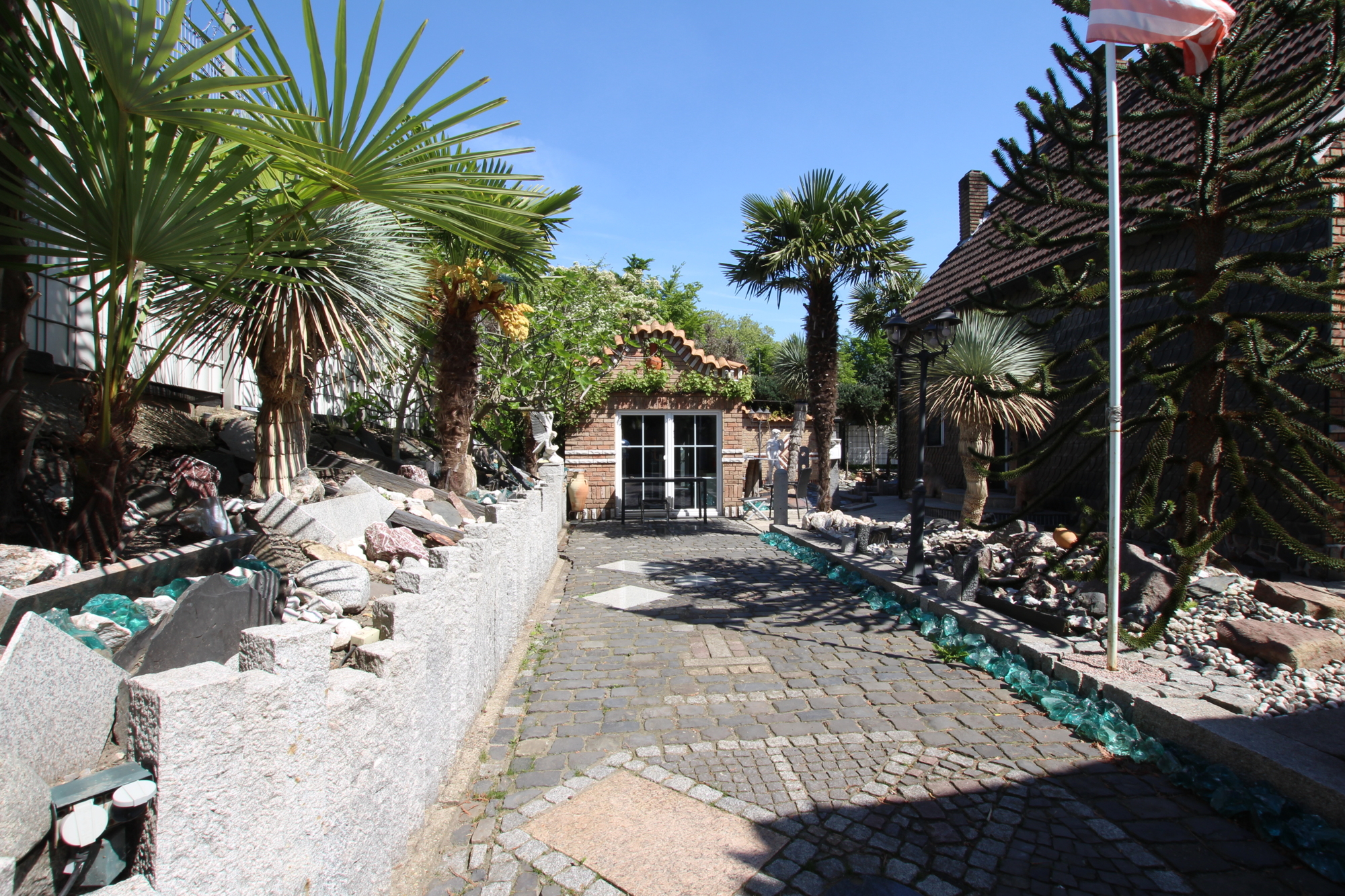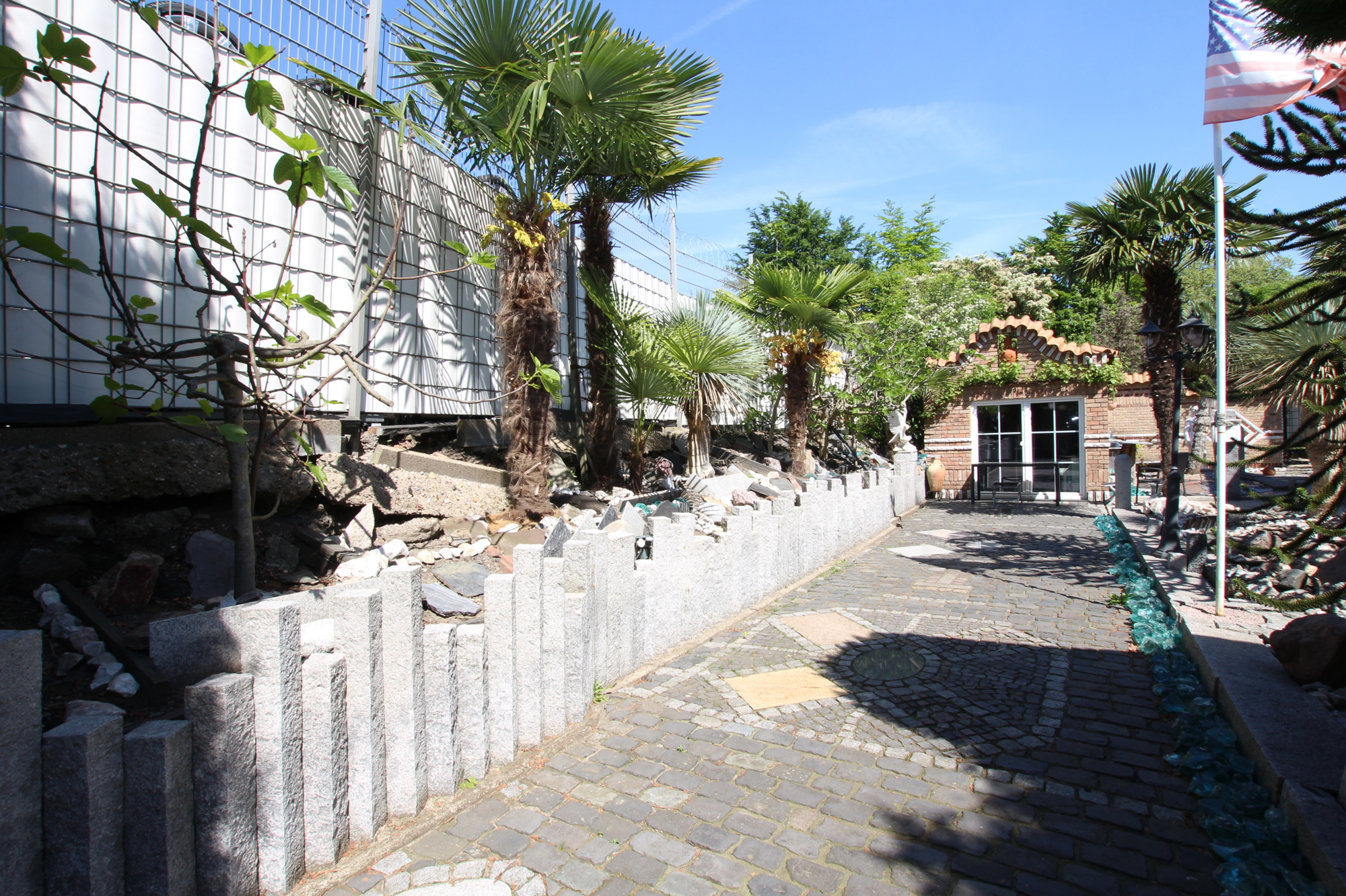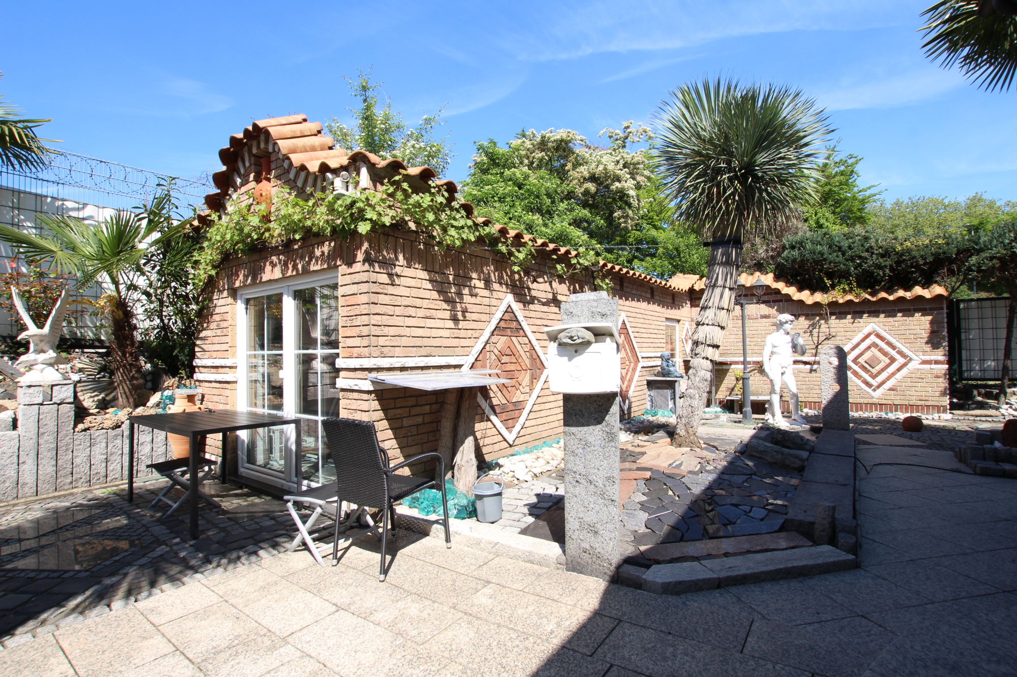 Bereits beim Betreten des Grundstücks mit ca. 536m² empfängt Sie ein einzigartig gestalteter Steingarten mit teilweise sechs Meter hohen Palmen, Feigenbäumen und Bananenbäumen, der an ferne Urlaubsorte erinnert. Der großzügige Außenbereich bietet mit Traubenranken und Olivenbäumen noch ein weiteres Highlight: ein separates Häuschen mit hochwertigem Granitboden ausgestattet, das als privater Fitness und Wellnessbereich dient. Hier finden sie eine Sauna samt Dusche, perfekt zum Entspannen nach einem langen Tag.