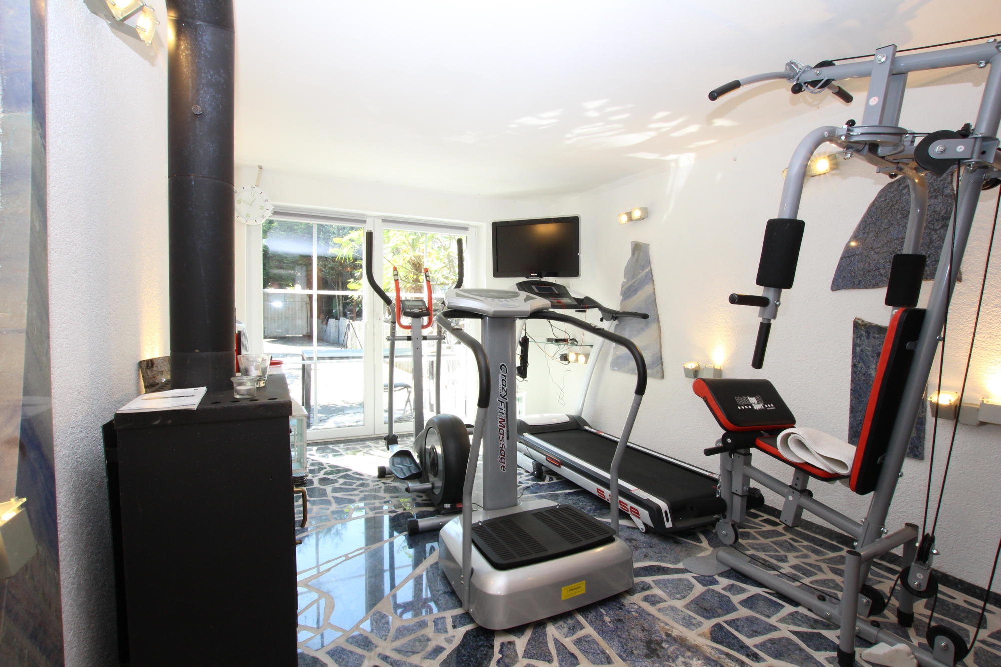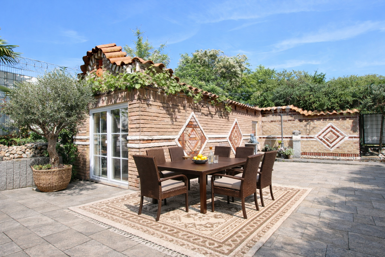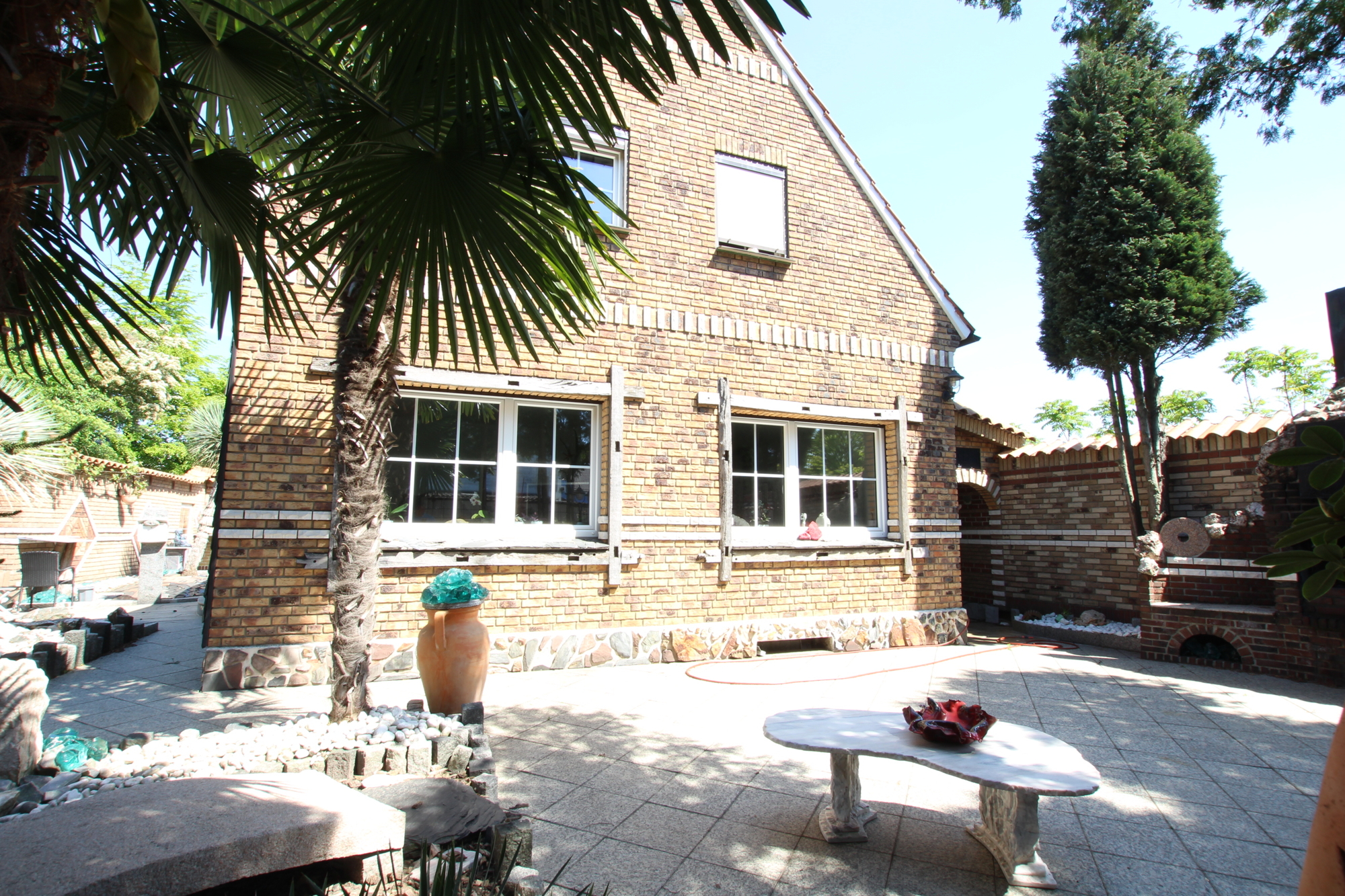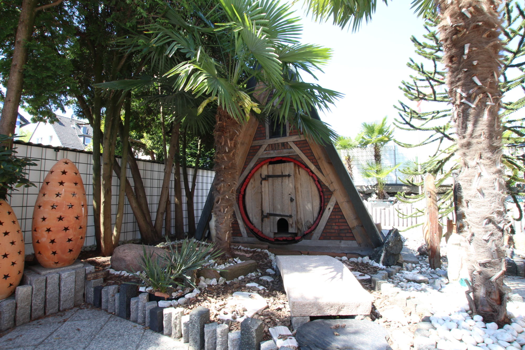 Bereits beim Betreten des Grundstücks mit ca. 536m² empfängt Sie ein einzigartig gestalteter Steingarten mit teilweise sechs Meter hohen Palmen, Feigenbäumen und Bananenbäumen, der an ferne Urlaubsorte erinnert. Der großzügige Außenbereich bietet mit Traubenranken und Olivenbäumen noch ein weiteres Highlight: ein separates Häuschen mit hochwertigem Granitboden ausgestattet, das als privater Fitness und Wellnessbereich dient. Hier finden sie eine Sauna samt Dusche, perfekt zum Entspannen nach einem langen Tag.