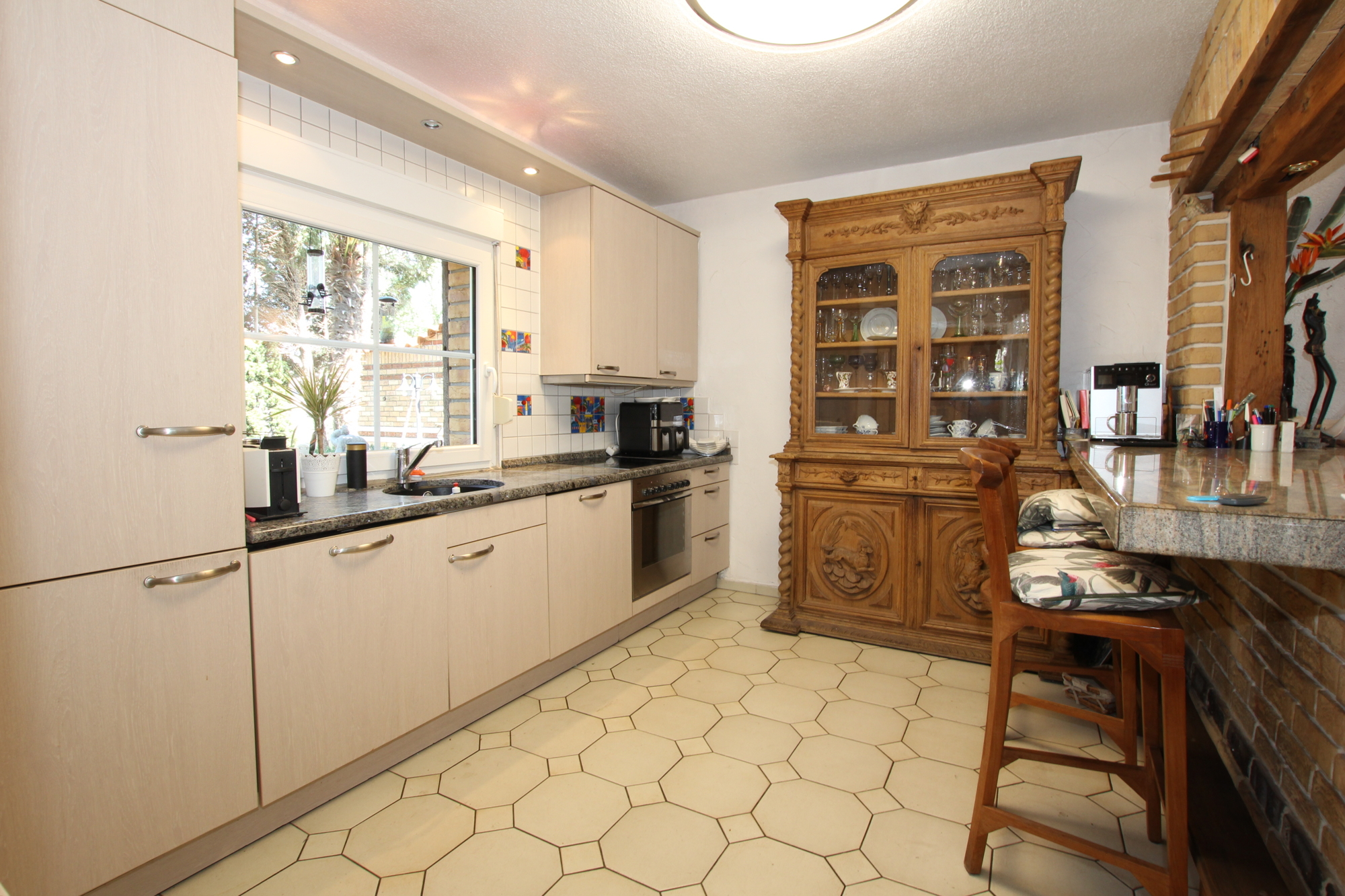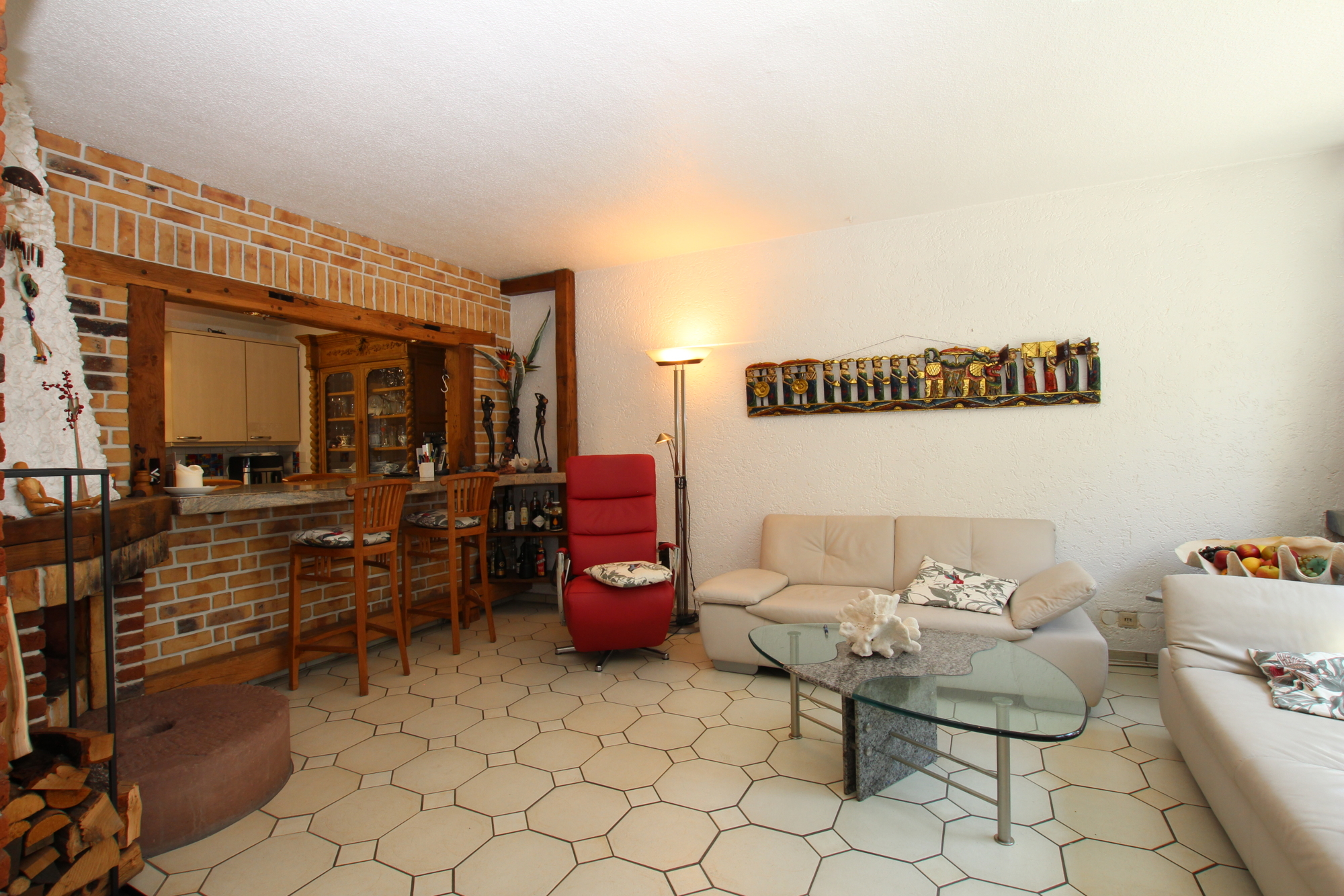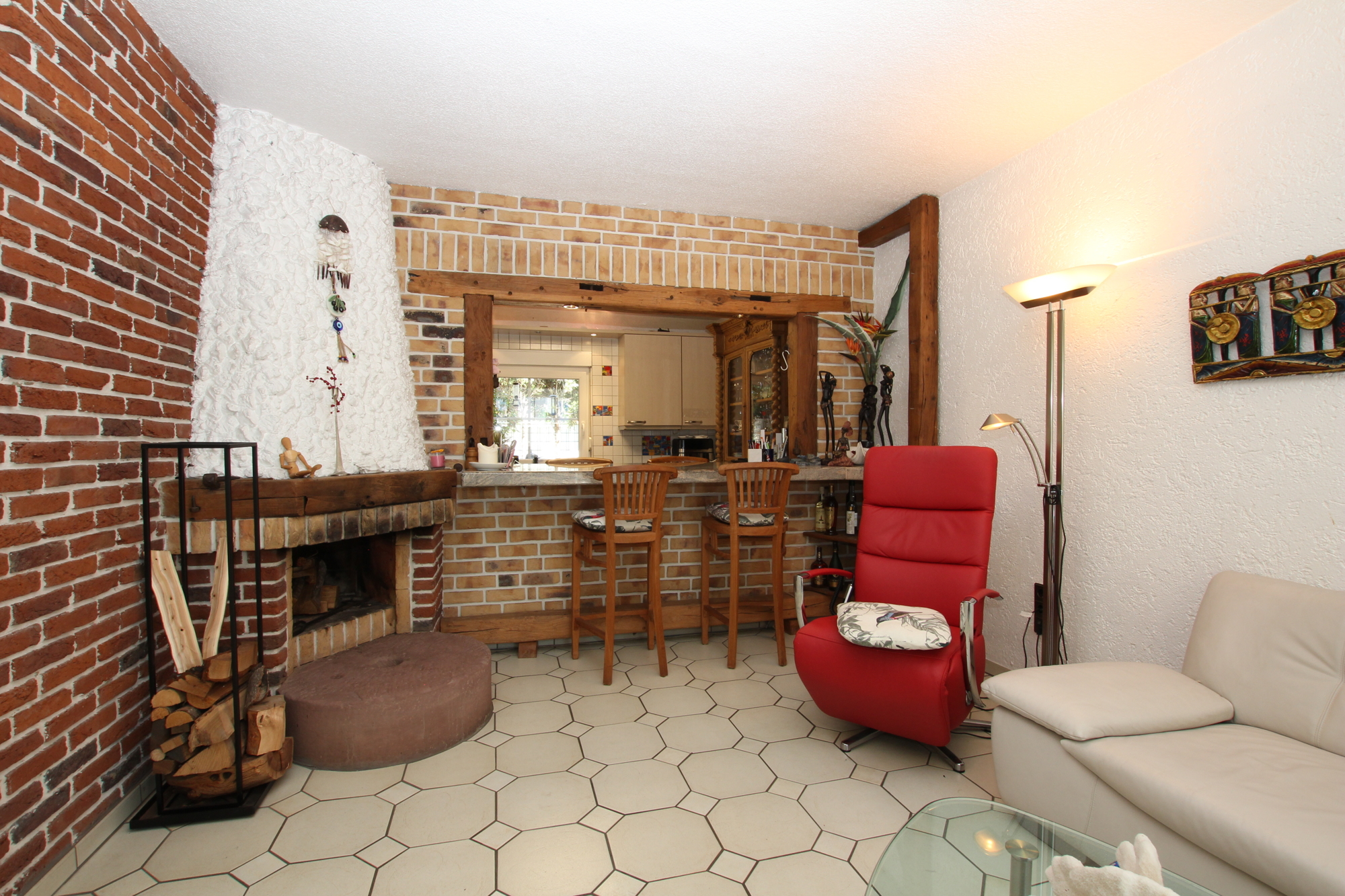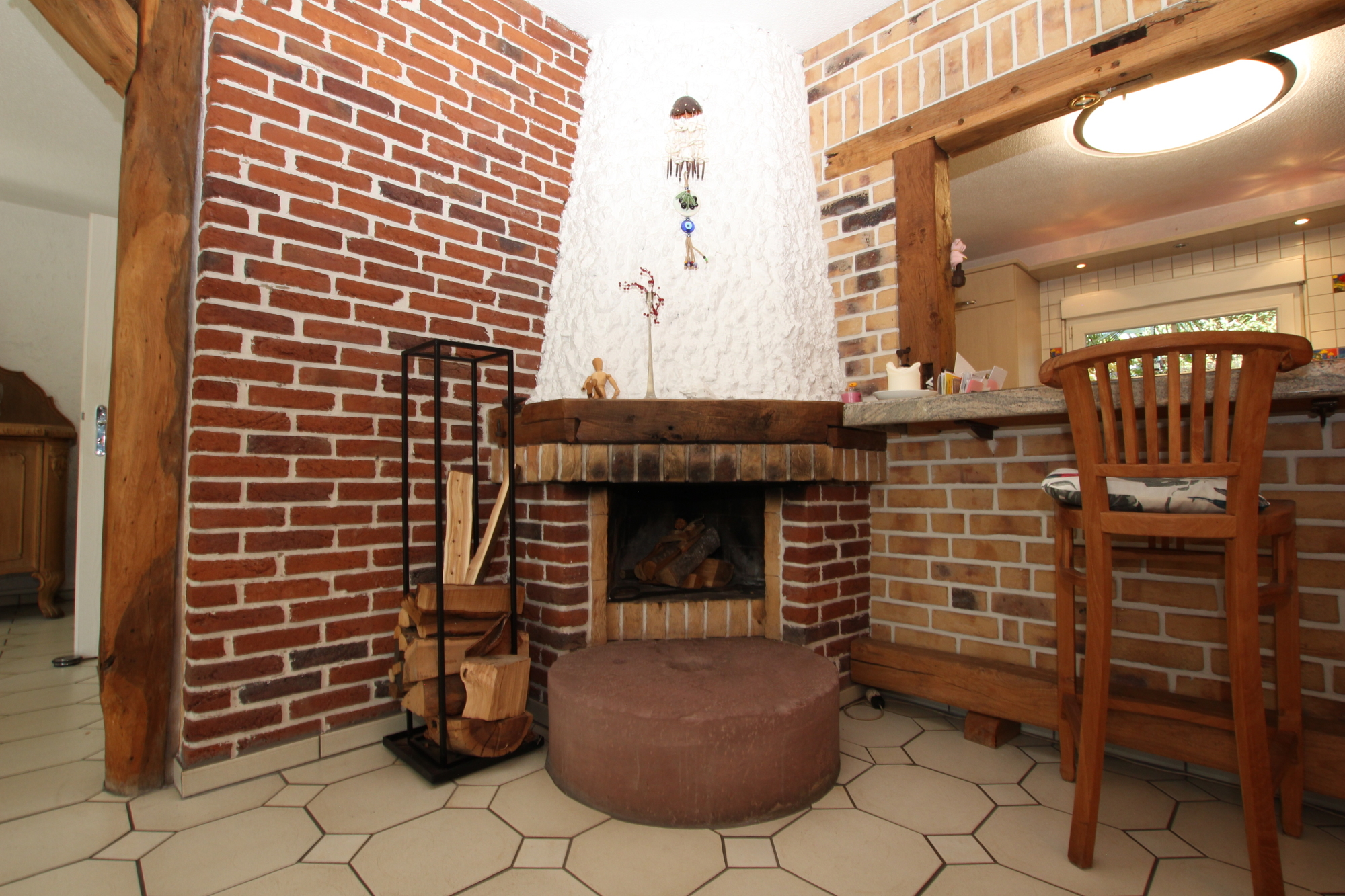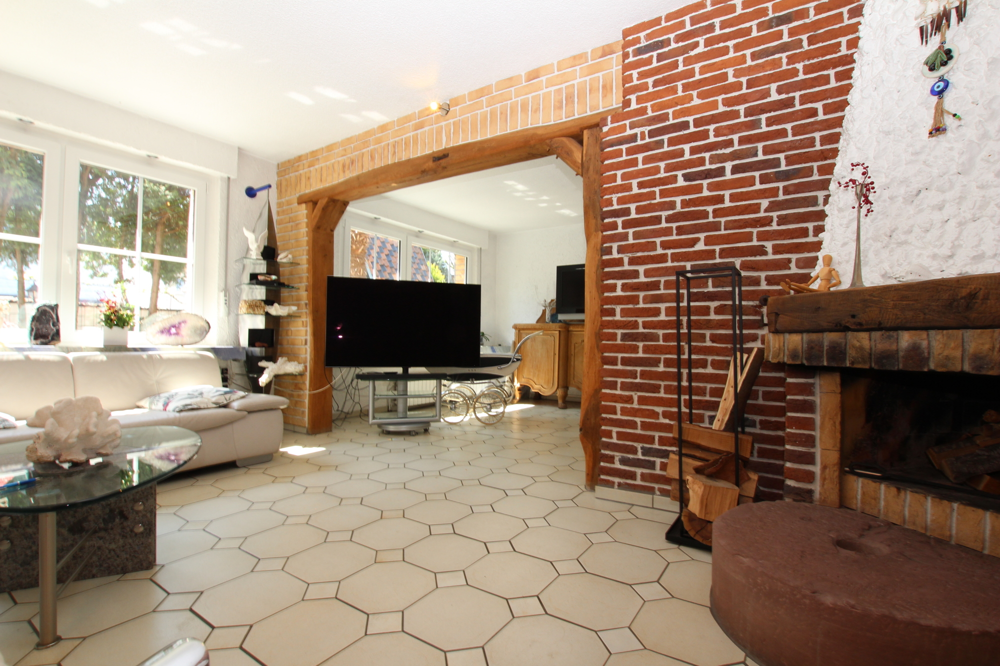 Der Wohnbereich des Hauses besticht durch große Fensterfronten, die für viel Licht sorgen, sowie einen stilvollen Kamin, der eine behagliche Atmosphäre schafft. Die Küche ist mit einer praktischen Durchreiche zum Wohnzimmer ausgestattet und sorgt so für kurze Wege und offene Kommunikation beim kochen. Der angrenzende Essbereich im Wohnzimmer bildet den zentralen Treffpunkt des Hauses.