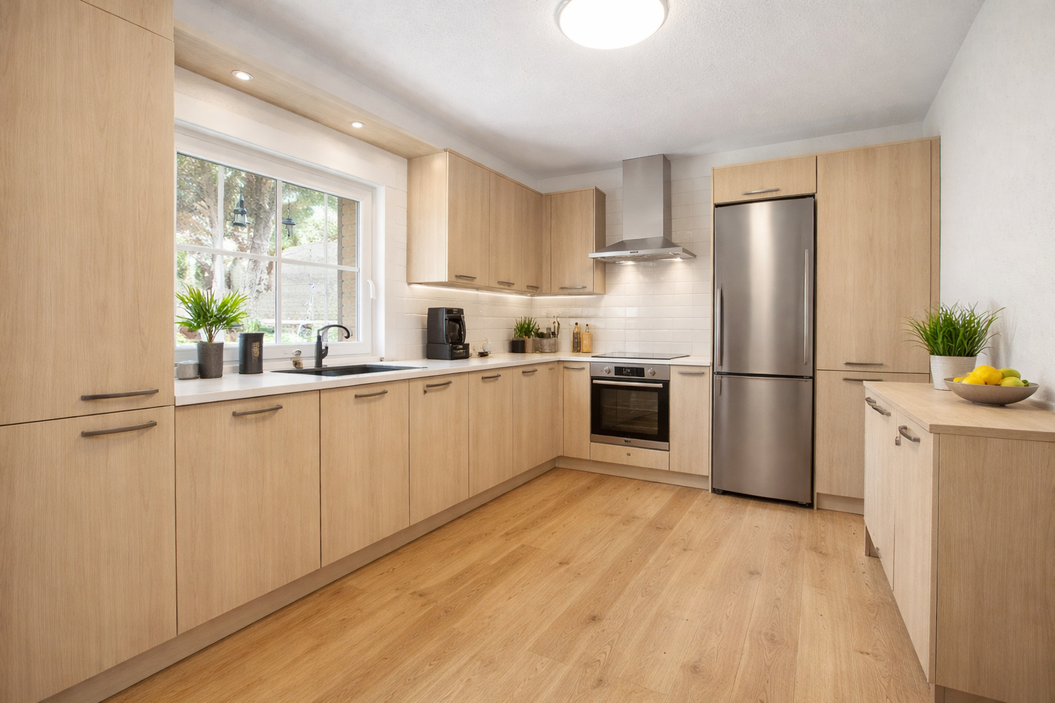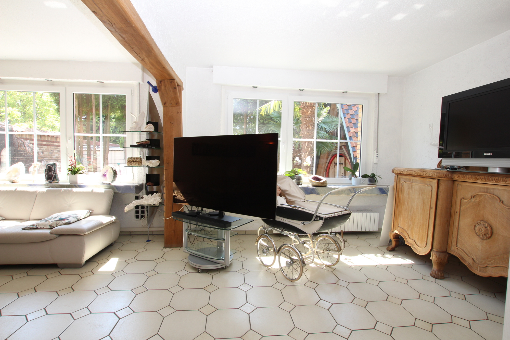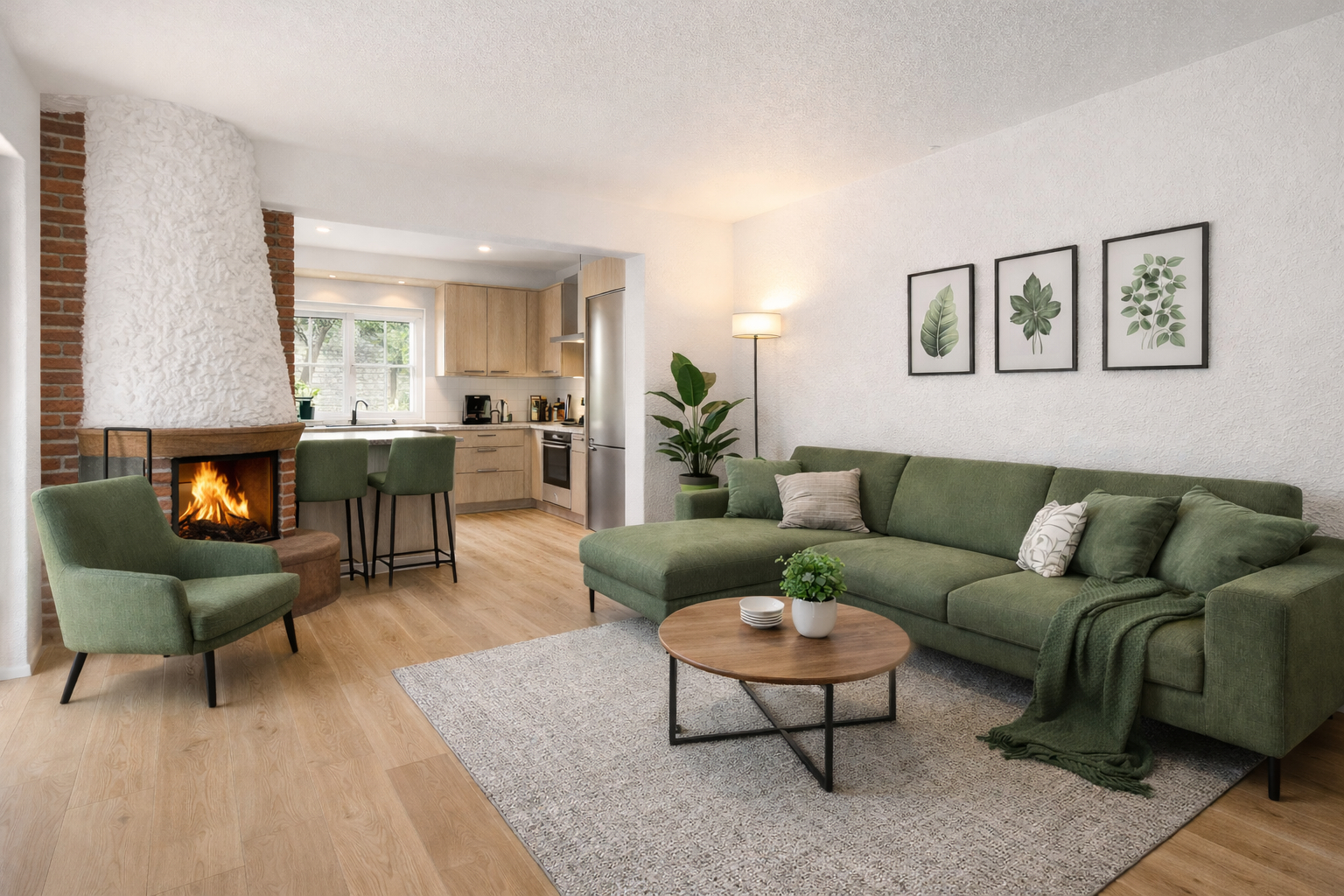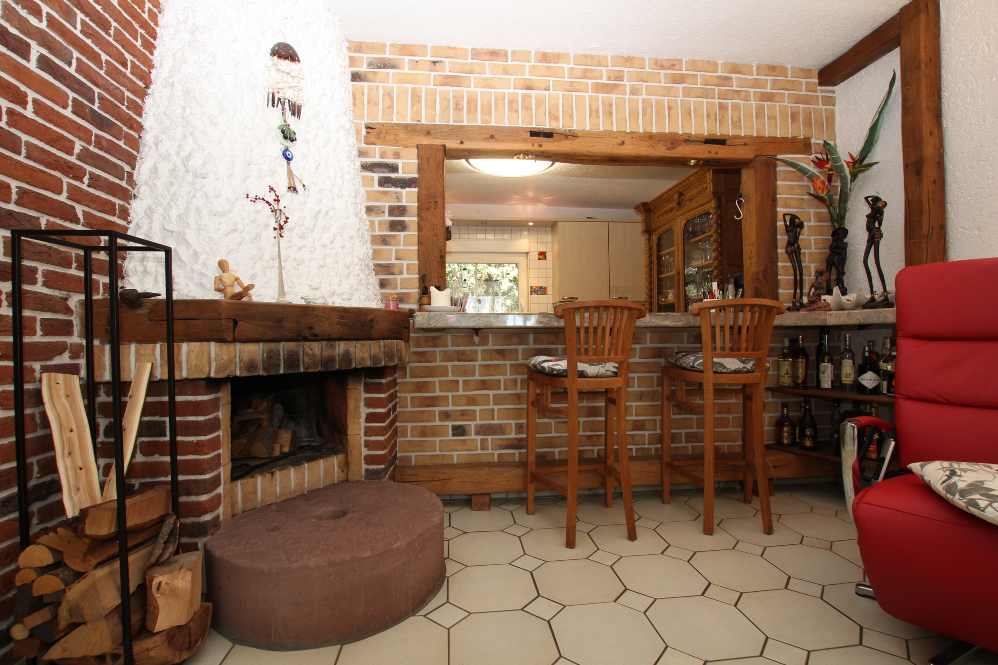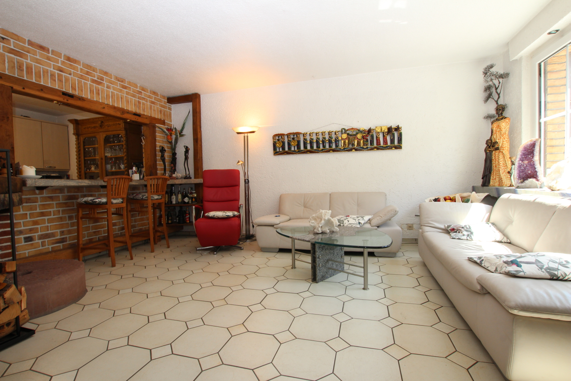 Der Wohnbereich des Hauses besticht durch große Fensterfronten, die für viel Licht sorgen, sowie einen stilvollen Kamin, der eine behagliche Atmosphäre schafft. Die Küche ist mit einer praktischen Durchreiche zum Wohnzimmer ausgestattet und sorgt so für kurze Wege und offene Kommunikation beim kochen. Der angrenzende Essbereich im Wohnzimmer bildet den zentralen Treffpunkt des Hauses.