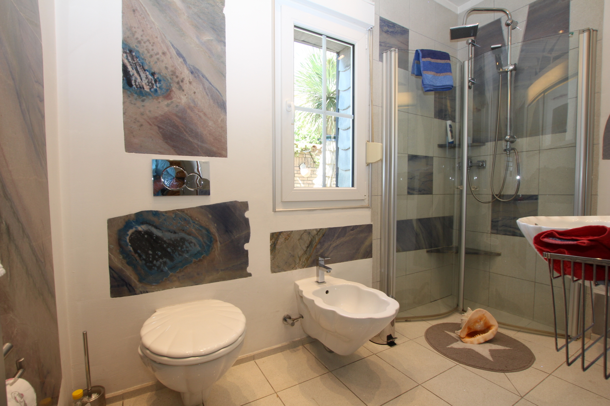Das Badezimmer wurde besonders liebevoll gestaltet. Es verfügt über eine Dusche, ein Bidet, ein Hänge-WC, ein Wachbecken und ein Fenster für Helligkeit und Frischluft.