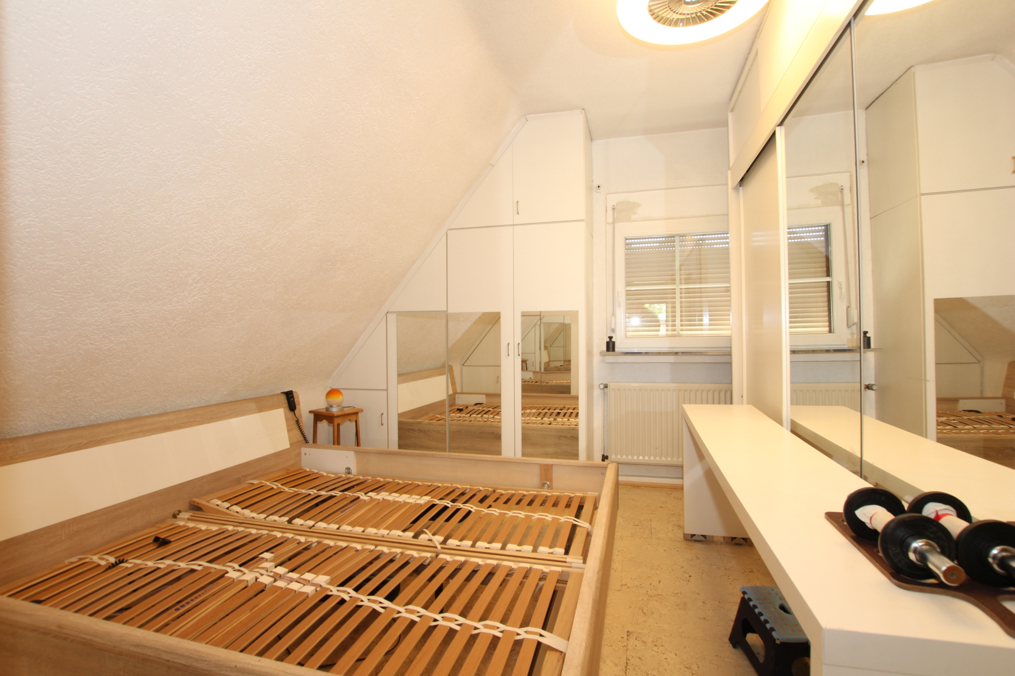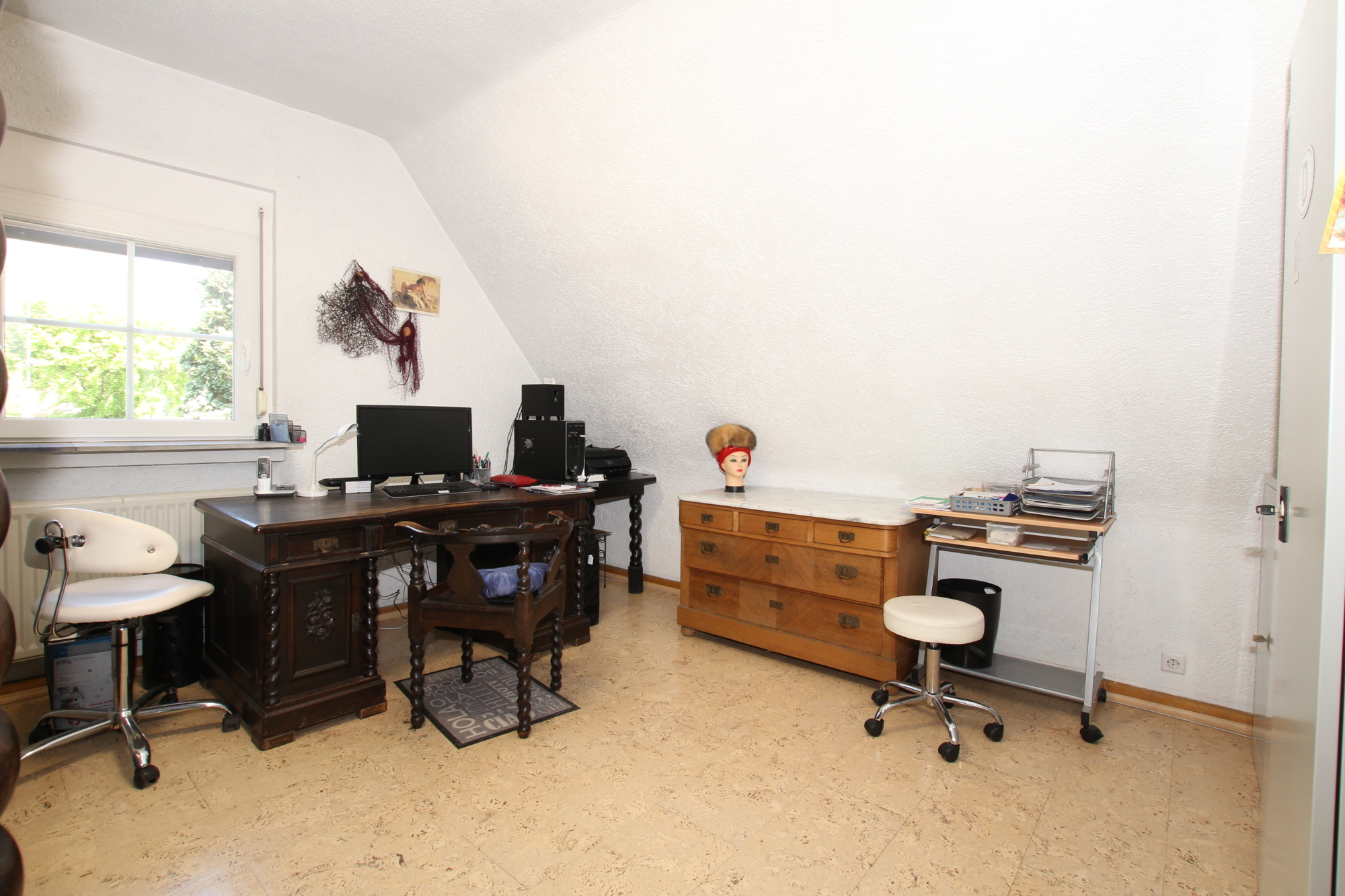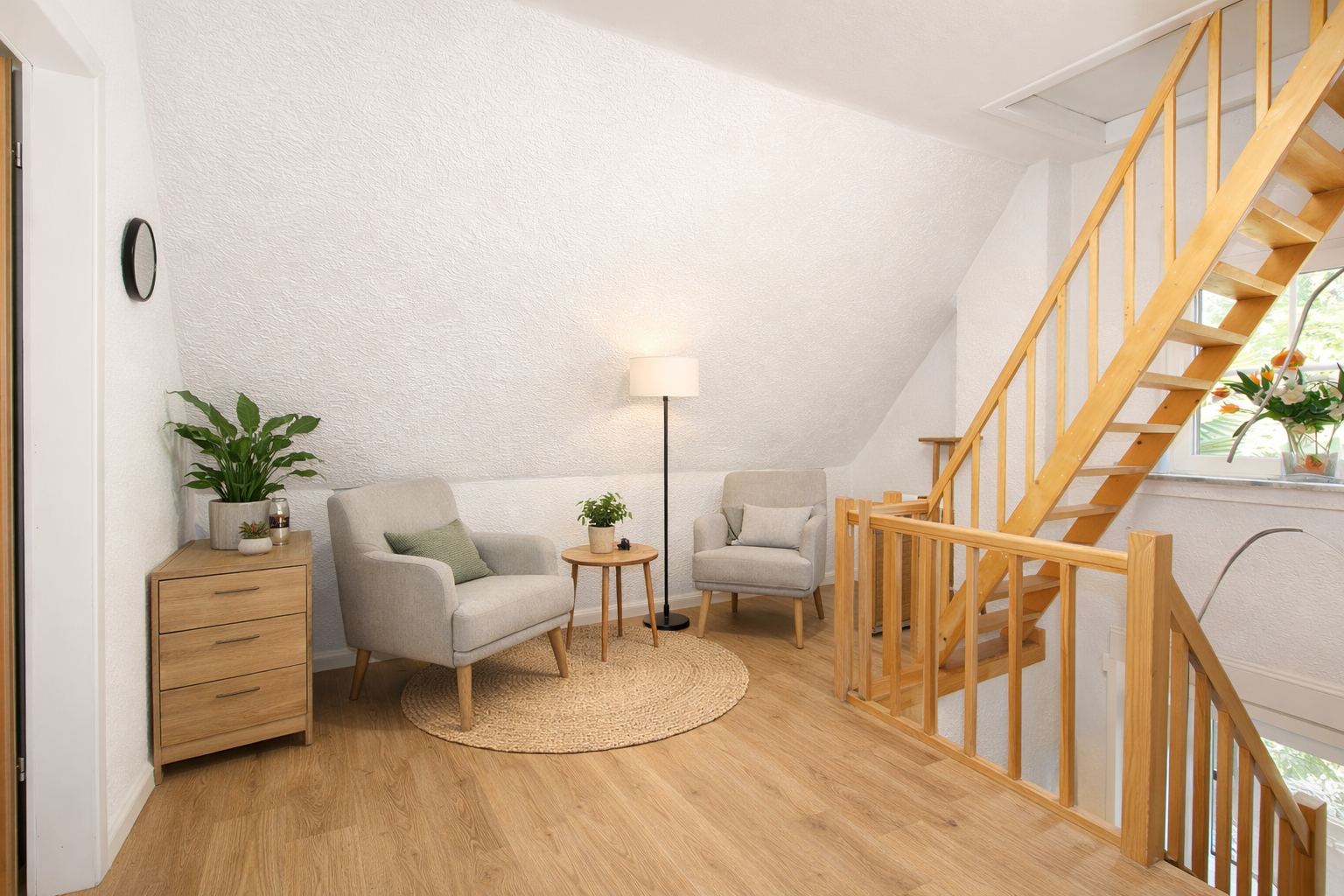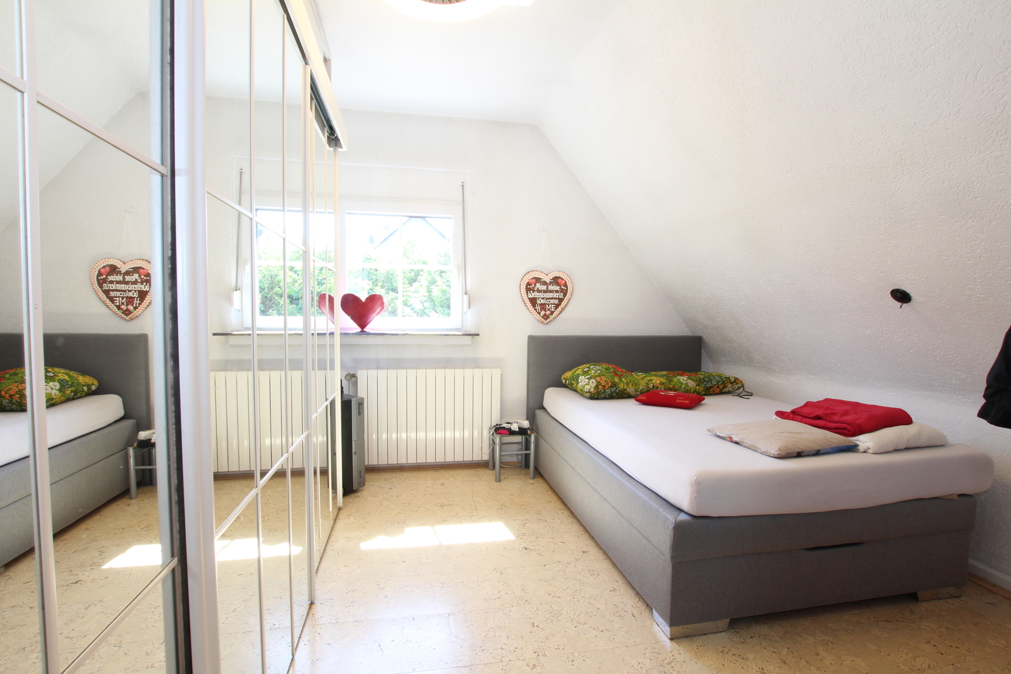 Im Obergeschoss befinden sich das ruhige Schlafzimmer mit genügend Platz für ein großes Doppelbett und einen großzügigen Kleiderschrank. Die Gestaltung ist auf Erholung und Komfort ausgelegt, ein Ort zum Abschalten und Kraft tanken. Ein freundliches Kinderzimmer das sich durch die gute Größe flexibel einrichten lässt, sowie ein helles Büro, welches sich zum Arbeiten im Homeoffice oder als Gästezimmer eignet.