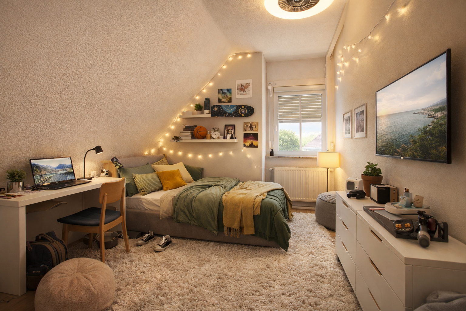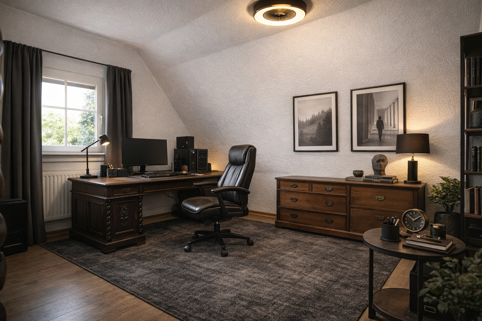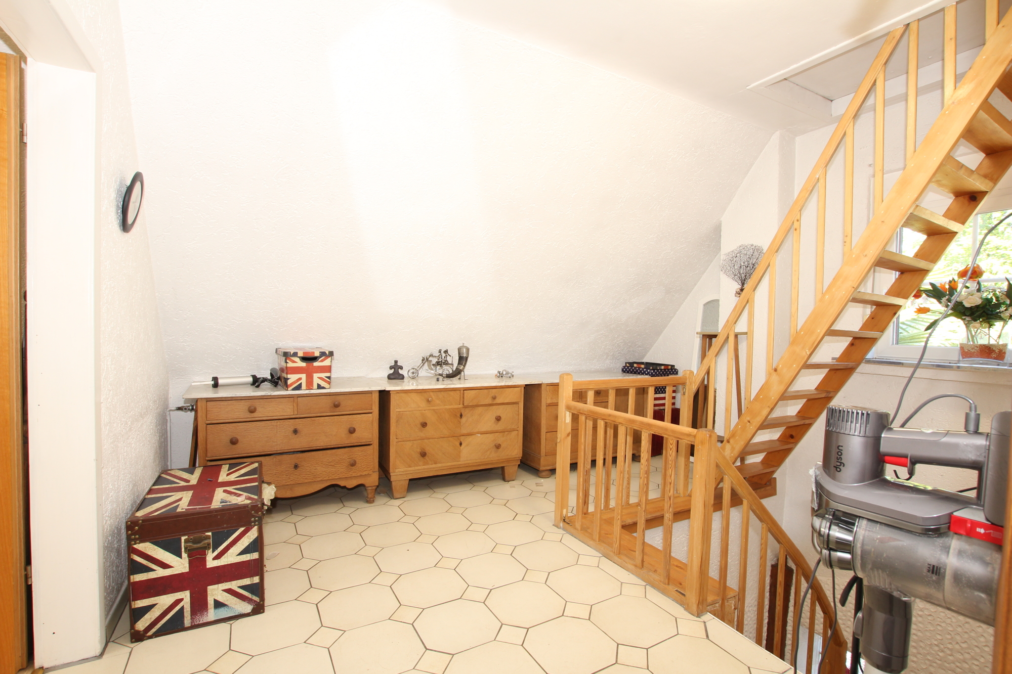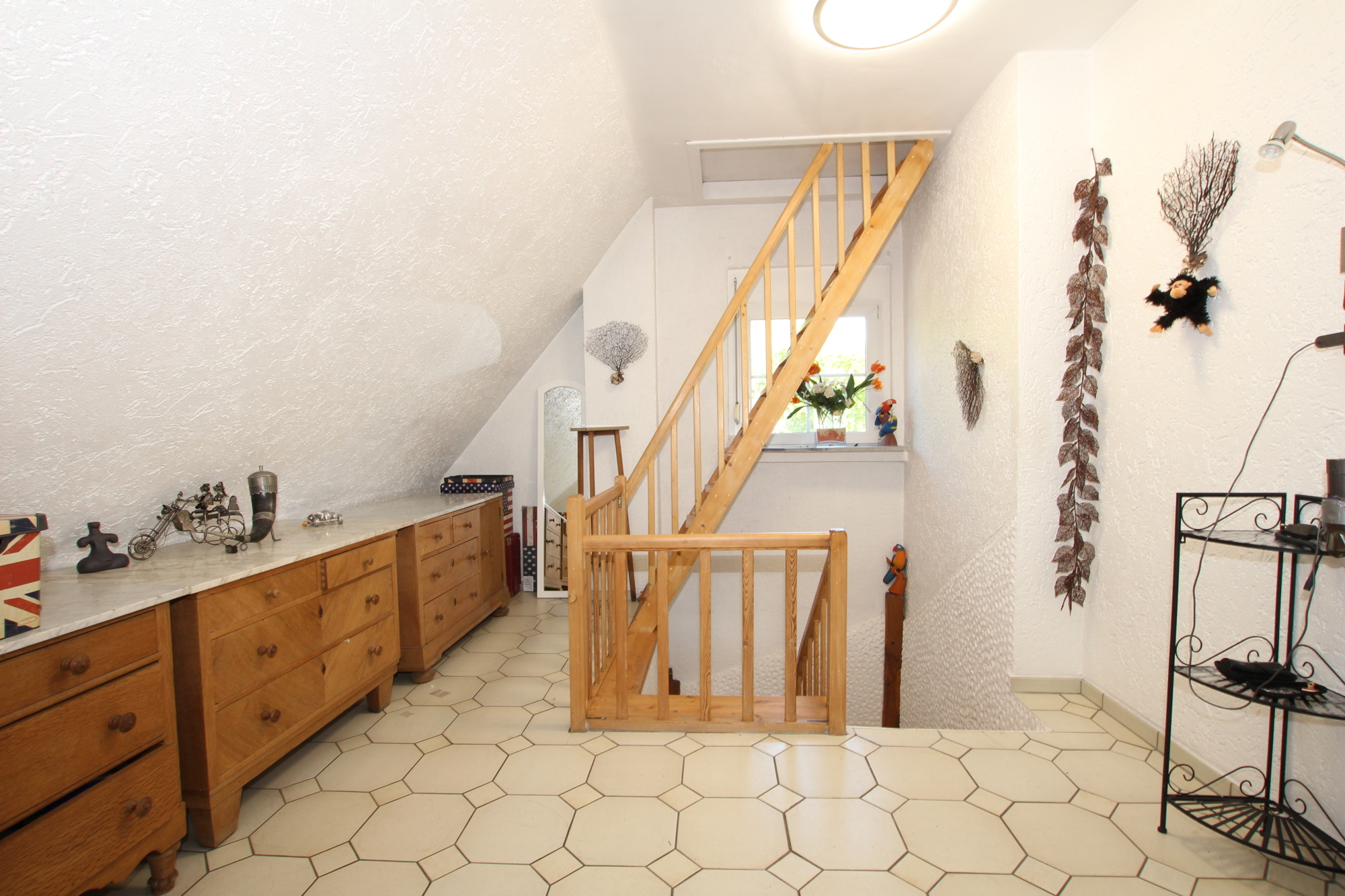 Im Obergeschoss befinden sich das ruhige Schlafzimmer mit genügend Platz für ein großes Doppelbett und einen großzügigen Kleiderschrank. Die Gestaltung ist auf Erholung und Komfort ausgelegt, ein Ort zum Abschalten und Kraft tanken. Ein freundliches Kinderzimmer das sich durch die gute Größe flexibel einrichten lässt, sowie ein helles Büro, welches sich zum Arbeiten im Homeoffice oder als Gästezimmer eignet.