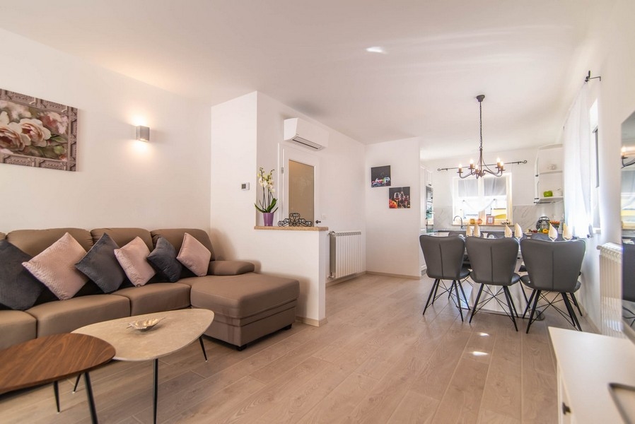 Diese 2021 erbaute, mediterrane Villa befindet sich in der Region Porec, ca. 2.500 Meter vom Zentrum der Stadt und vom Meer entfernt. Die Gesamtwohnfläche dieser Villa beträgt ca. 140 m² und verteilt sich auf zwei Etagen.