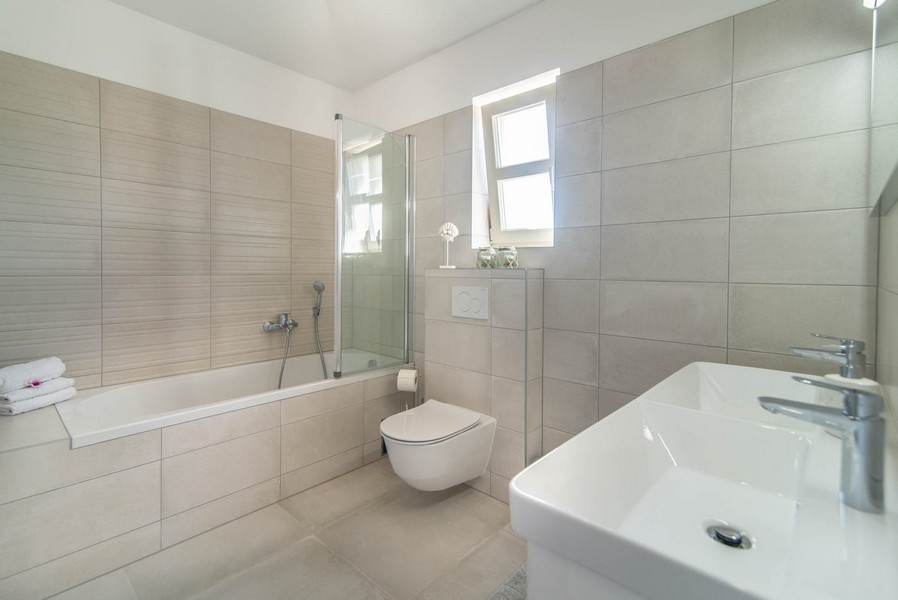 Im Erdgschoss ist ein helles Wohnzimmer mit einer offenen Landhausküche ein Abstellraum, ein Schlafzimmer und ein Badezimmer, sowie ein separates WC verfügbar. Im Obergeschoss sind zwei weitere Schlafräume und zwei Badezimmer verfügbar. Zudem ist im Obergeschoss ein Balkon vorhanden.