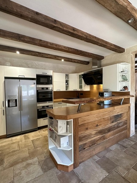 Die Möbel, maßgefertigt aus slawonischem Eichenholz, schaffen eine warme Atmosphäre, während das Chesterfield-Ledersofa einen Hauch von Eleganz beisteuert.