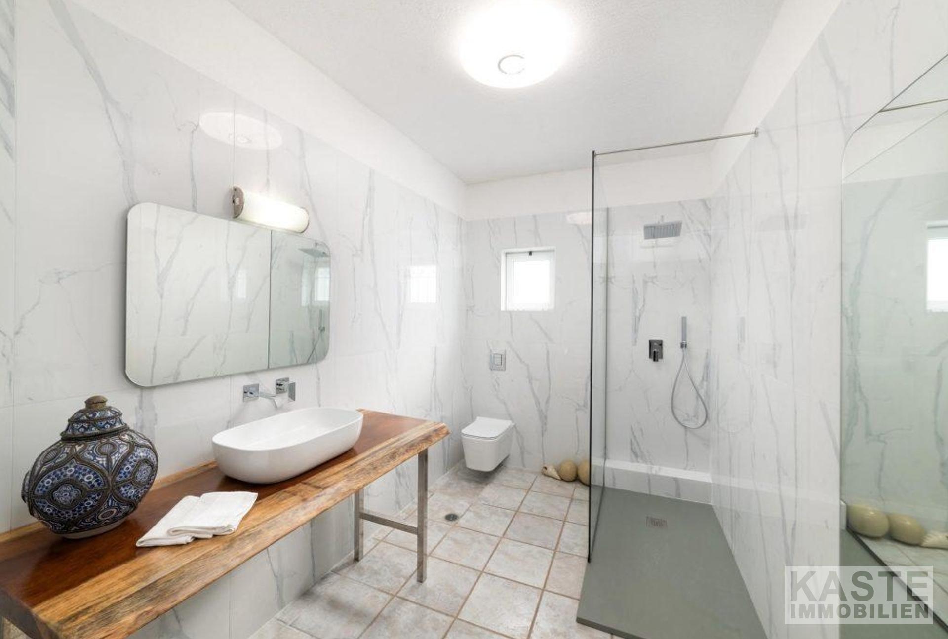 Im unteren Erdgeschoss befindet sich ein eigenständiges Gästeapartment mit eigenem Eingang und Zugang zum Garten und Pool. Bestehend aus einer Küche, einem Ess- und Wohnzimmer, einem Badezimmer mit Dusche sowie zwei Schlafzimmern mit Einbauschränken, bietet das Apartment die Möglichkeit zur Installation von Zentralheizung.