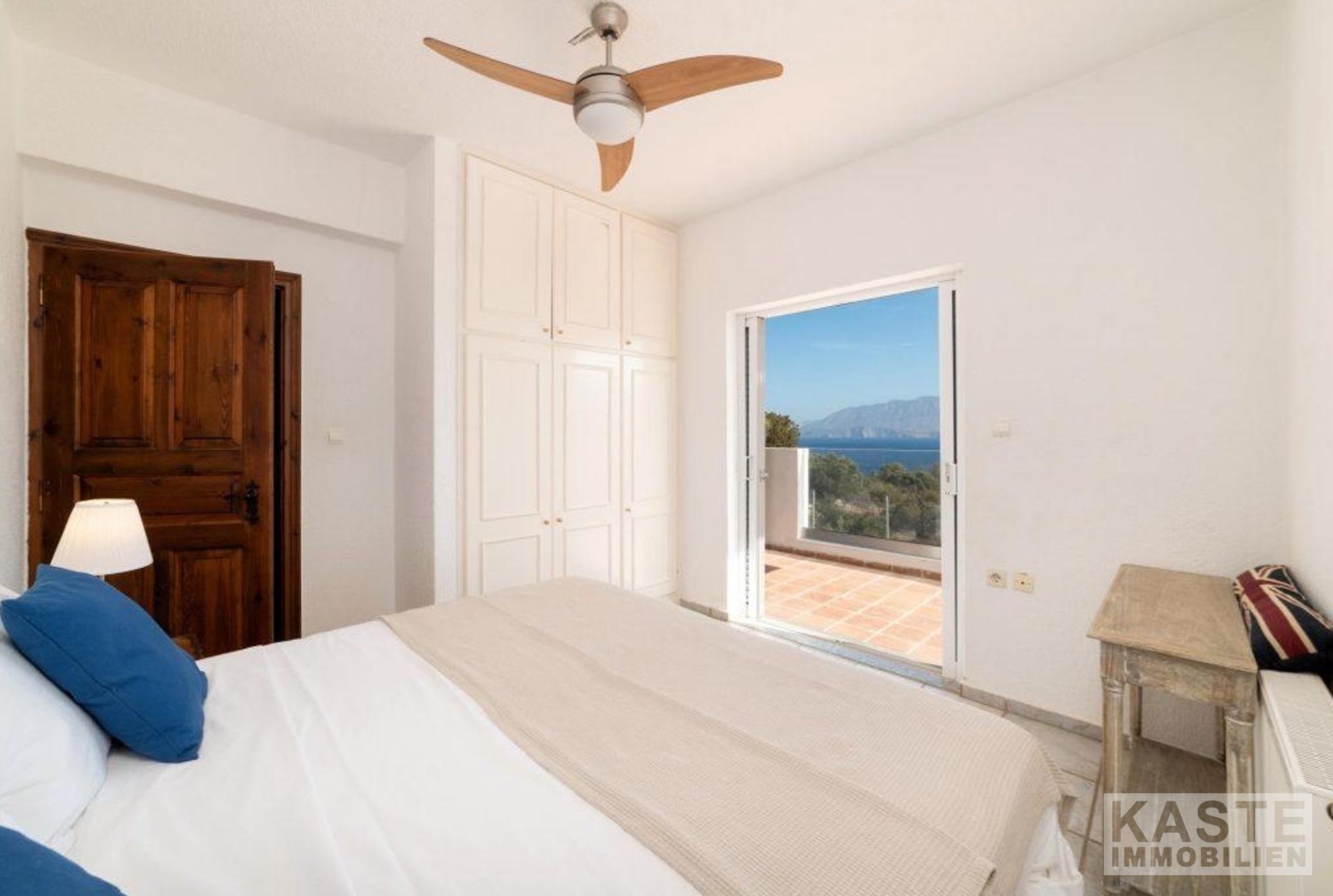 Eine großzügige Wendeltreppe führt zur mittleren Etage (der Eingangsebene) mit einem Empfangszimmer, drei Schlafzimmern und einem modernen Badezimmer mit Dusche, Waschbecken und Toilette. Das Hauptschlafzimmer verfügt über ein eigenes Badezimmer mit begehbarer Dusche, während alle Schlafzimmer Einbauschränke, Deckenventilatoren und eine großflächige Terrasse mit atemberaubendem Blick auf Pool und Meer aufweisen.