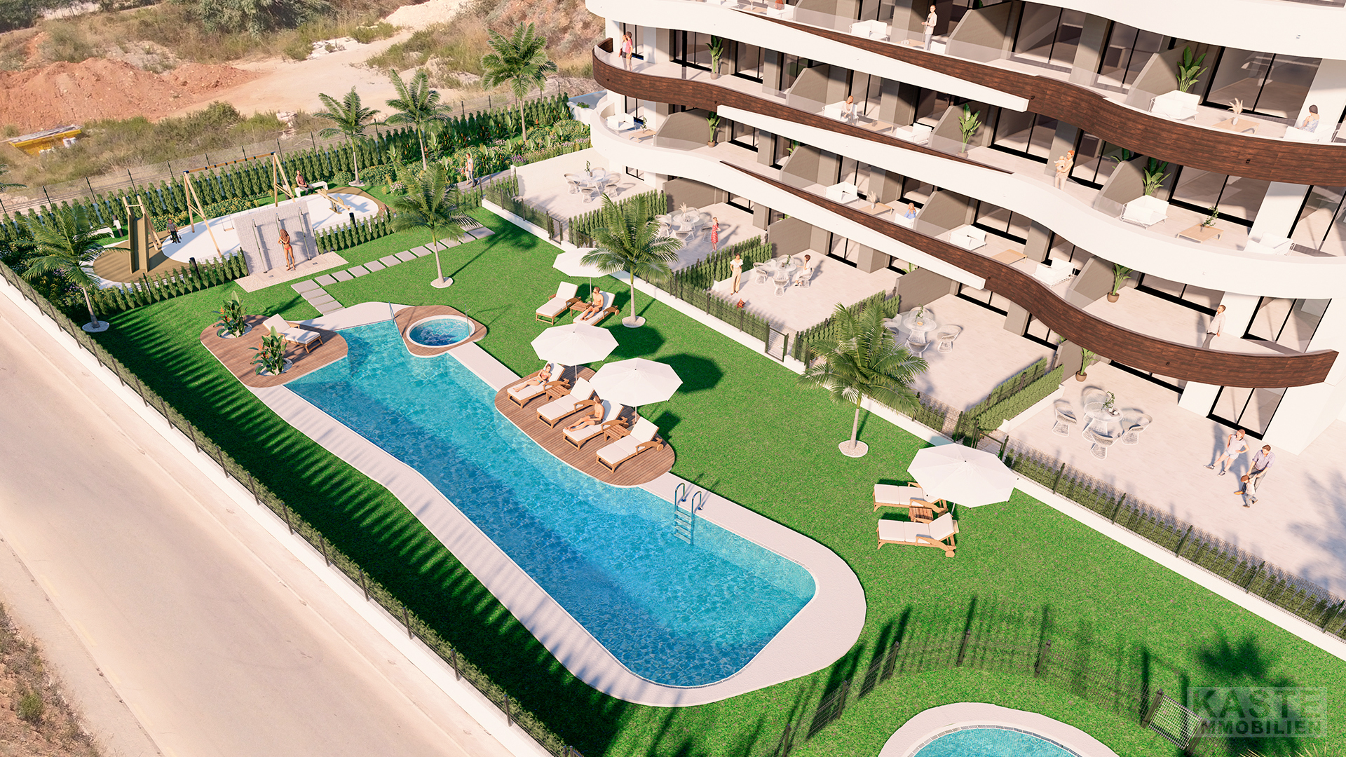 Die Wohnanlage umfasst insgesamt 29 Apartments mit zwei und drei Schlafzimmern sowie zwei Bädern, wobei die Ausstattung je nach Etage variieren kann. Die Erdgeschoss-Apartments verfügen über weitläufige Gärten mit Terrassen von bis zu 114 Quadratmetern und bieten direkten Zugang zu den Gemeinschaftsbereichen. In den mittleren Etagen erwarten Sie großzügige Terrassen, während die Penthäuser mit halbüberdachten Terrassen inklusive Pergola, einem vorinstallierten Whirlpool und einer Sonnenterrasse mit Grill ausgestattet sind – perfekte Außenbereiche für Familienfeiern oder Treffen mit Freunden.
