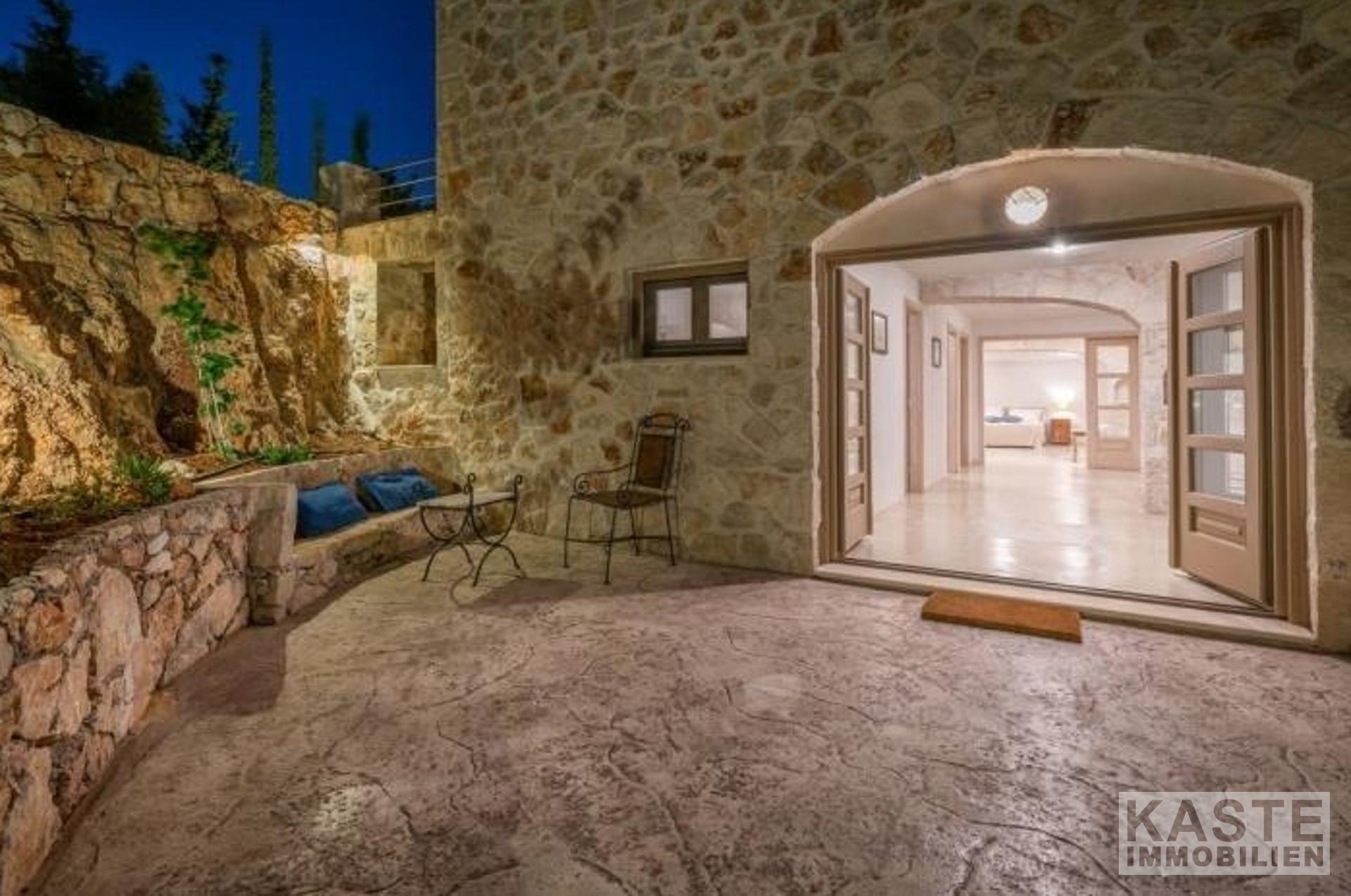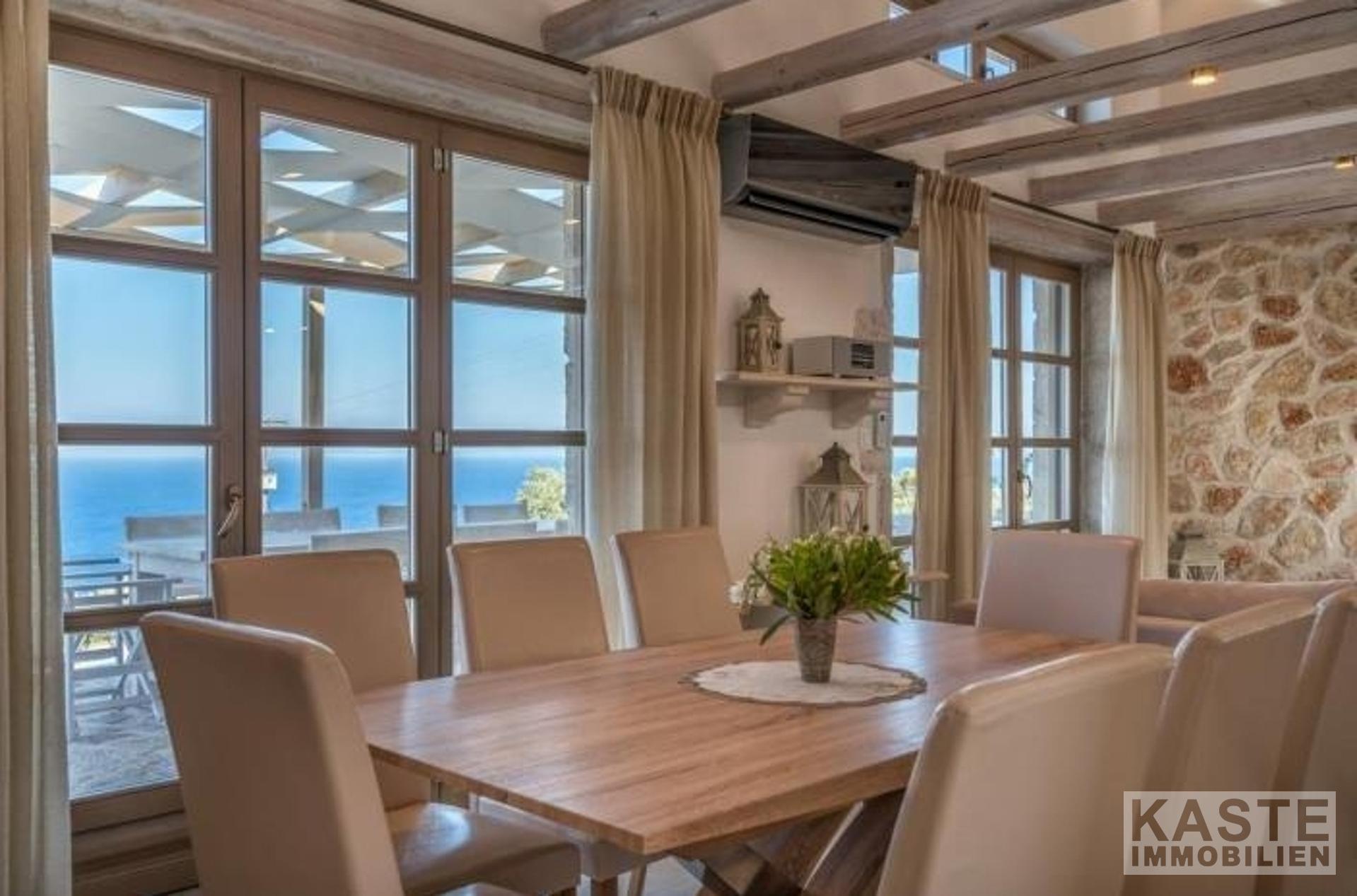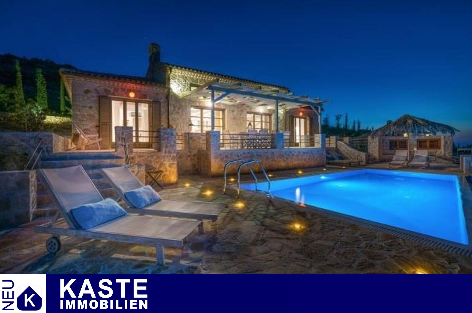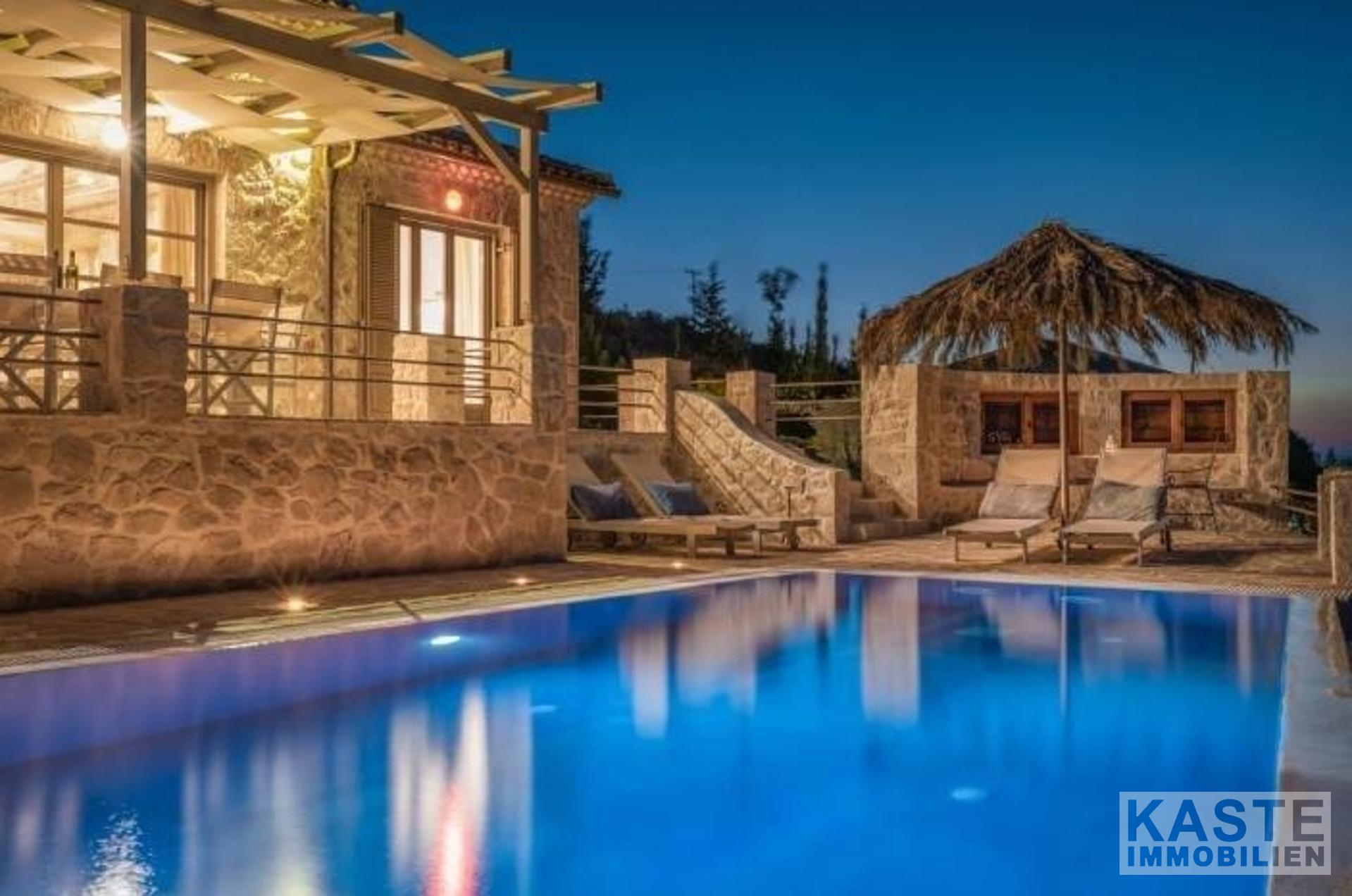 Diese luxuriöse, voll klimatisierte Villa mit 4 Schlafzimmern ist 200 qm groß und kann bis zu 10 Gäste beherbergen. Sie verfügt über einen eigenen Pool mit Hydromassage, ein exklusives Hammam und einen direkten Zugang zum Meer. Im Erdgeschoss befindet sich eine große, voll ausgestattete offene Küche mit Wohn-/Essbereich. Zwei weitreichende, quadratische, getäfelte Türen lassen das tiefe Blau des Ionischen Meeres und die Aussicht auf Kefalonia im Hintergrund erstrahlen. Eine schöne Holzbalkendecke bewahrt den authentischen Stil und kombiniert ihn mit einem modernen Touch im Inneren. Auf dieser Ebene befinden sich auch zwei große Doppel-/Zweibettzimmer, die beide über ein eigenes Duschbad verfügen. Von beiden Schlafzimmern aus gelangen Sie direkt in den Hydro-Massage-Poolbereich, der mit Liegen und Sonnenschirmen ausgestattet ist. Unter der überdachten Veranda befindet sich ein eleganter Essbereich, der an warmen Sommerabenden zum Essen im Freien einlädt. Wenn Sie die Innentreppe hinuntergehen, gelangen Sie in den Fitnessbereich. Angrenzend an den Fitnessraum befindet sich das Hammam/Dampfbad mit Dusche und Toilette. Auf der unteren Ebene befinden sich zwei weitere Schlafzimmer, ein sehr großes Familienzimmer mit Sitzgelegenheit und Ankleidebereich und ein weiteres Schlafzimmer mit Doppelbett. Große Massivholztüren führen auf die untere Terrasse und grenzen an den Weinkeller. Eine Treppe führt hinauf zum Poolbereich, wo Sie den Tag mit den Klängen der Natur ausklingen lassen können. Die Villa steht auf einem ca. 6500 qm großen Grundstück, von dem 5000 qm ein herrlicher Weinberg sind, der nicht nur beeindruckend aussieht, sondern Sie haben auch die Möglichkeit, Ihren eigenen Wein zu produzieren. Die nördliche Region von Zakynthos ist bekannt für ihre natürliche Schönheit und ist der ideale Ort für diese hochwertige Villa.