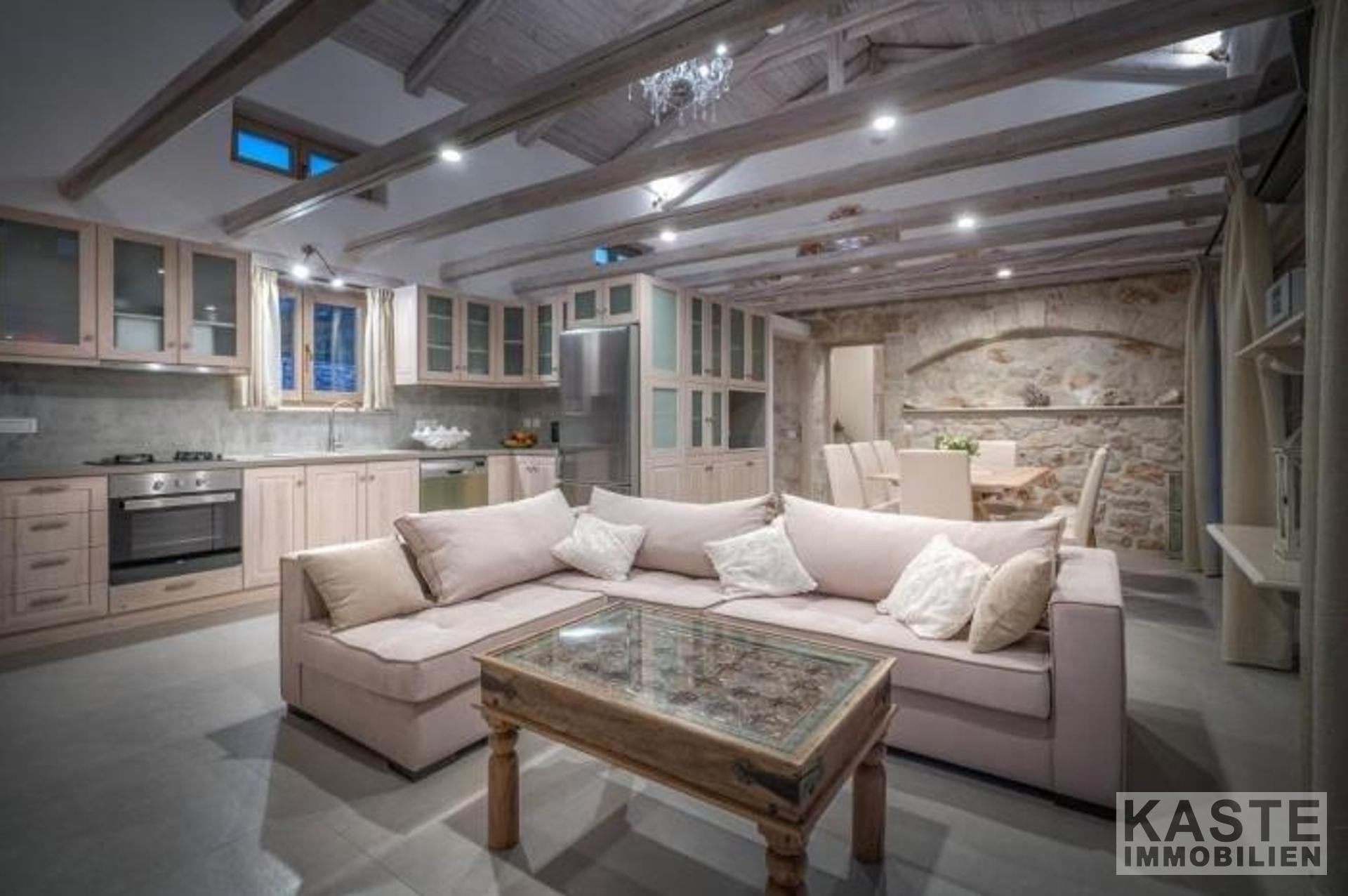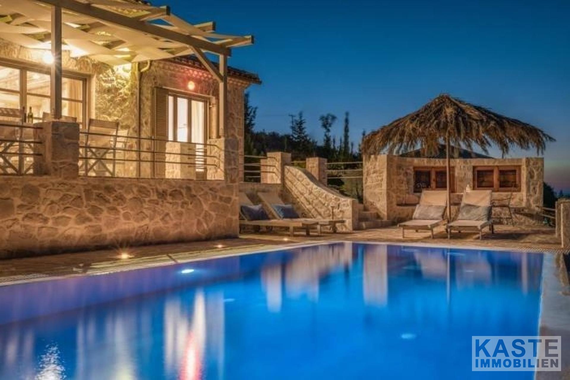 Diese luxuriöse, voll klimatisierte Villa mit 4 Schlafzimmern ist 200 qm groß und kann bis zu 10 Gäste beherbergen. Sie verfügt über einen eigenen Pool mit Hydromassage, ein exklusives Hammam und einen direkten Zugang zum Meer. Im Erdgeschoss befindet sich eine große, voll ausgestattete offene Küche mit Wohn-/Essbereich. Zwei weitreichende, quadratische, getäfelte Türen lassen das tiefe Blau des Ionischen Meeres und die Aussicht auf Kefalonia im Hintergrund erstrahlen. Eine schöne Holzbalkendecke bewahrt den authentischen Stil und kombiniert ihn mit einem modernen Touch im Inneren. Auf dieser Ebene befinden sich auch zwei große Doppel-/Zweibettzimmer, die beide über ein eigenes Duschbad verfügen. Von beiden Schlafzimmern aus gelangen Sie direkt in den Hydro-Massage-Poolbereich, der mit Liegen und Sonnenschirmen ausgestattet ist. Unter der überdachten Veranda befindet sich ein eleganter Essbereich, der an warmen Sommerabenden zum Essen im Freien einlädt. Wenn Sie die Innentreppe hinuntergehen, gelangen Sie in den Fitnessbereich. Angrenzend an den Fitnessraum befindet sich das Hammam/Dampfbad mit Dusche und Toilette. Auf der unteren Ebene befinden sich zwei weitere Schlafzimmer, ein sehr großes Familienzimmer mit Sitzgelegenheit und Ankleidebereich und ein weiteres Schlafzimmer mit Doppelbett. Große Massivholztüren führen auf die untere Terrasse und grenzen an den Weinkeller. Eine Treppe führt hinauf zum Poolbereich, wo Sie den Tag mit den Klängen der Natur ausklingen lassen können. Die Villa steht auf einem ca. 6500 qm großen Grundstück, von dem 5000 qm ein herrlicher Weinberg sind, der nicht nur beeindruckend aussieht, sondern Sie haben auch die Möglichkeit, Ihren eigenen Wein zu produzieren. Die nördliche Region von Zakynthos ist bekannt für ihre natürliche Schönheit und ist der ideale Ort für diese hochwertige Villa.