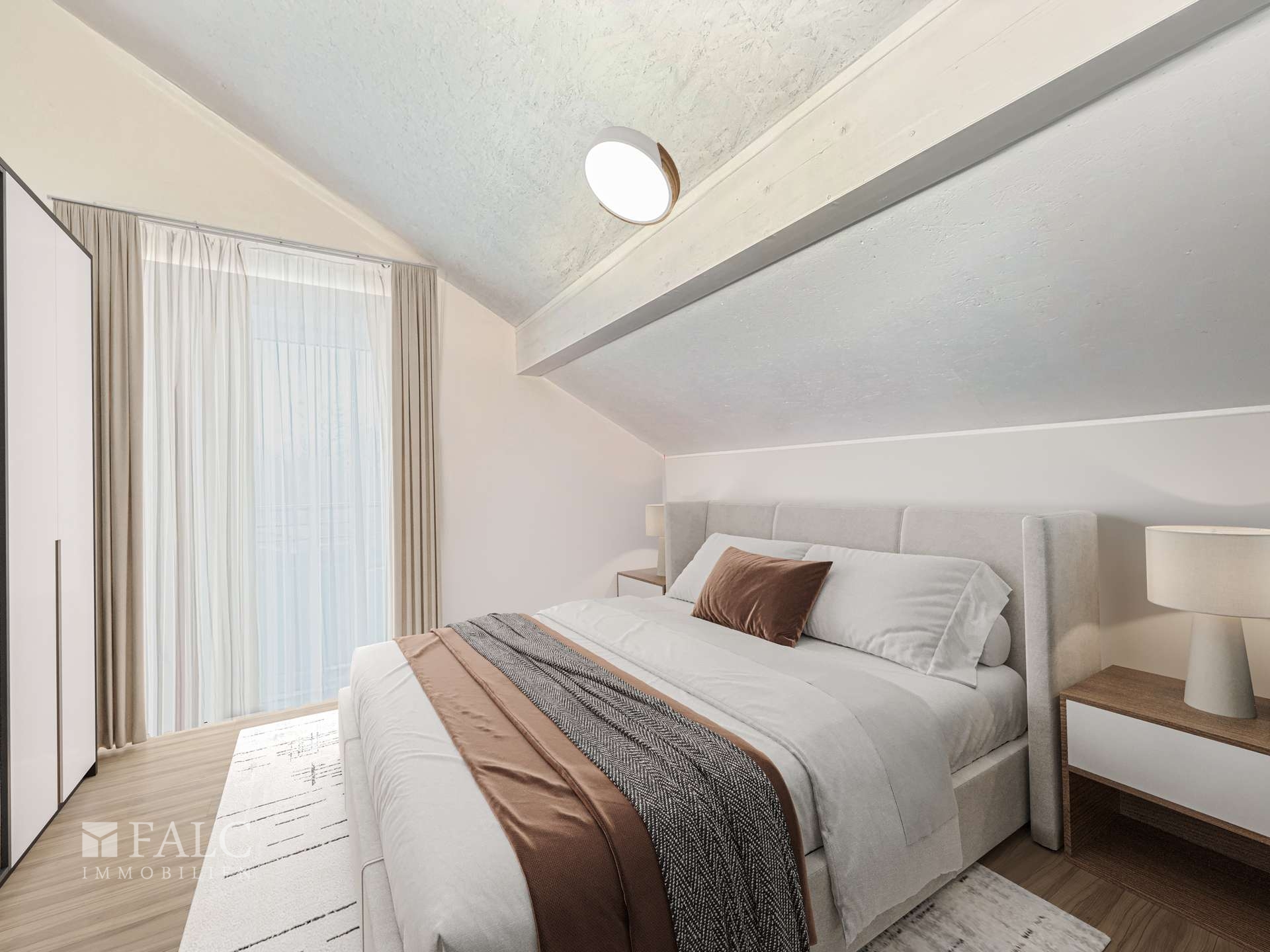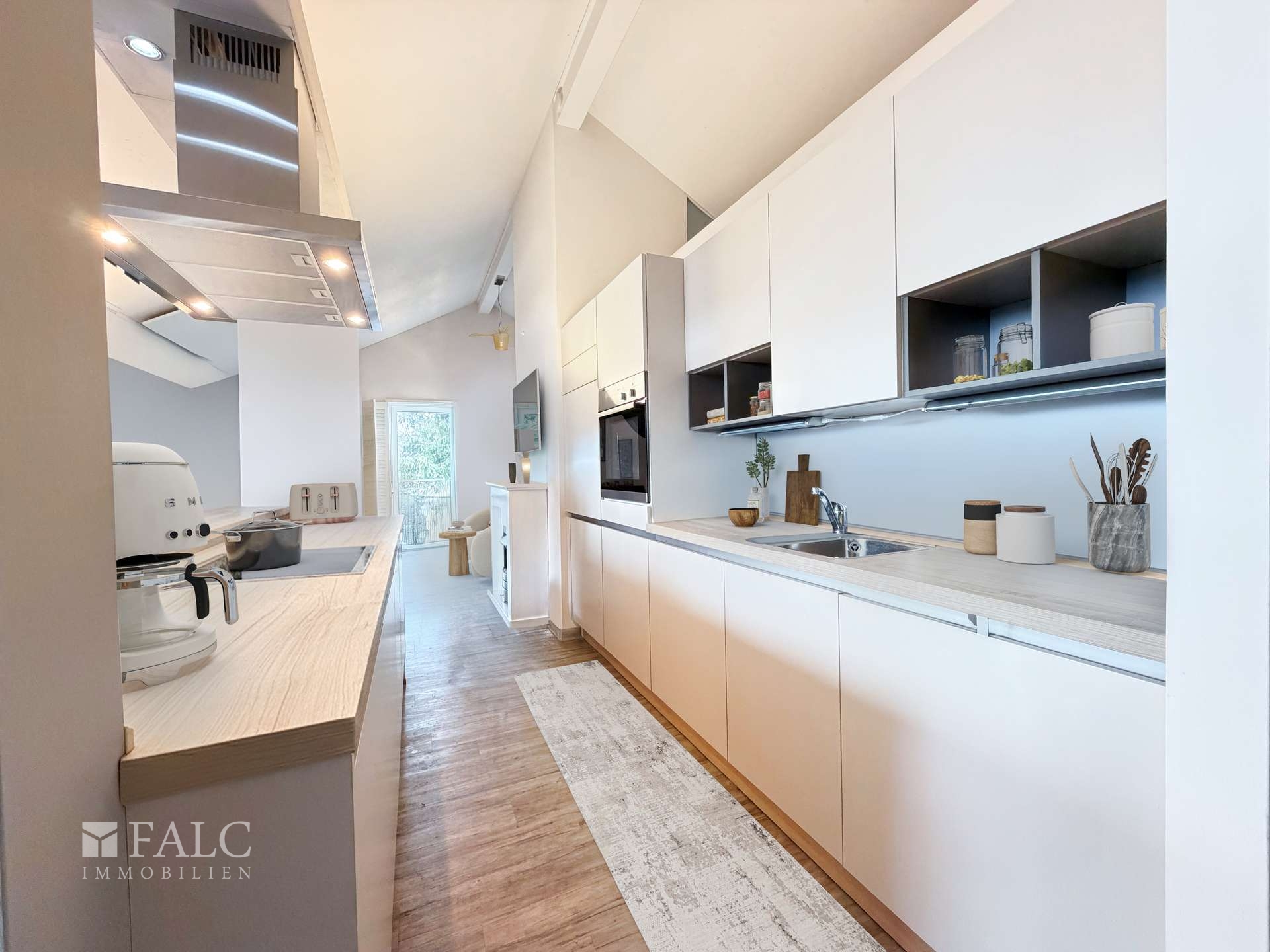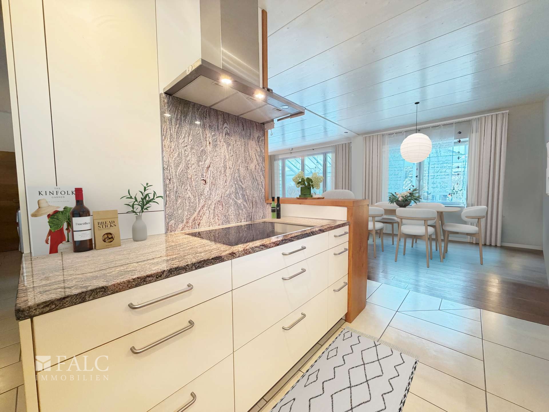 Im Obergeschoss setzt sich das Wohnkonzept mit einer weiteren Küche, ergänzt um einen Wohnbereich, ein Schlafzimmer und ein Badezimmer fort, was die derzeitige Nutzung als Einliegerwohnung nachvollziehbar macht und zugleich flexible Perspektiven eröffnet. Der Wohn und Essbereich wirkt durch die Fensterflächen offen und freundlich und lässt sich je nach Bedarf als gemeinsamer Mittelpunkt oder als eigenständige Einheit nutzen. Zwei Balkone schaffen zusätzliche Außenbereiche auf dieser Etage und bieten Raum für eine kurze Auszeit oder den Tagesausklang. Auch hier bleibt die Gestaltung angenehm fließend, sodass Kochen, Essen, Wohnen und Schlafen in einem stimmigen Zusammenhang stehen. Ein Badezimmer mit extra WC ergänzt diese Ebene und unterstützt die klare Trennung zwischen gemeinschaftlichen Wohnzonen und Rückzugsräumen.