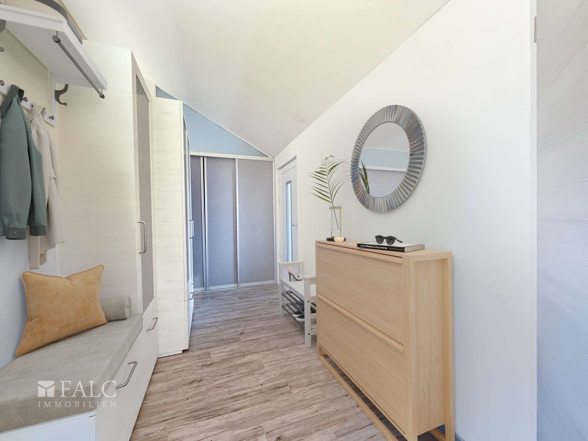 Im Erdgeschoss empfängt Sie ein klar strukturierter Eingangsbereich, von dem aus sich die Räume logisch erschließen und der Wohnfluss sofort spürbar wird. Auf dieser Ebene finden Sie neben dem Wohn- und Essbereich auch ein separates Büro, ein Schlafzimmer sowie ein Badezimmer, sodass sich Wohnen und Rückzug hier sehr gut kombinieren lassen. Ein Gäste WC ergänzt das Raumprogramm alltagstauglich, gerade wenn Besuch im Haus ist oder mehrere Personen gleichzeitig unterwegs sind. Der beheizbare Wintergarten erweitert den Wohnbereich, um einen hellen, geschützten Übergang nach draußen und verbindet das Innenleben des Hauses mit dem Garten.