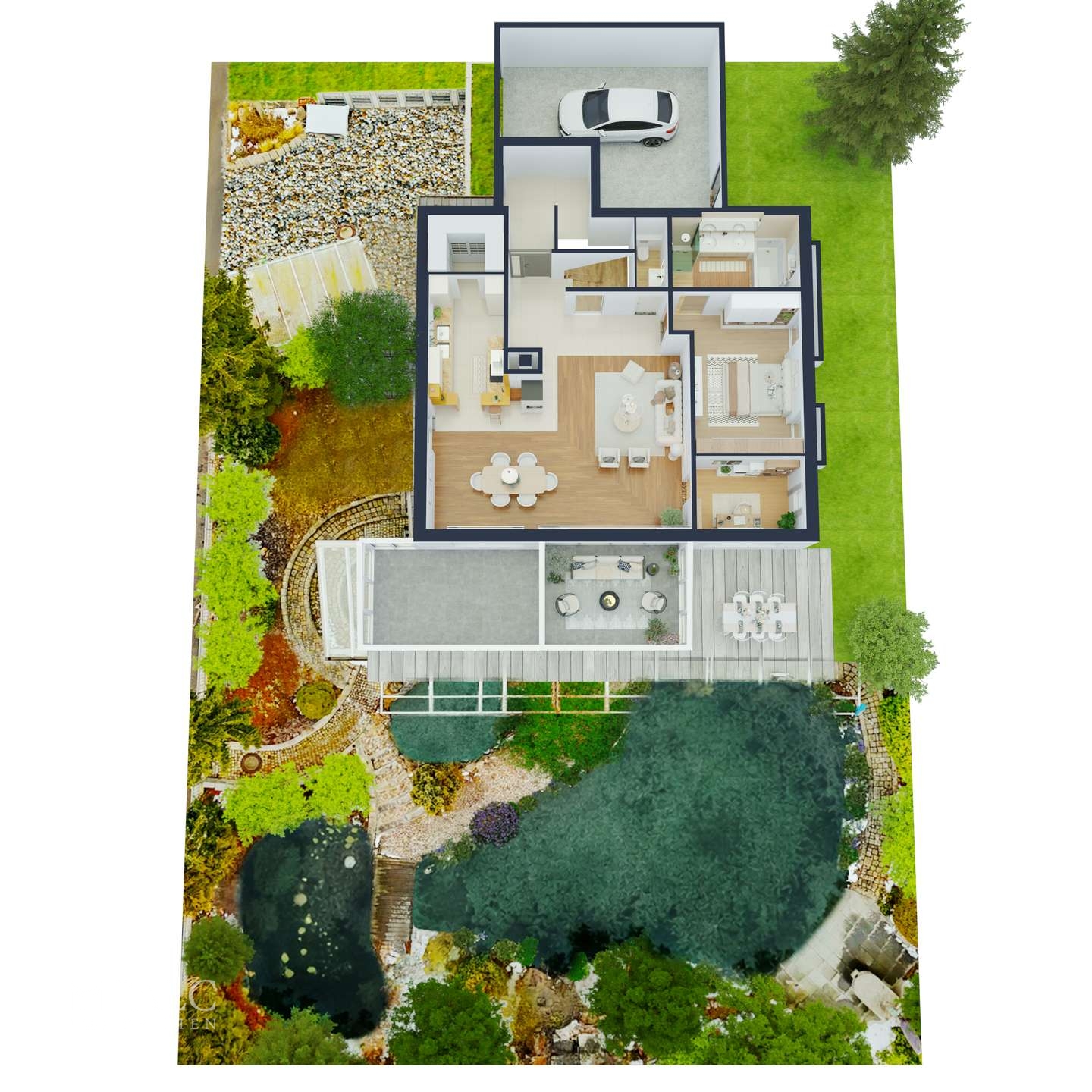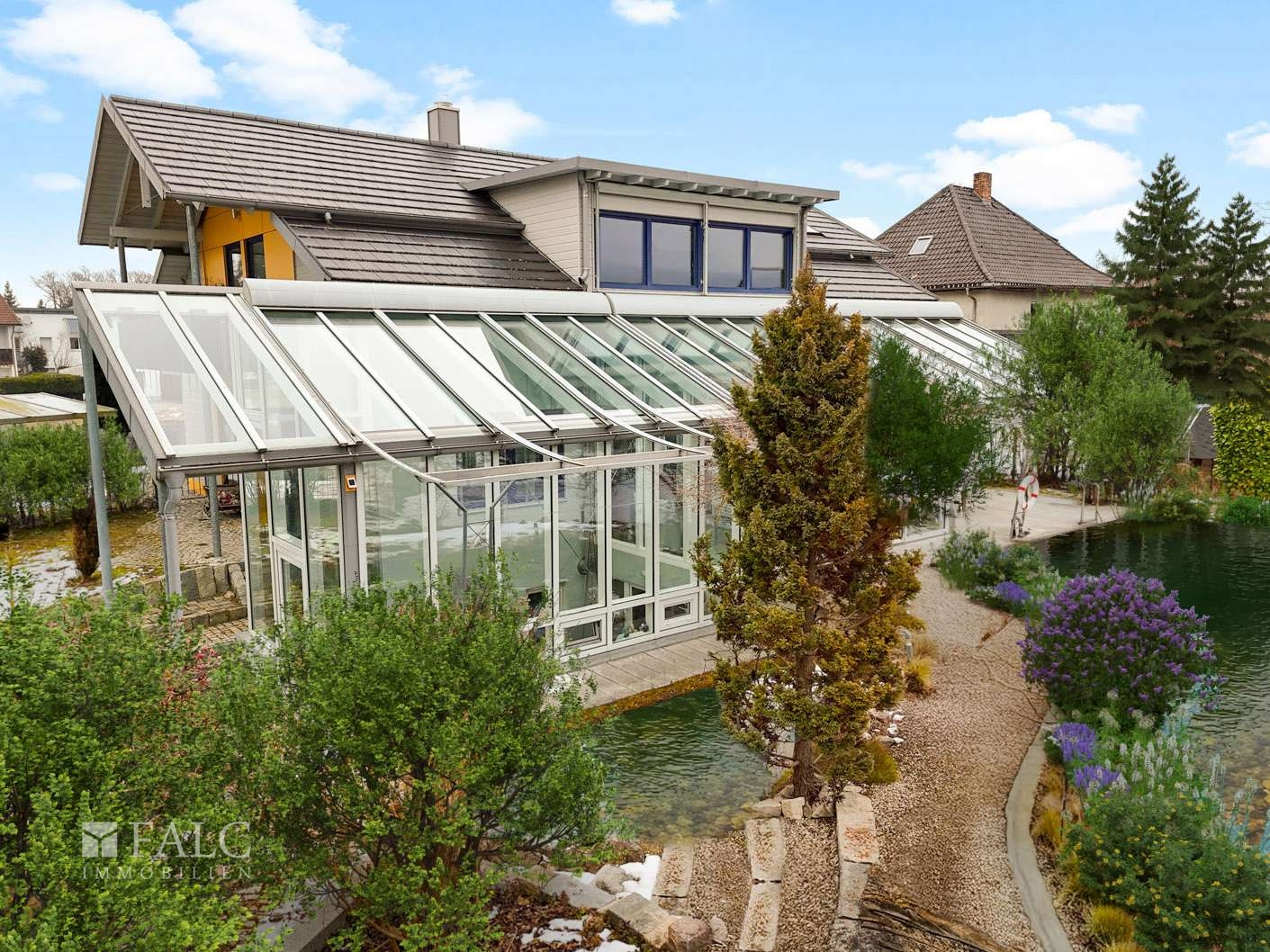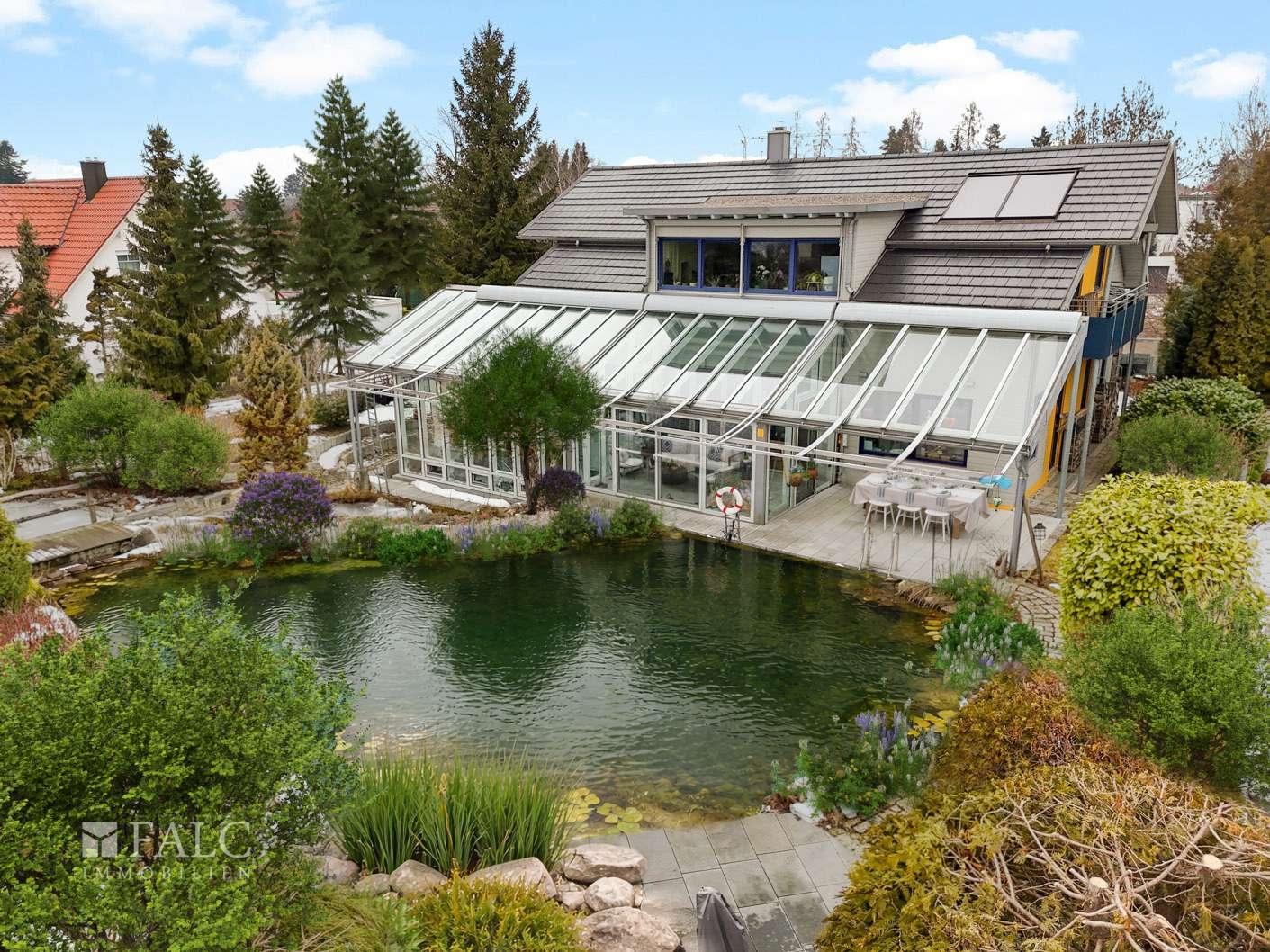 Abgerundet wird das Gesamtbild durch die überdachte Terrasse im Erdgeschoss mit Schwimmteich und den eingewachsenen Garten, die dem Haus eine ruhige, private Außenqualität geben.