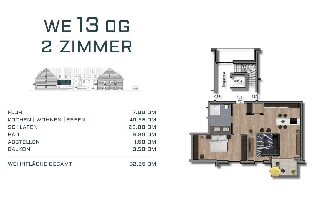 2 Zimmer, 82m² Wohnfläche – Barrierefrei Großer Sonnenbalkon Badezimmer Fußbodenheizung mit Einzelraumregelung Bodenbelag: Parkett, Feinsteinzeugfliesen in den Bädern (Farbe nach Wahl) Elektrische Rollläden Fahrstuhl – von der Tiefgarage bis zur Wohnung barrierefrei Tiefgaragenstellplatz mit Handsensor (25.000 € pro Stellplatz) Kellerraum Gehobene Massivbauweise und aufwendige Fassadengestaltung Videogegensprechanlage Wasch- und Trockenraum Fahrradstellplätze Kabel und Sat Fenster: Dreifachverglast, Sicherheitskonzept durch Pilzzapfenverriegelung, RC2 Beschläge Luftwärmepumpe mit Photovoltaik Anlage KfW 55 Standard (Die genaue Ausstattung entnehmen Sie bitte der Bau- und Ausstattungsbeschreibung)